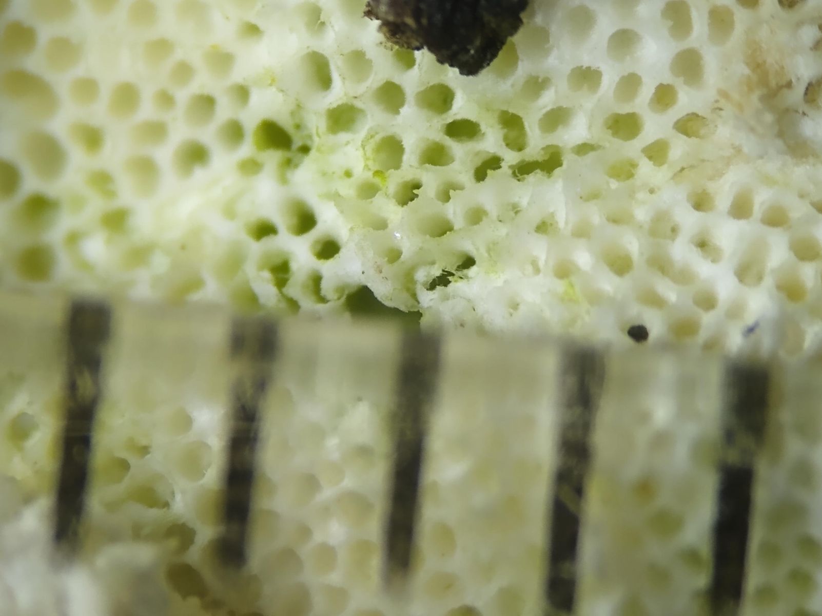 Die Poren sind weiß bis hellbeige gefärbt.