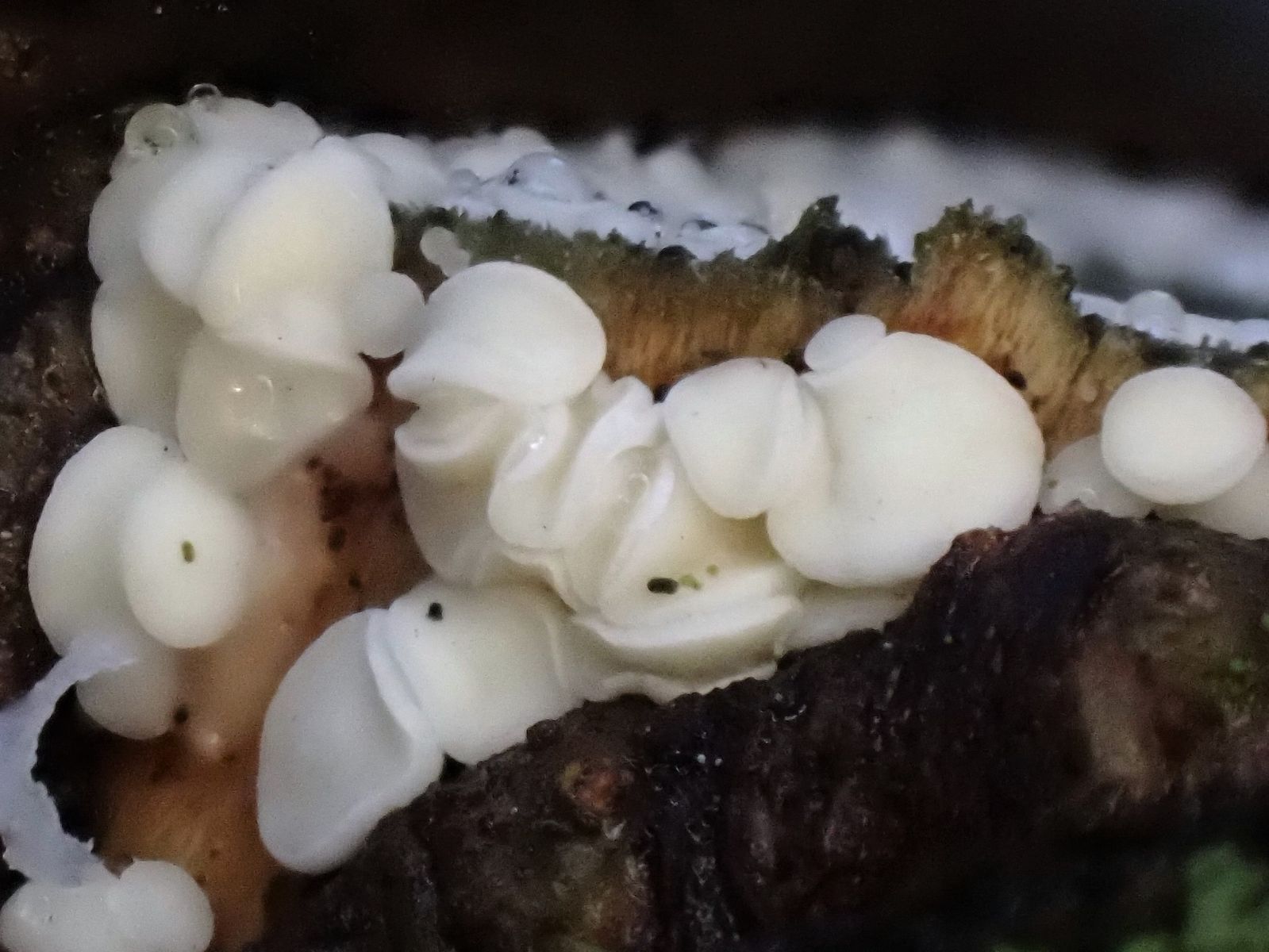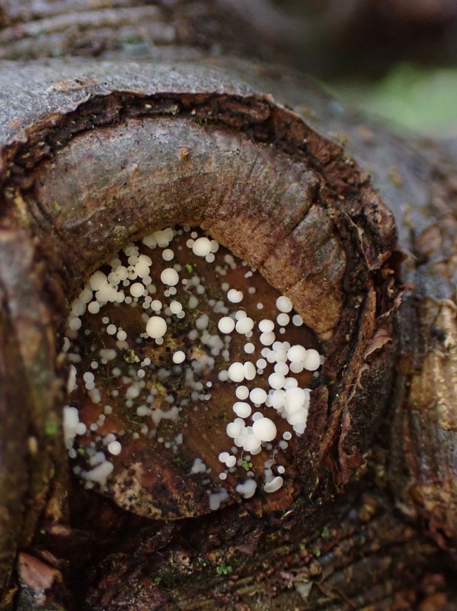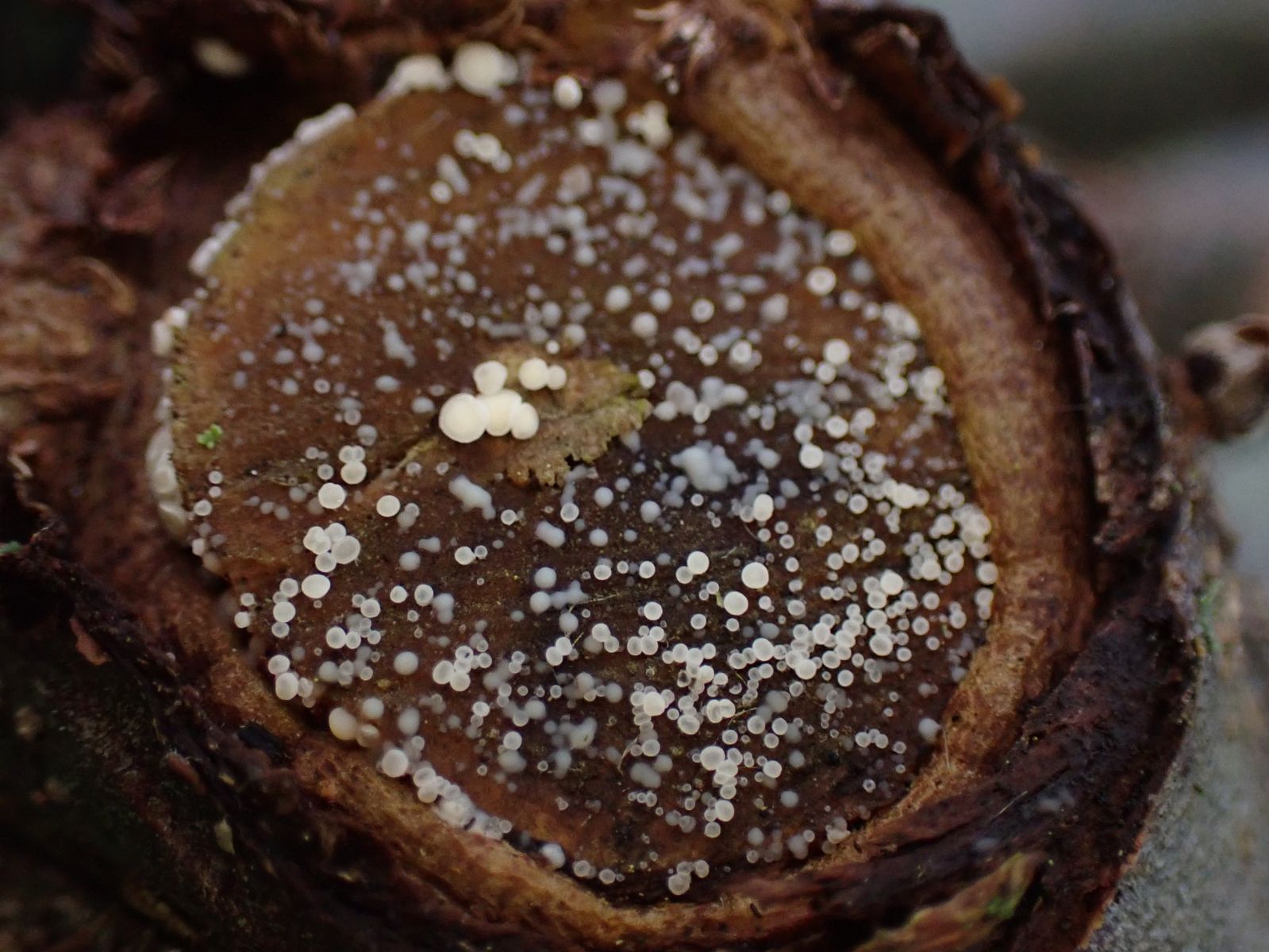Weiße Becherchen auf Apfelbaum: Calycina sp.