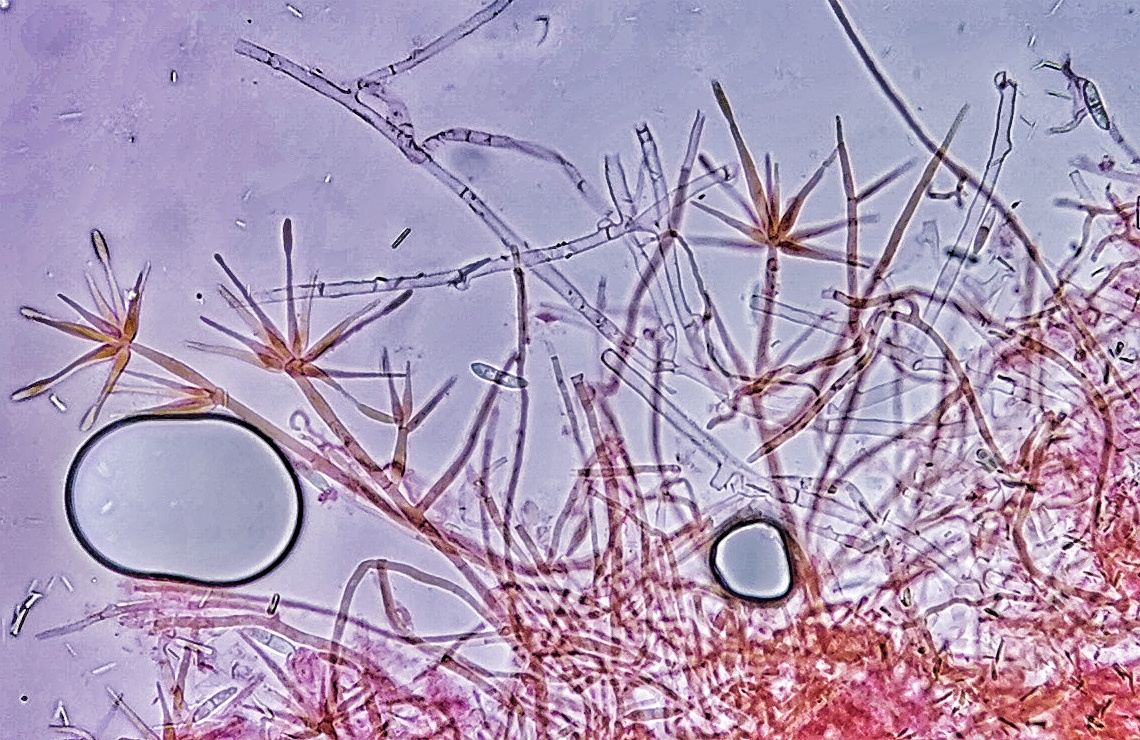von der gestrigen Exkursion haben wir u.a. eine nicht bestimmbare Corticiaceae mitgebracht, die eine schöne Anamorphe beinhaltete. Da diese gut entwickelt war, dachten wir, lässt sich sicherlich zumindest näherungsweise bestimmen - das war ein Trugschluss .....