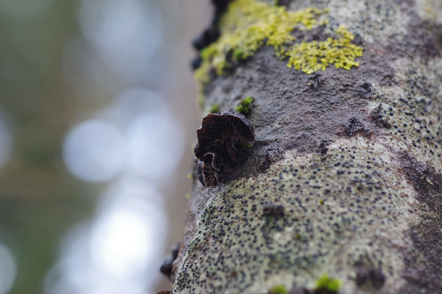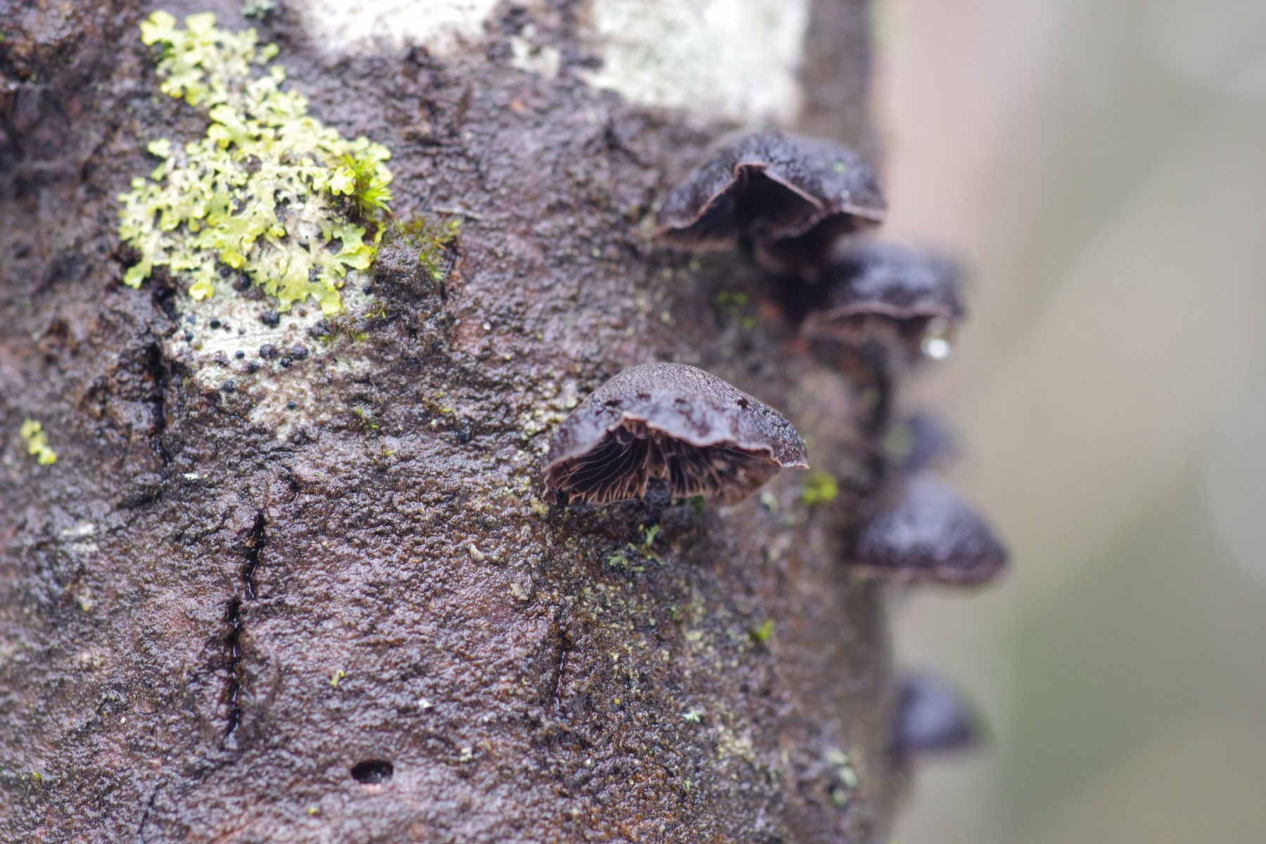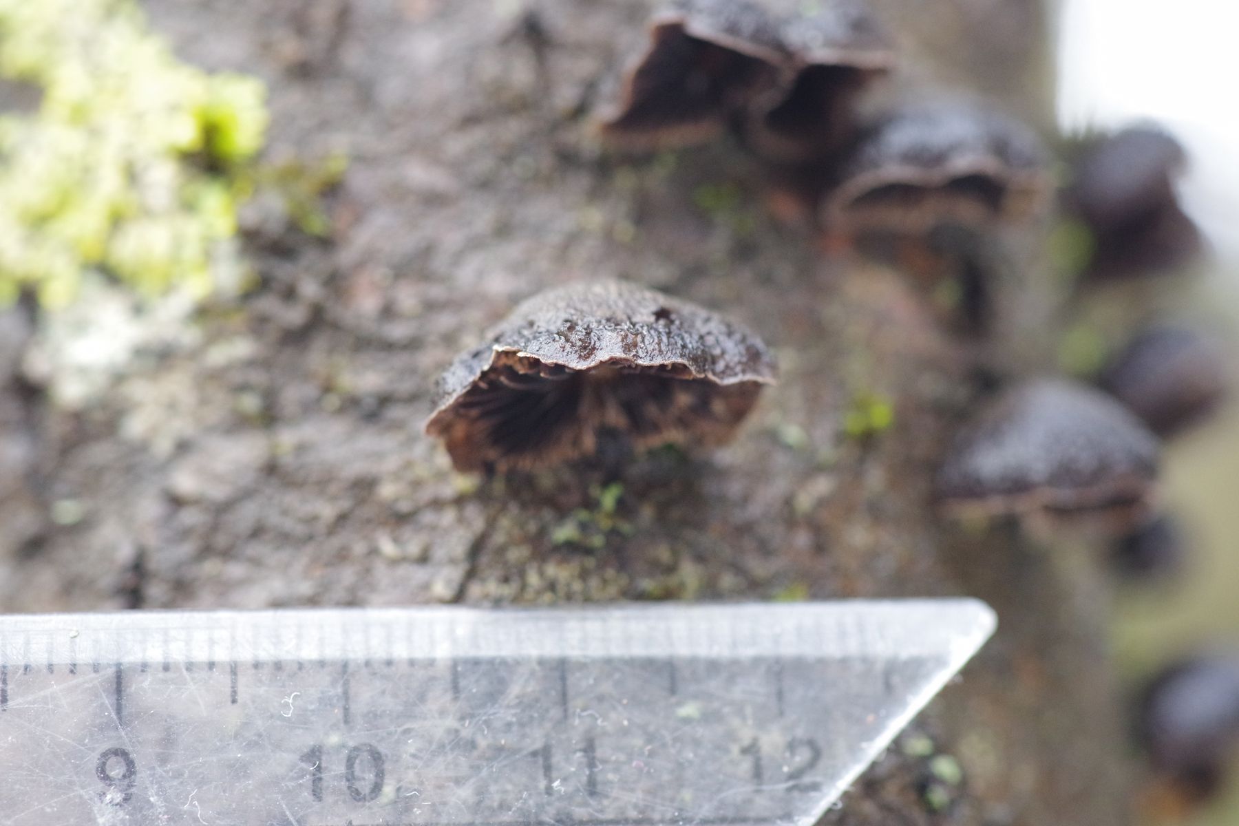 an einer kürzlich abgestorbenen jüngeren Espe habe ich einen schwarzen, braunschwarzen Seitling gefunden und war dann extra mit Leiter im Wald. Die Rinde löst sich schon leicht ab. Größe bis 18 mm. Stiel ist nicht erkennbar, aber nur wenig angewachsen. Huthaut nicht zoniert, wenig haarig. Lamellen in Hutfarbe, aber weiß bereift. Vielleicht geht das Richtung Hohenbuehelia albonigra?
