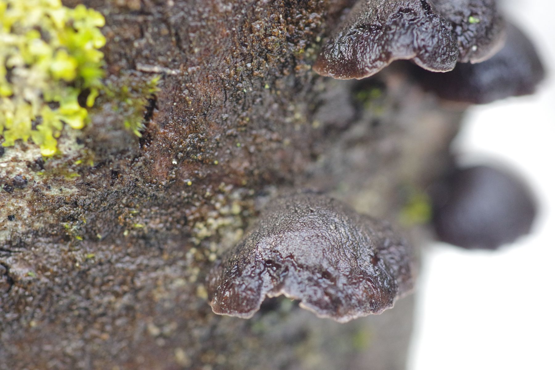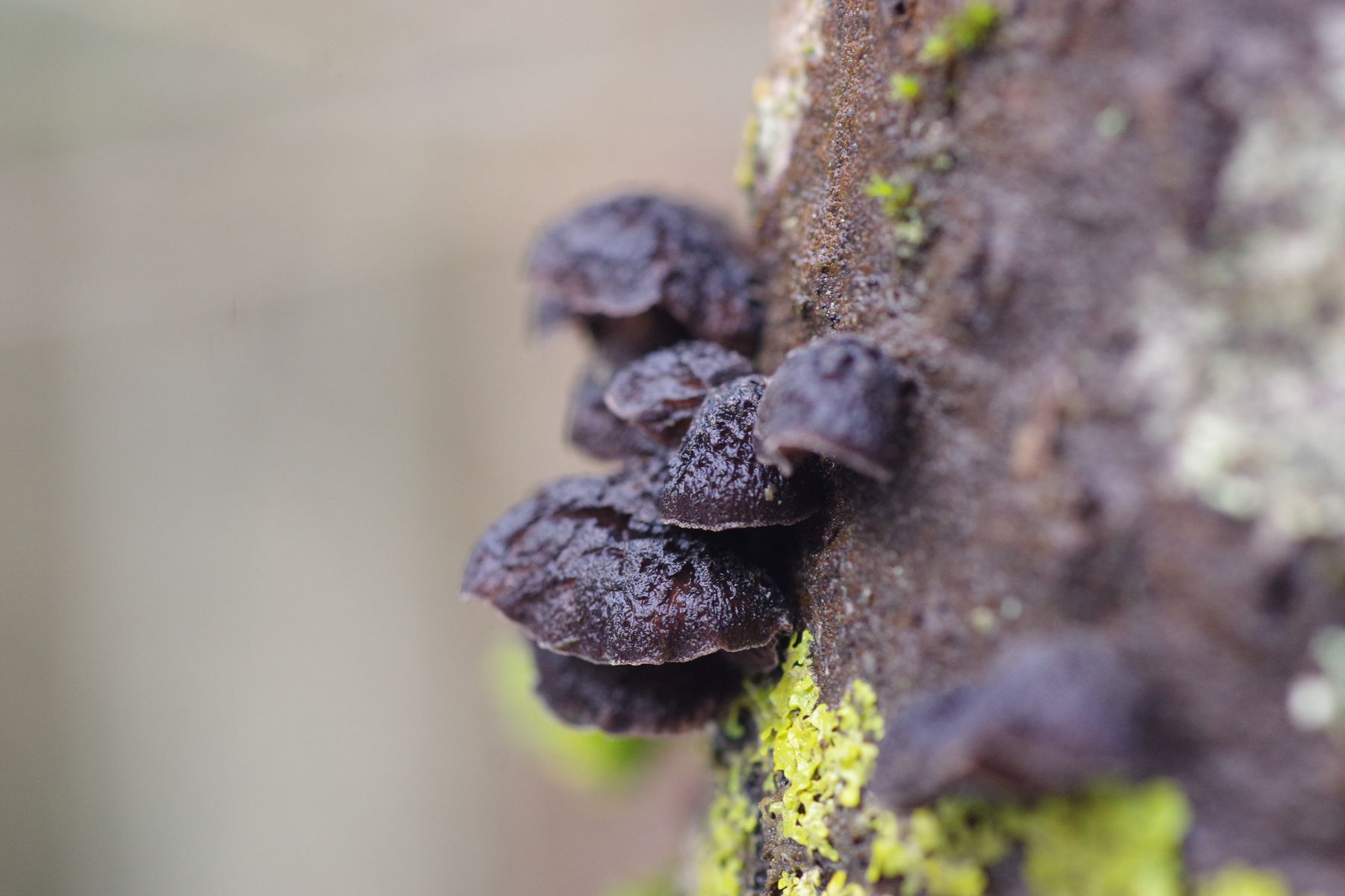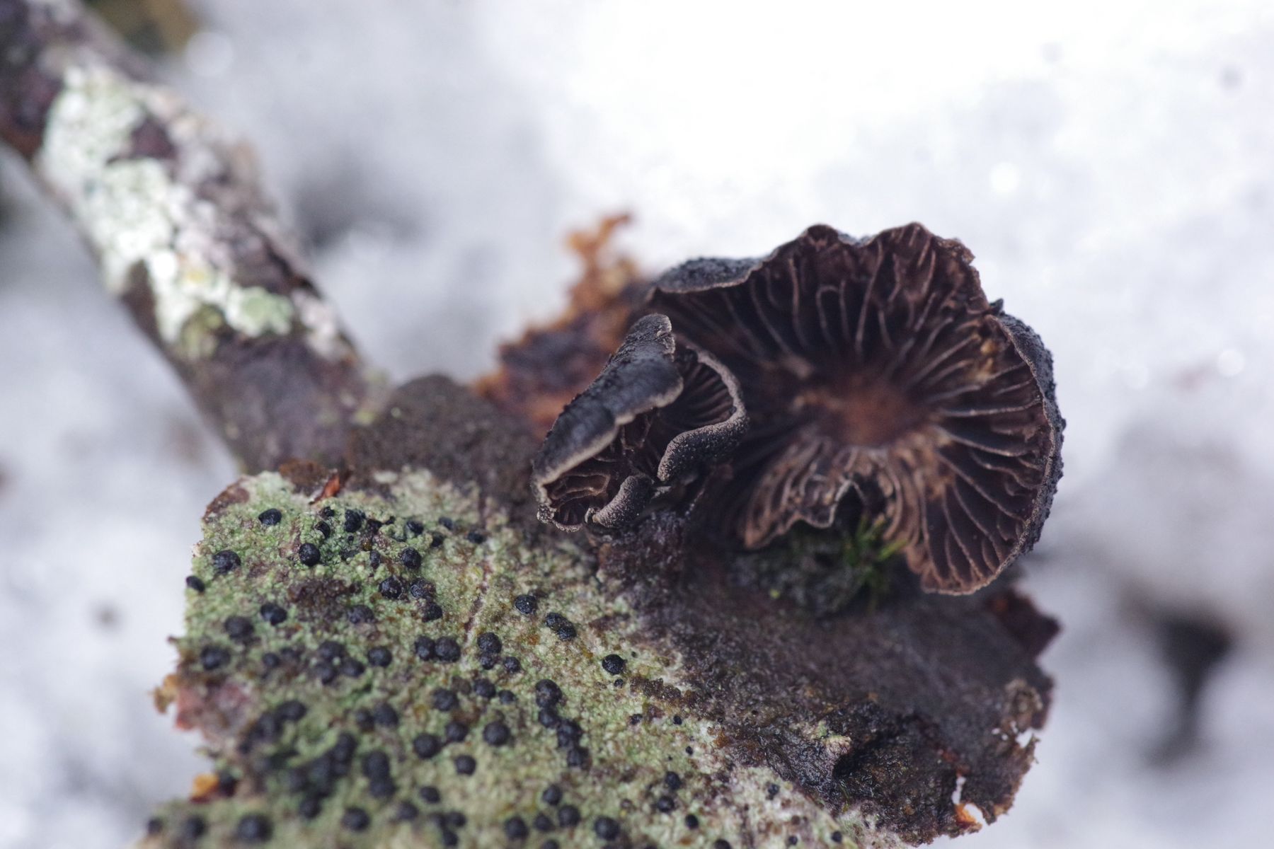 an einer kürzlich abgestorbenen jüngeren Espe habe ich einen schwarzen, braunschwarzen Seitling gefunden und war dann extra mit Leiter im Wald. Die Rinde löst sich schon leicht ab. Größe bis 18 mm. Stiel ist nicht erkennbar, aber nur wenig angewachsen. Huthaut nicht zoniert, wenig haarig. Lamellen in Hutfarbe, aber weiß bereift. Vielleicht geht das Richtung Hohenbuehelia albonigra?