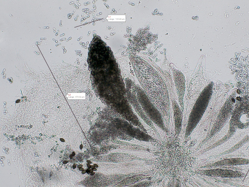 Die Asci bestanden aus sehr sehr vielen Sporen; naja, bei der Fotoqualität wird Zählen nicht so viel Sinn machen; wenn ich allerdings davon ausgehen würde, dass es 512 sind, käme mir bei der Bestimmung Podospora longicollis einigermaßen sinnvoll vor.