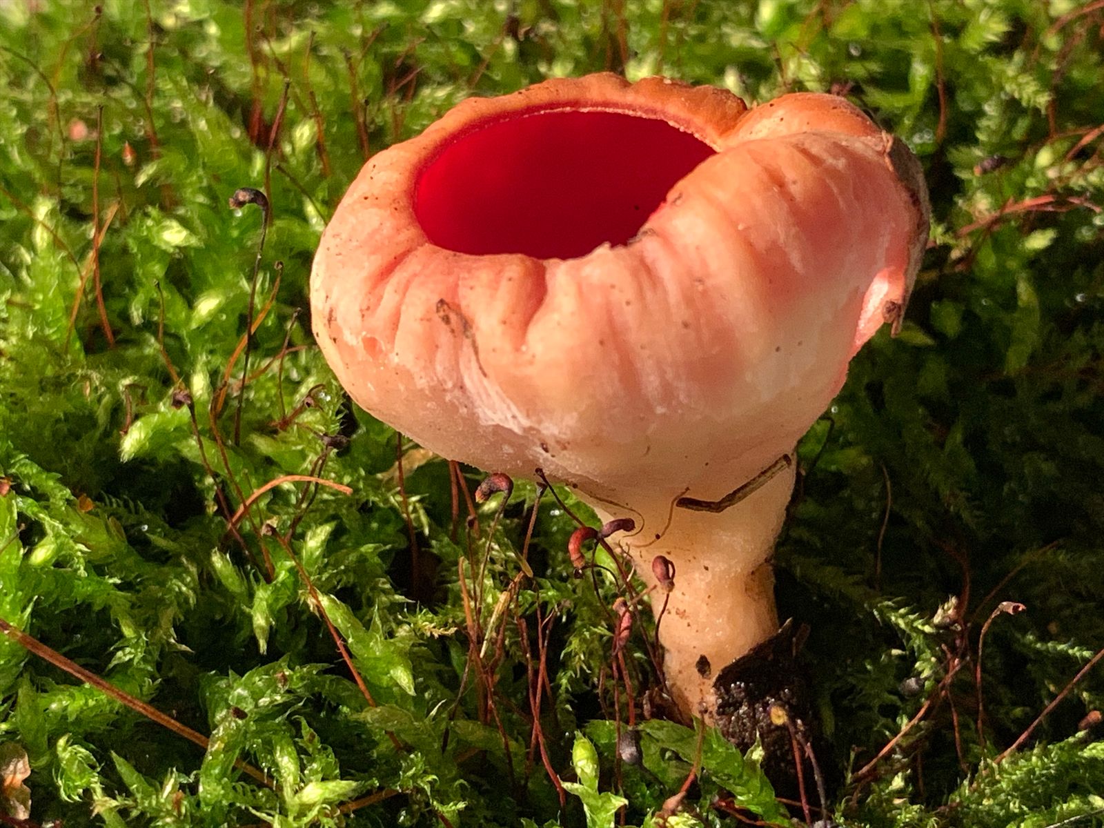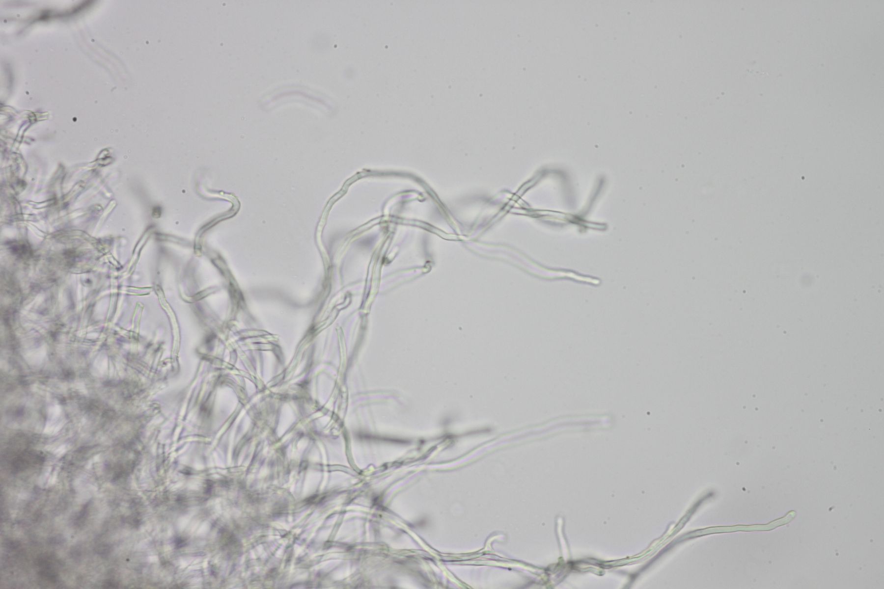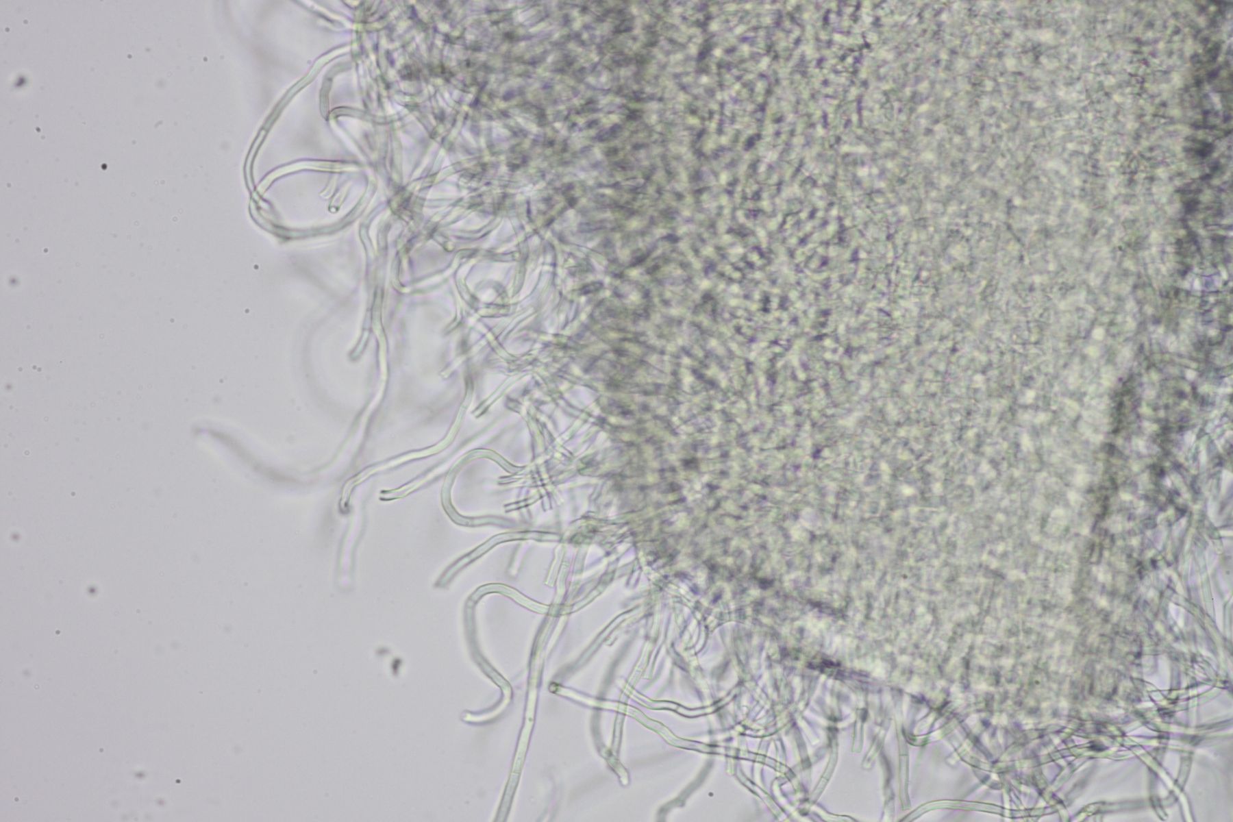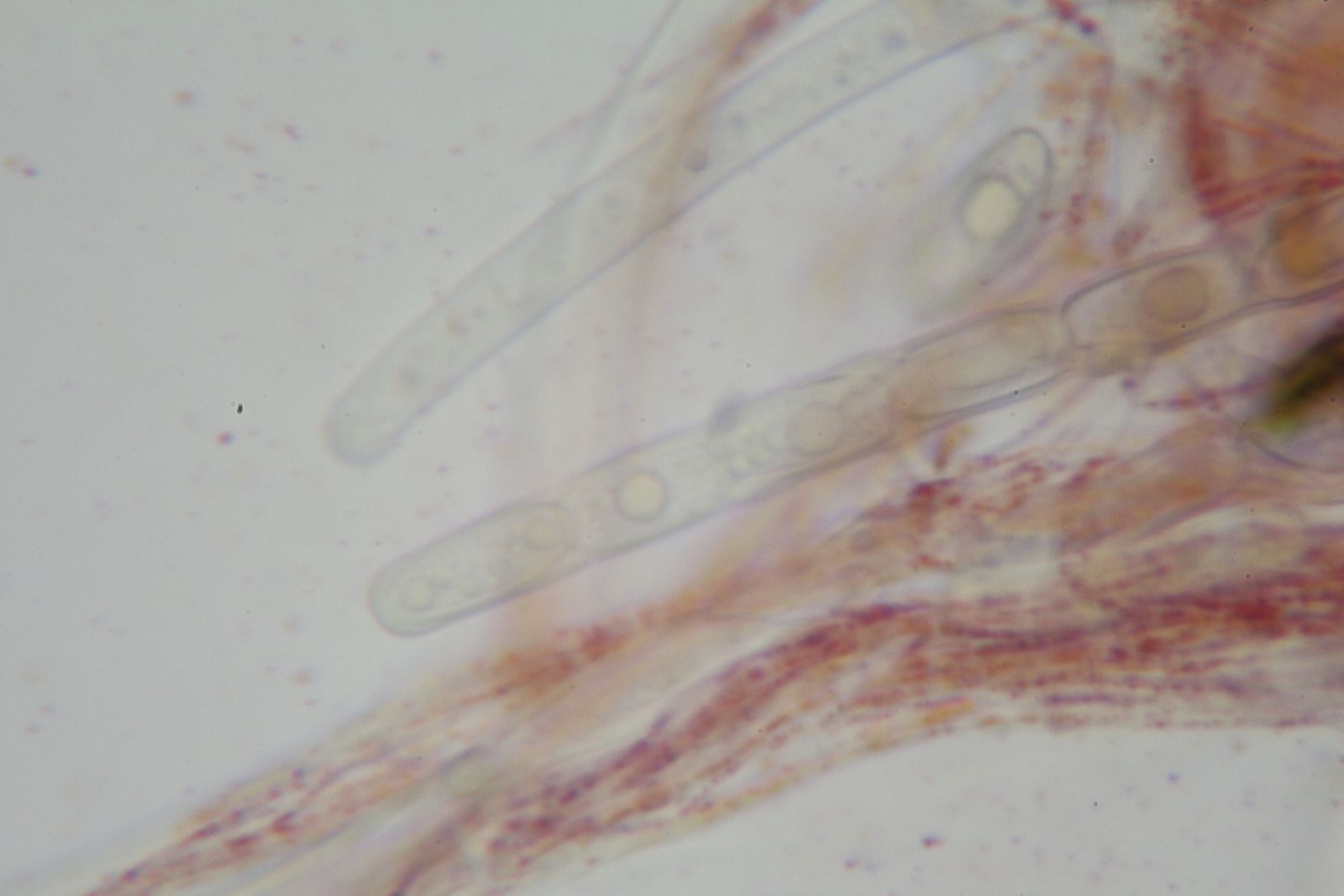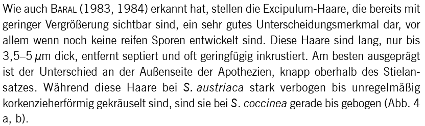 am letzten Wochenende habe ich bei einem kleinen Bach kleine rote Becher der Gattung Sarcosypha gefunden. Das Holz, auf dem sie wuchsen, habe ich mir leider nicht näher angeschaut. In unmittelbarer Umgebung standen Erle und Buche. Reife Sporen hat er natürlich noch nicht produziert, deswegen habe ich ein Stück Expiculum aus dem Übergang zum Stiel entnommen. Die Haare von austriaca sollen im Vergleich zu coccinea "korkenzieher-artig". Auf meinem Mikrofotos sind sie gekrümmt, was mich zu austriaca tendieren lässt, aber korkenzieher-artig sind sie für mich nicht. Was meint ihr dazu?