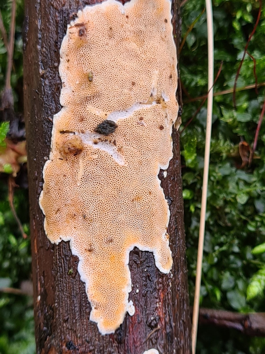 Ich bin etwas aufgeschmissen, optisch erinnert er mich an Peniophora incarnata - aufgrund der Poren scheidet der natürlich aus.. :D