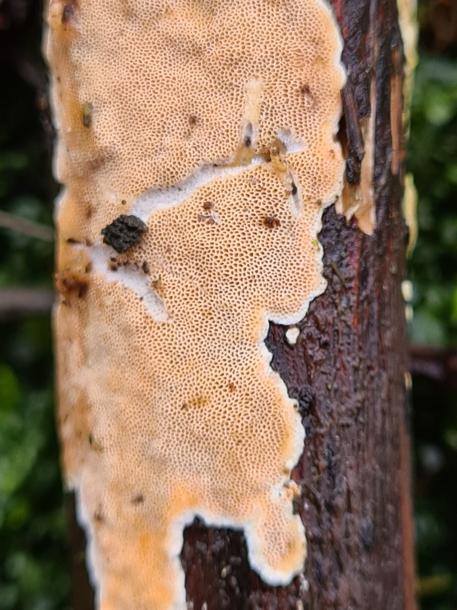 Ich bin etwas aufgeschmissen, optisch erinnert er mich an Peniophora incarnata - aufgrund der Poren scheidet der natürlich aus.. ![]()