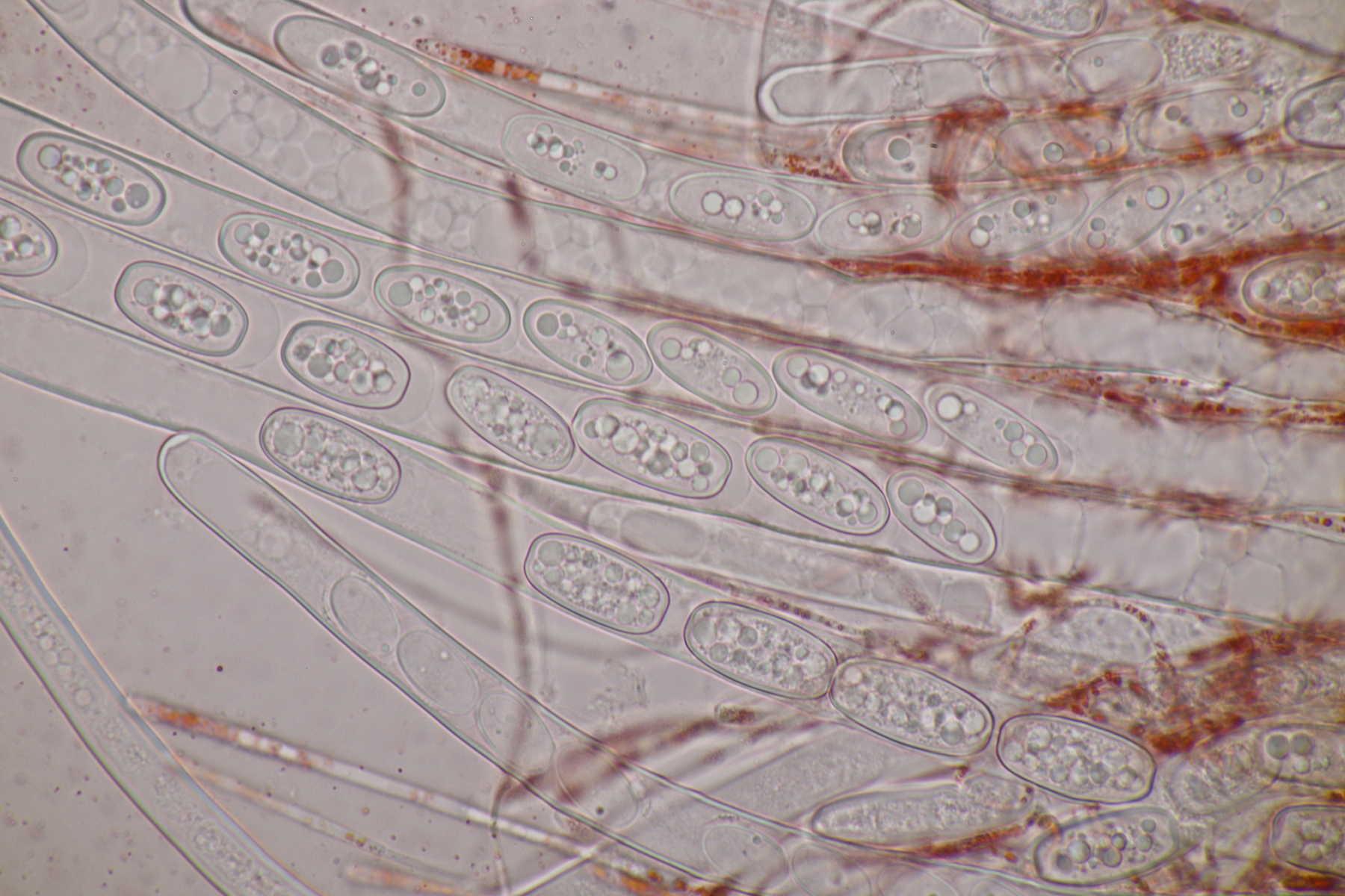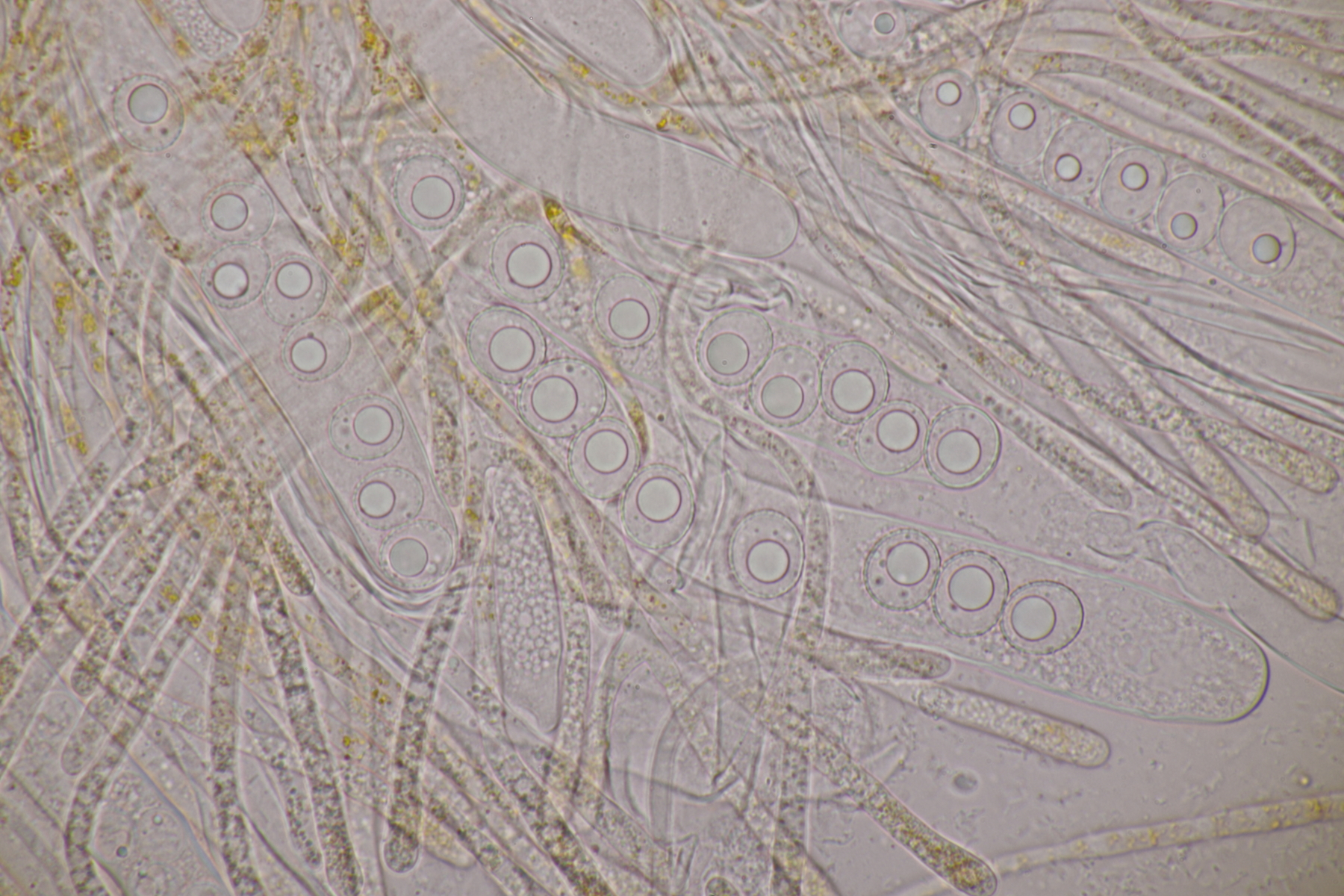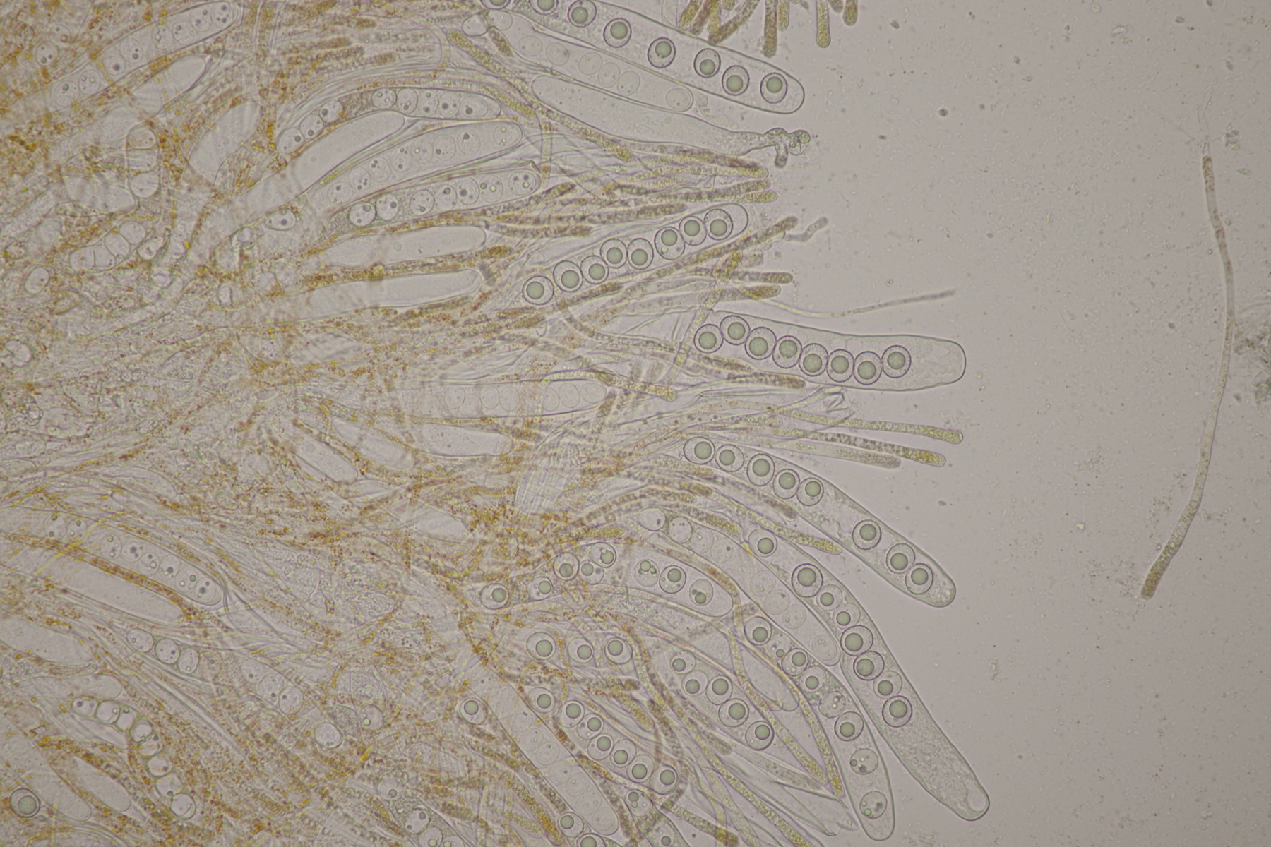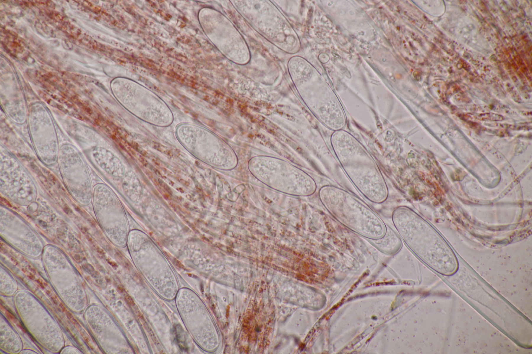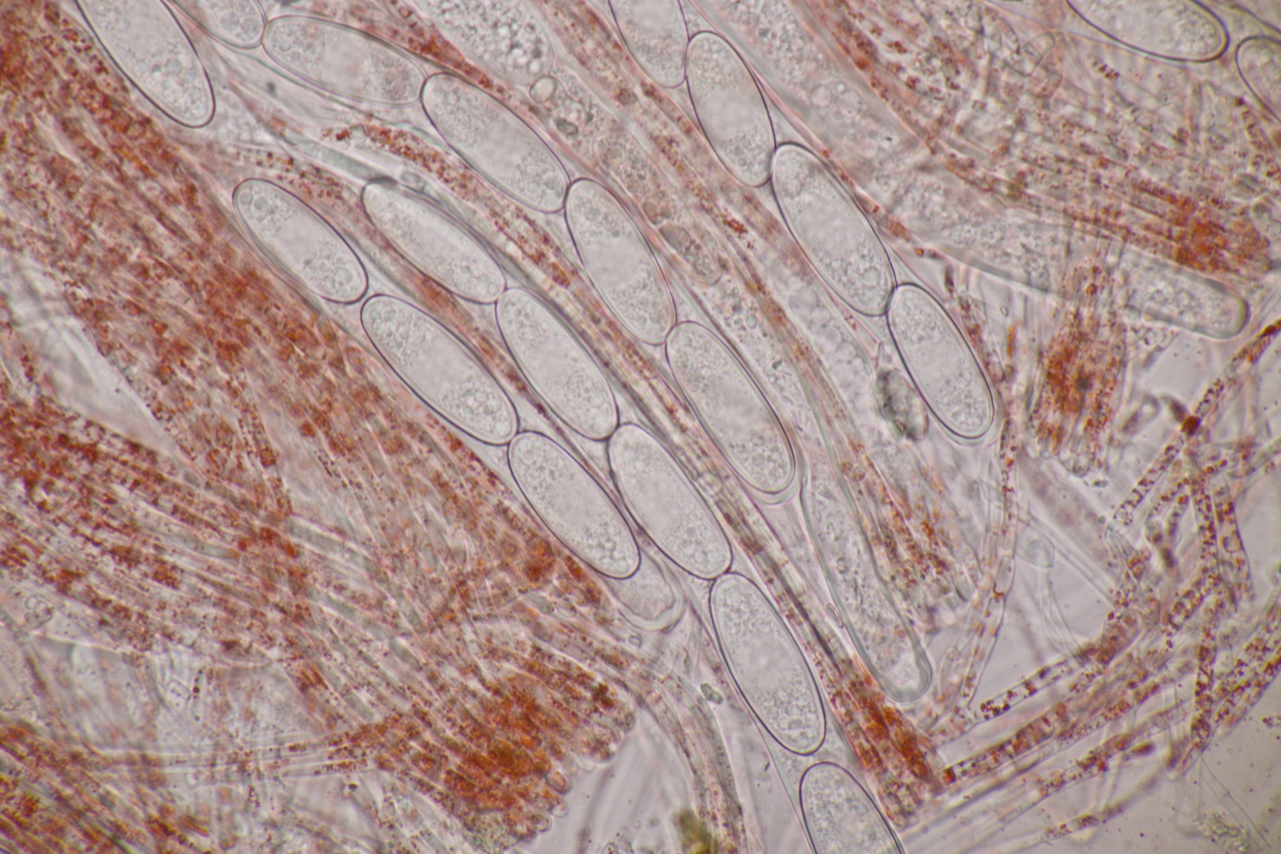 3. Sarcoscypha sp. Ich wollte dann doch nicht jeden fotografierten Fruchtkörper mikroskopieren und offenbar wachsen dort beide Arten durcheinander
