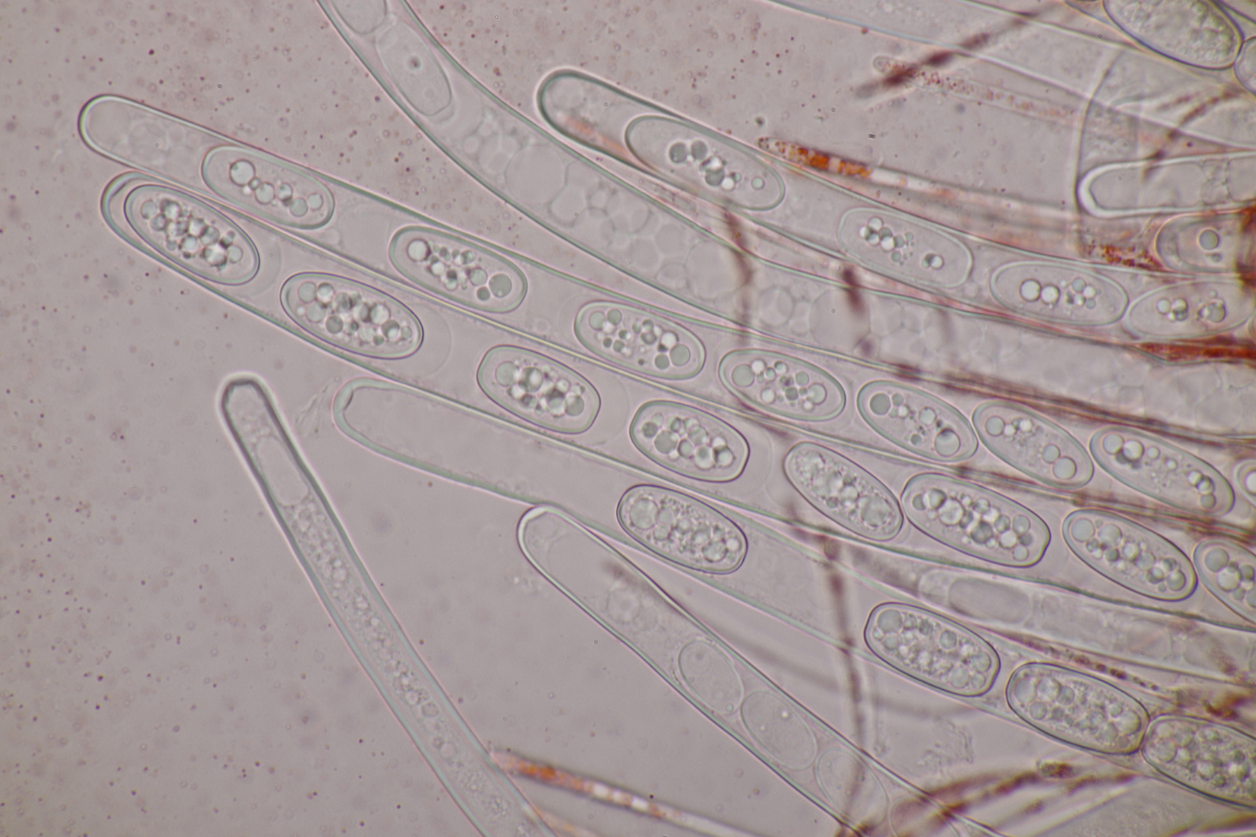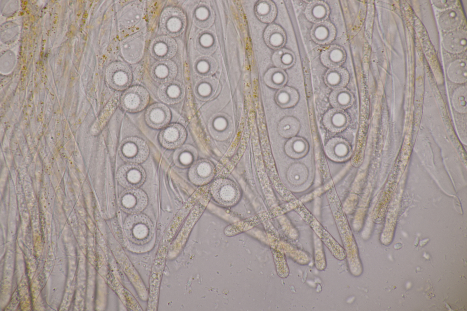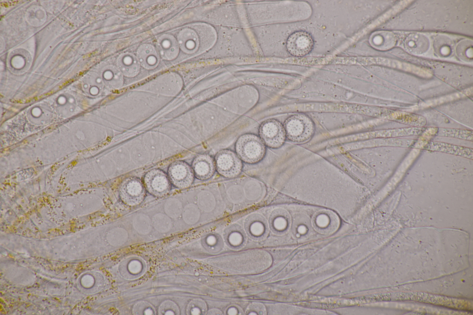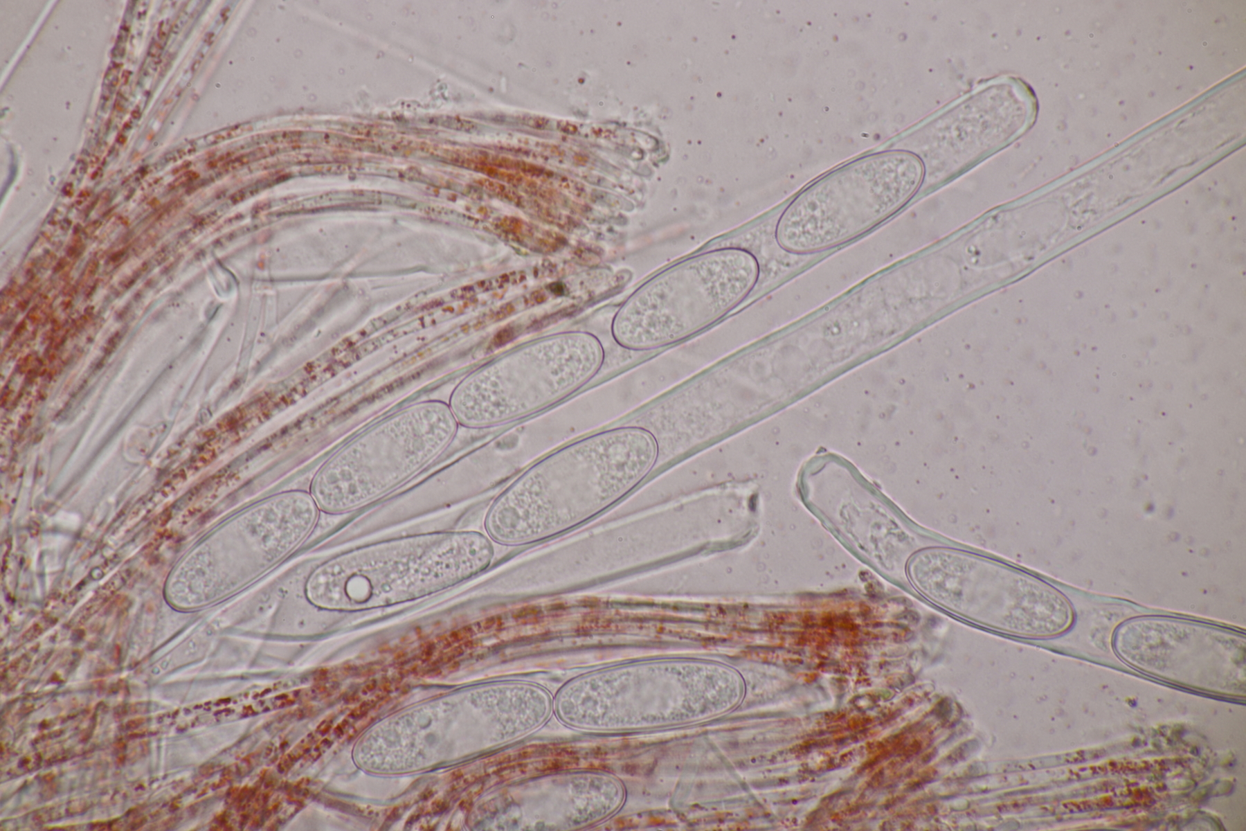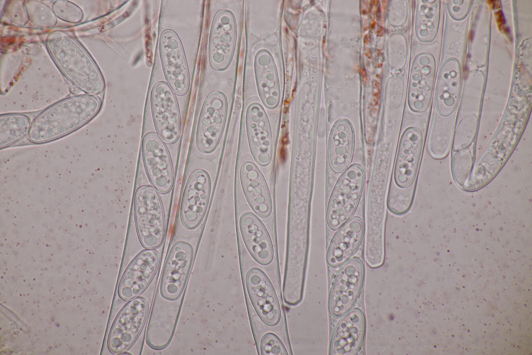 3. Sarcoscypha sp. Ich wollte dann doch nicht jeden fotografierten Fruchtkörper mikroskopieren und offenbar wachsen dort beide Arten durcheinander