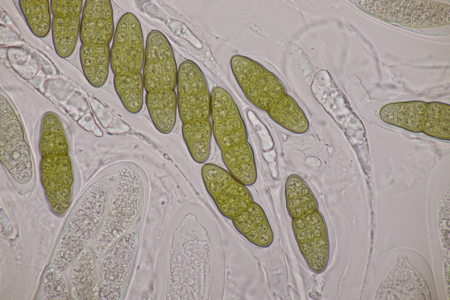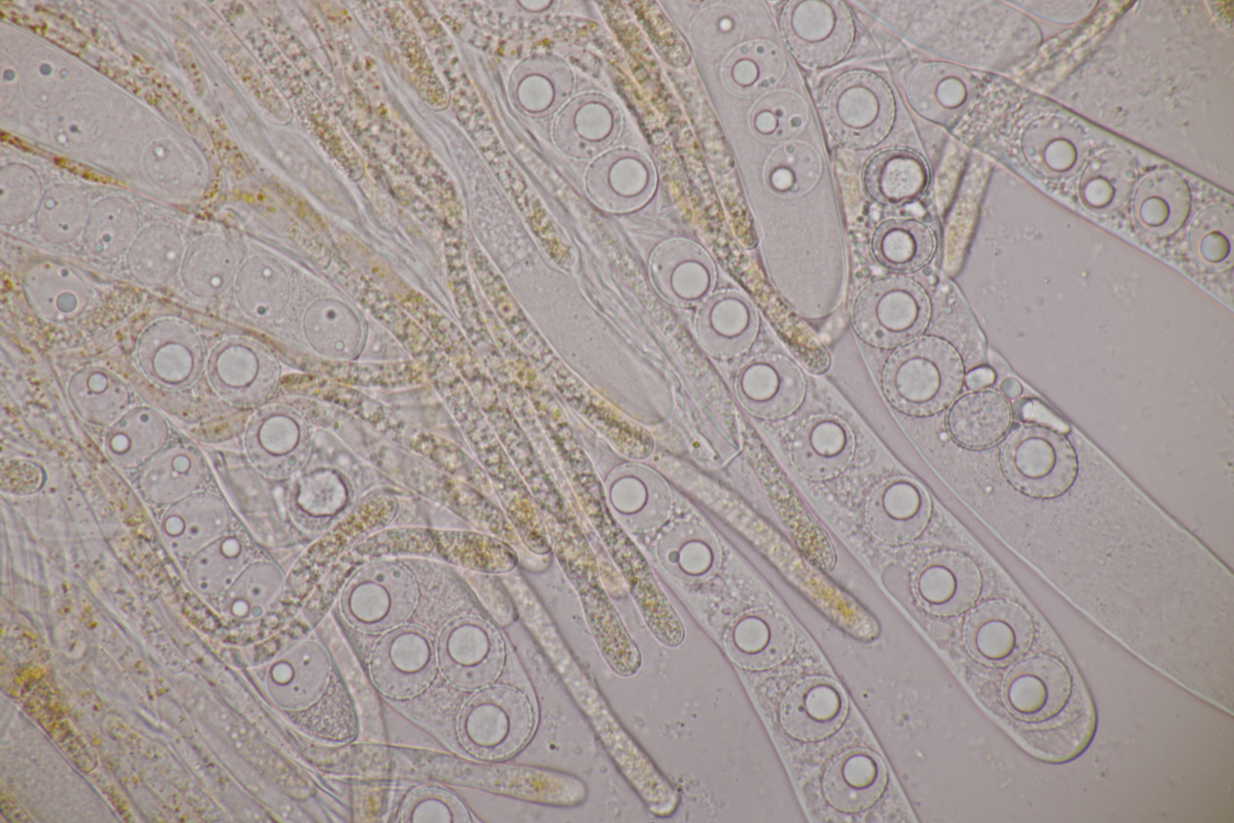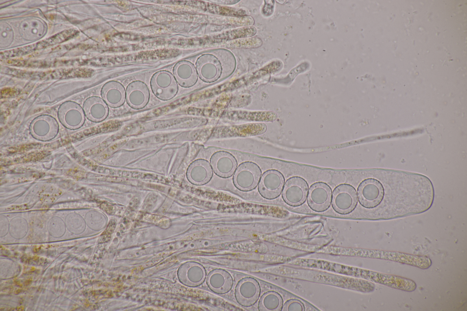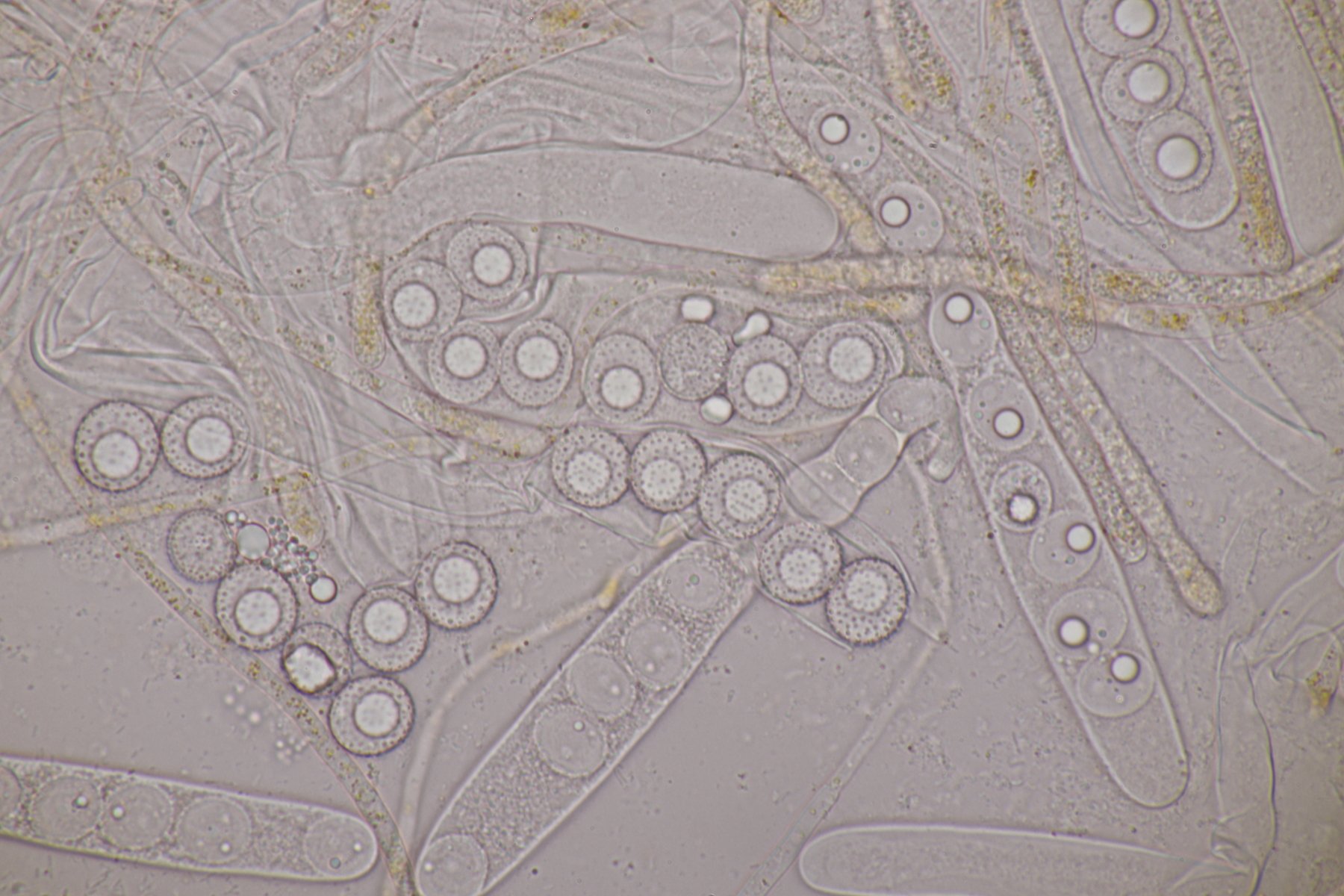 3. Sarcoscypha sp. Ich wollte dann doch nicht jeden fotografierten Fruchtkörper mikroskopieren und offenbar wachsen dort beide Arten durcheinander