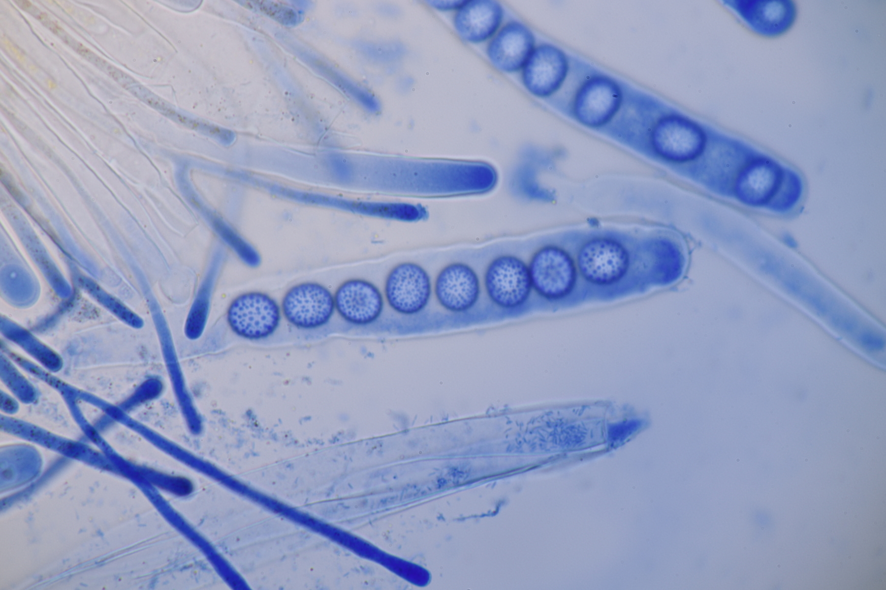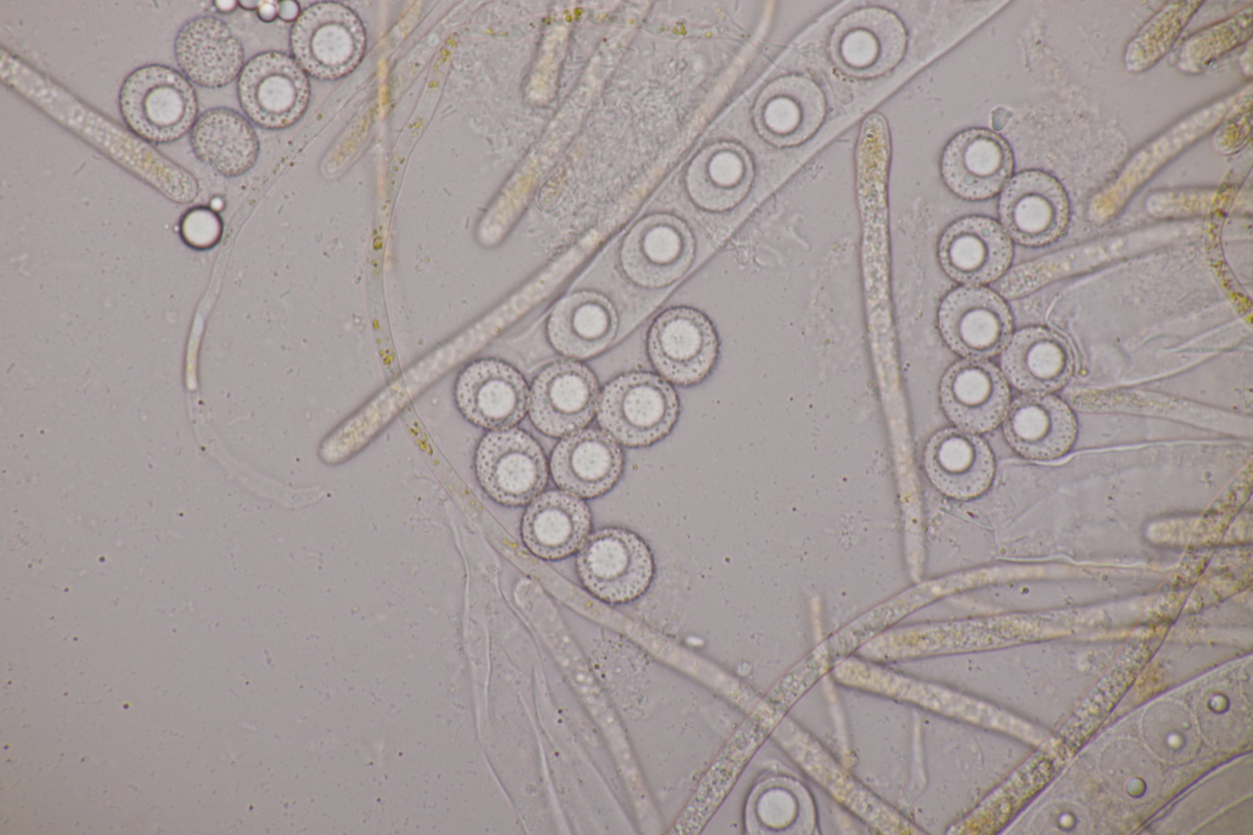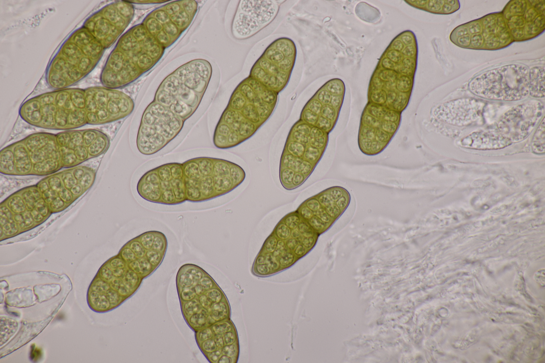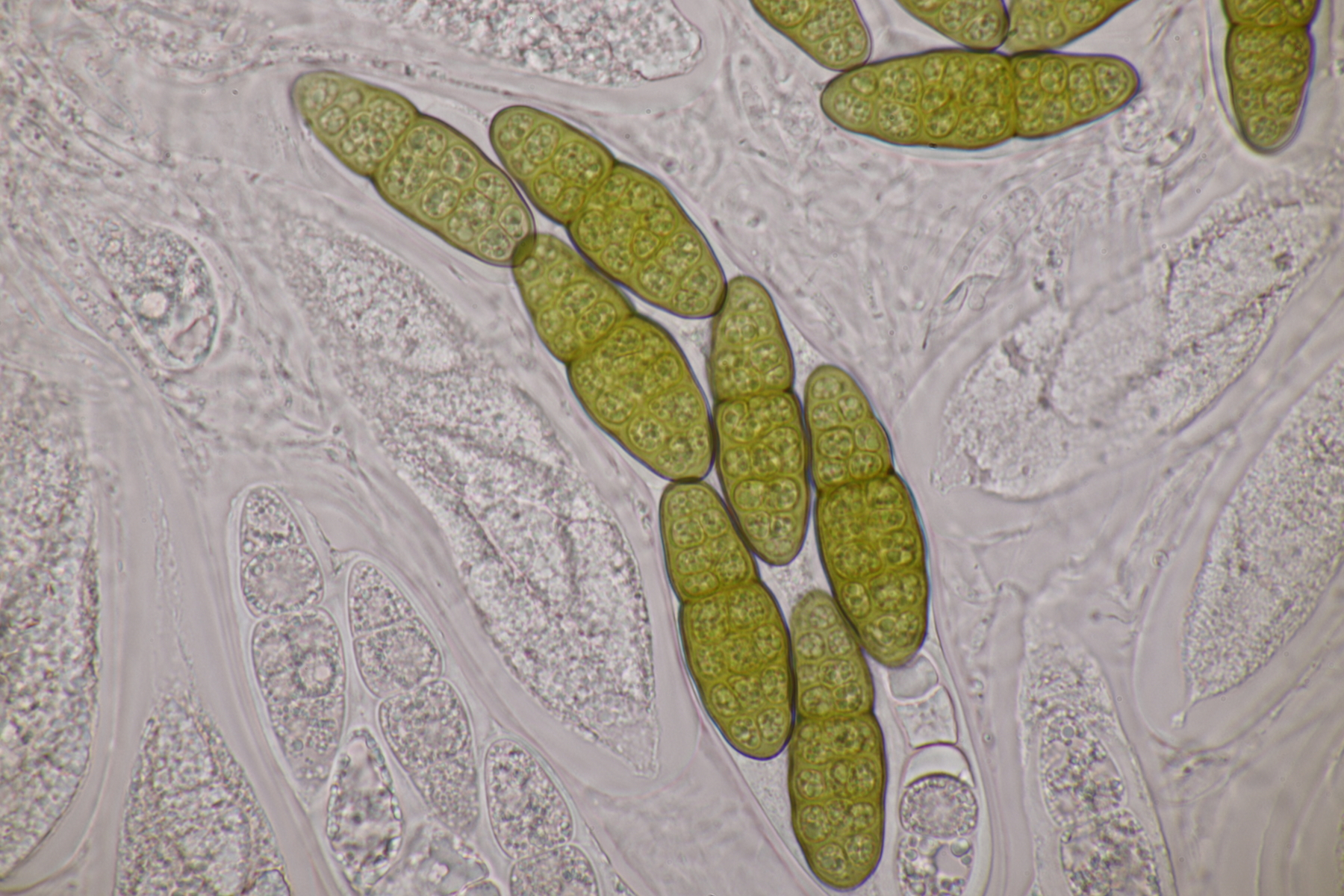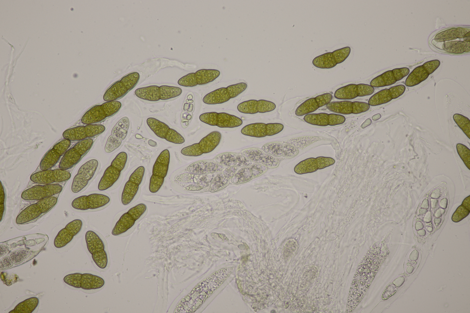 3. Sarcoscypha sp. Ich wollte dann doch nicht jeden fotografierten Fruchtkörper mikroskopieren und offenbar wachsen dort beide Arten durcheinander