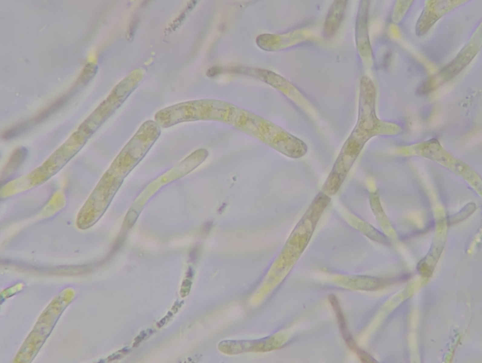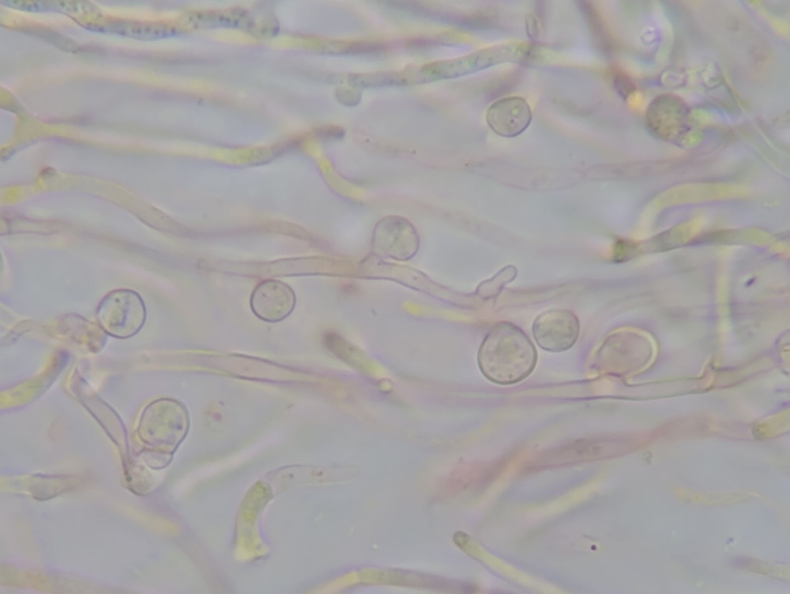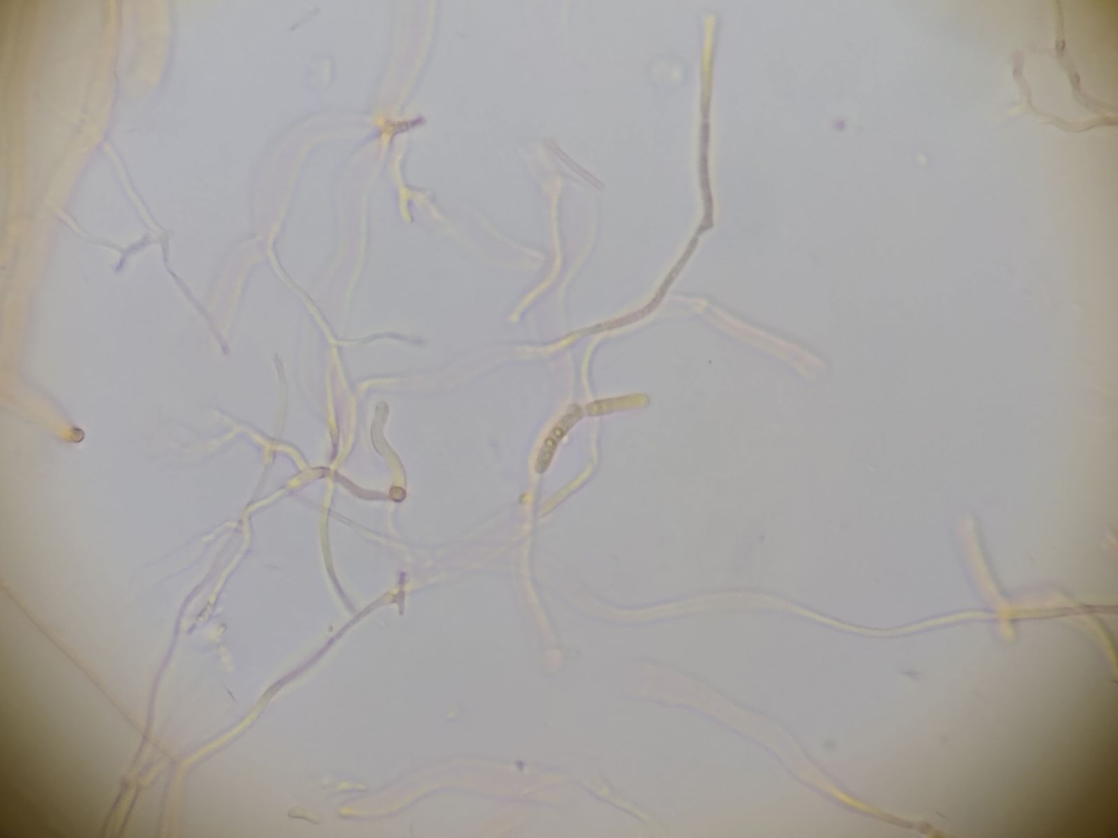 3) dünnere (< 3µm), farblos-transparente Hyphen mit Schnallen (Bild12), an denen kugelige Zellen (Durchmesser bis 5µm) aufsitzen, jeweils durch Schnallen getrennt (Bild 9 folgende).
