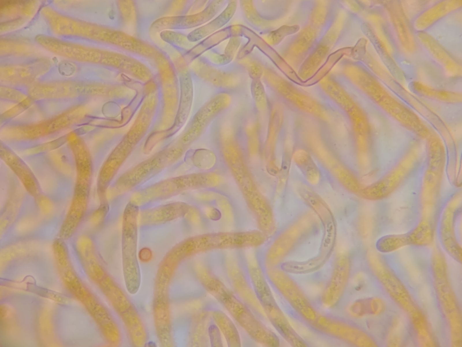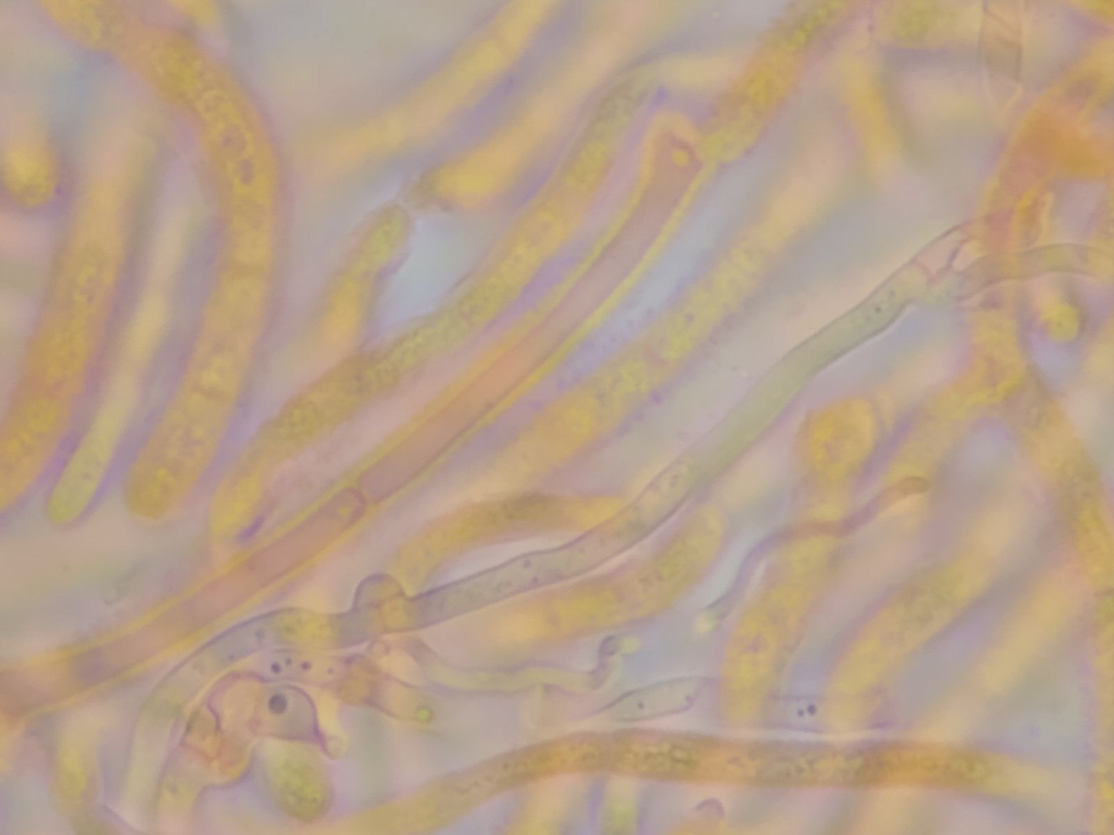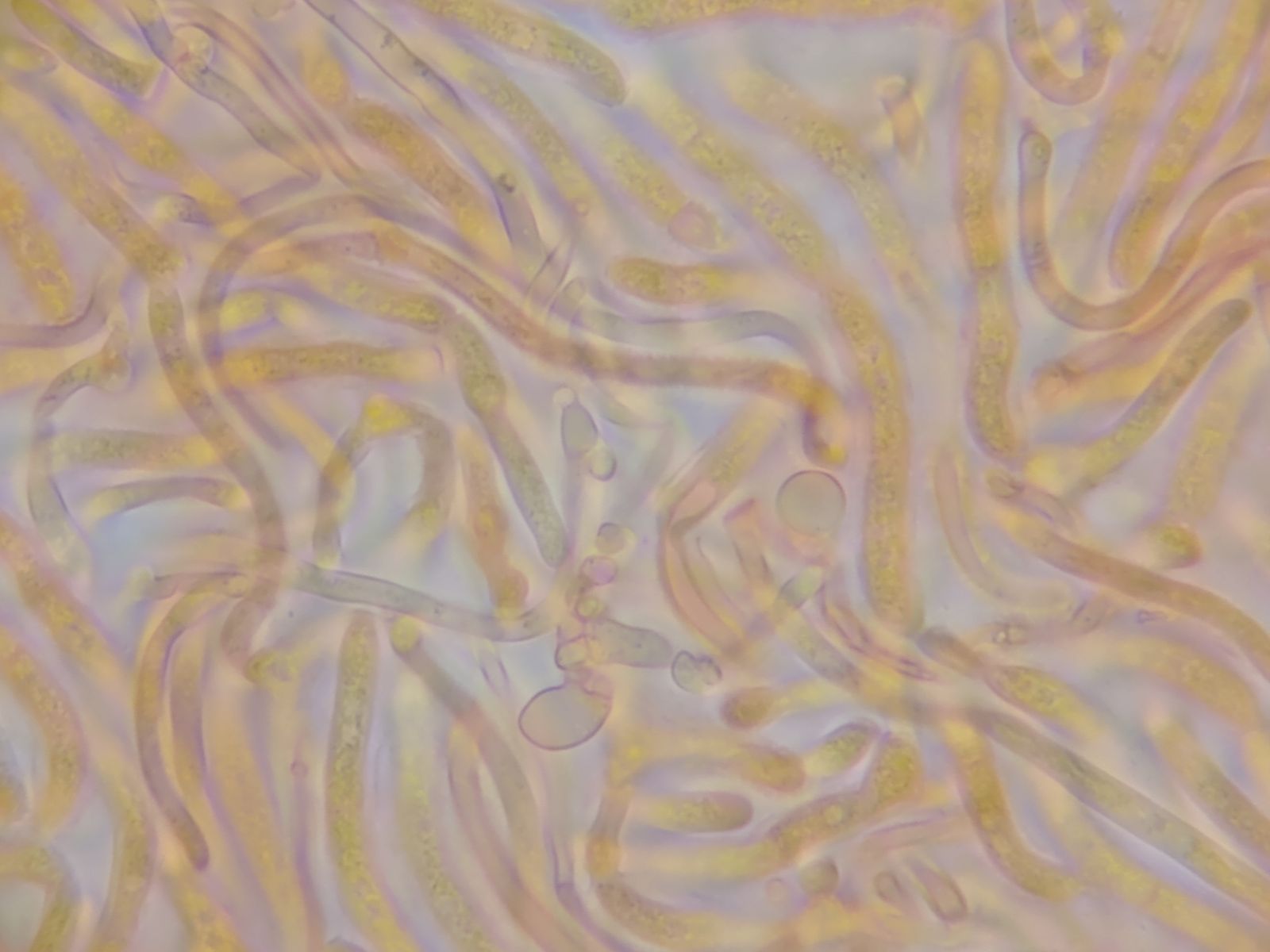 Jetzt hätte ich beim dem gelben Glibber entweder stimmgabelartige Basidien (Dacrymyces) oder längsseptierte Basidien (Tremella) erwartet.