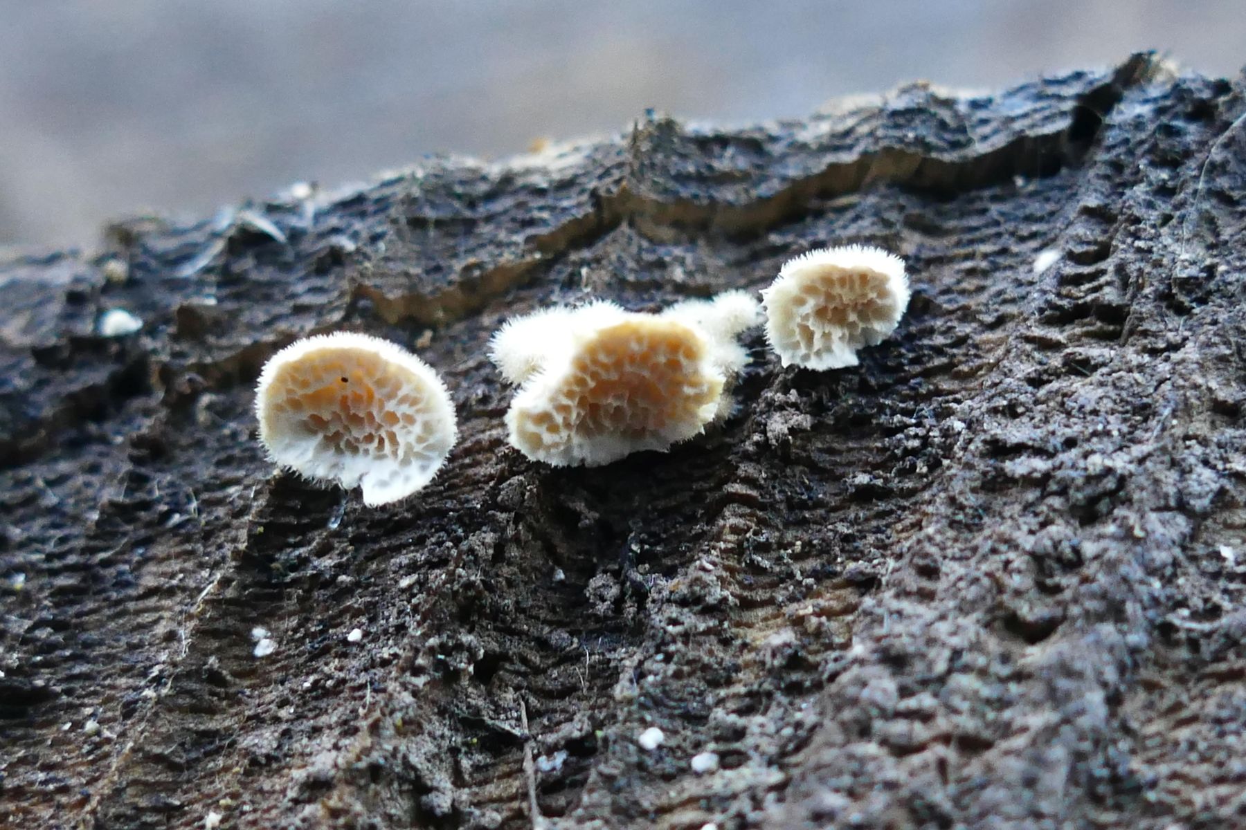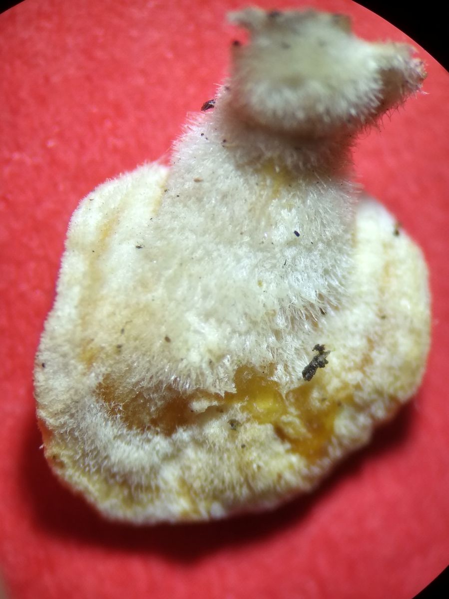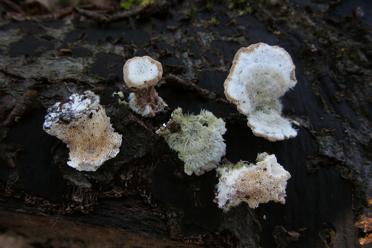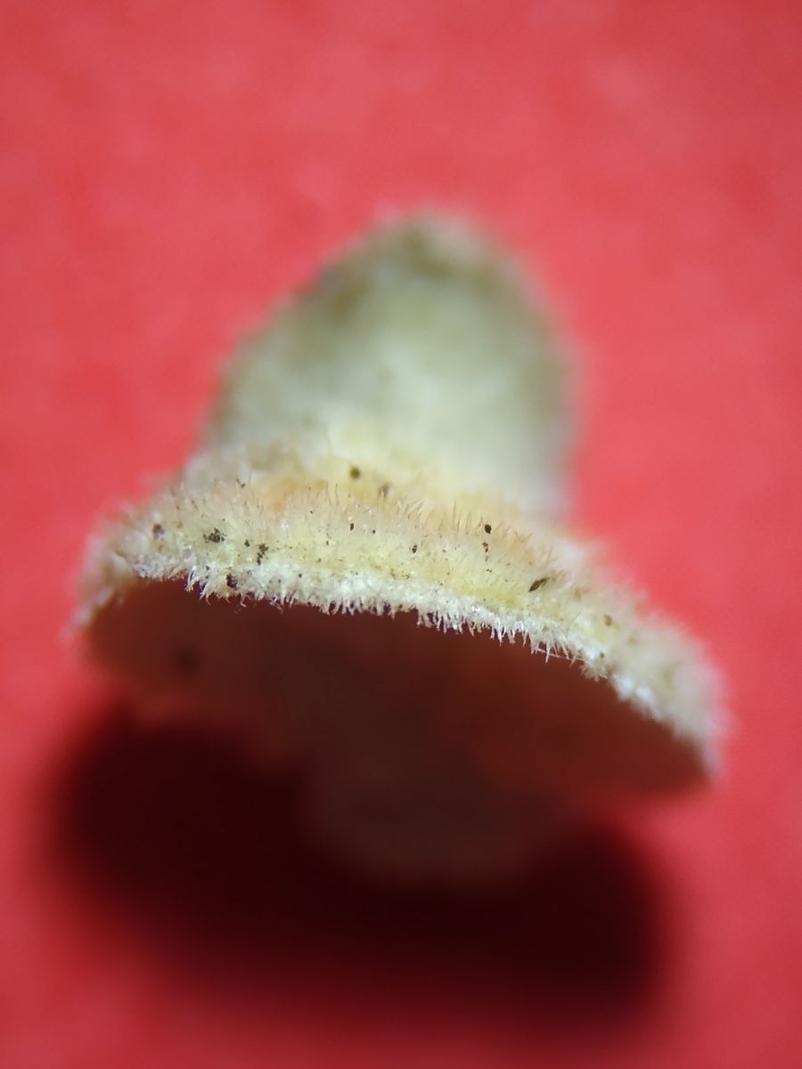 gerade gehe ich die Bilder von heute durch und entdecke einen kleinen, weißen, haarigen Pilz, mit seitlichem Stiel, der weder richtige Poren, Lamellen noch Adern hat.