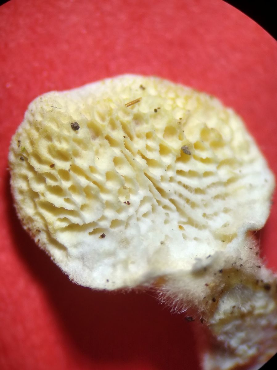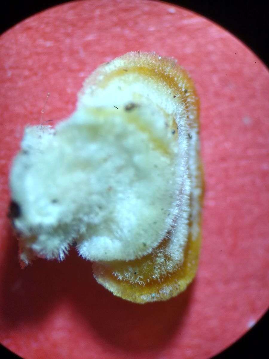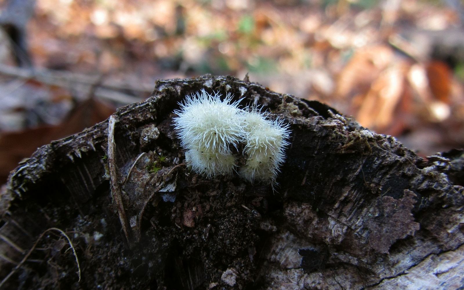 gerade gehe ich die Bilder von heute durch und entdecke einen kleinen, weißen, haarigen Pilz, mit seitlichem Stiel, der weder richtige Poren, Lamellen noch Adern hat.