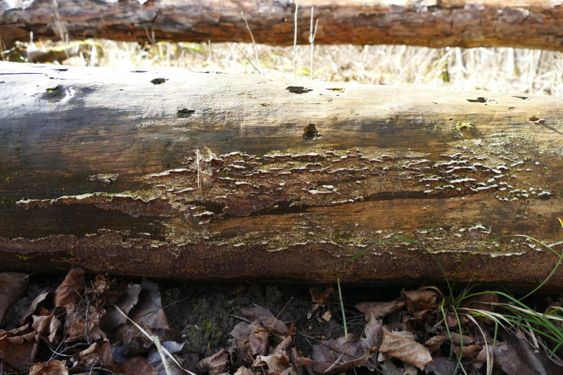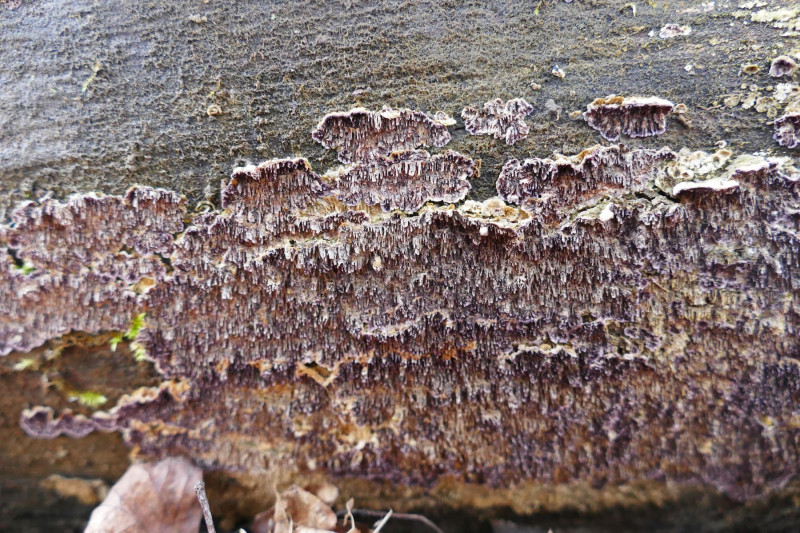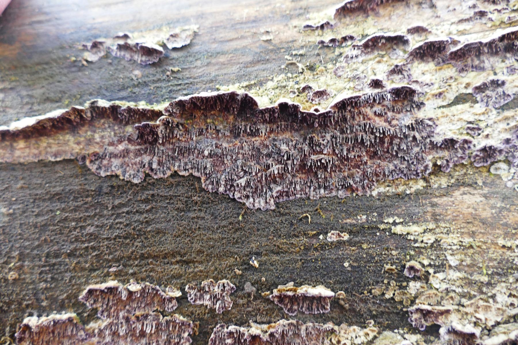 Der Färbung nach eventuell ein Trichaptum cf. fuscoviolaceum, mit zähnchenartigen "Poren".