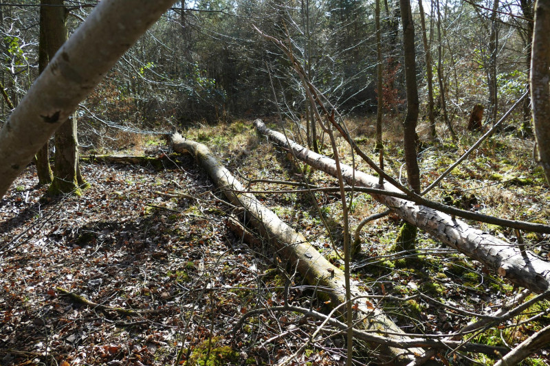 Auf einer freieren Fläche lagen zwei Baumstämme dicht beisammen.
