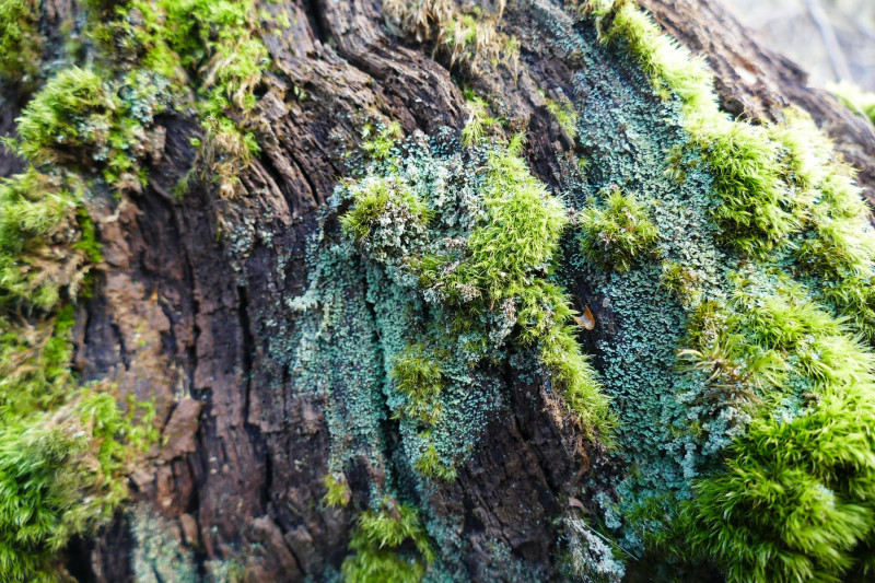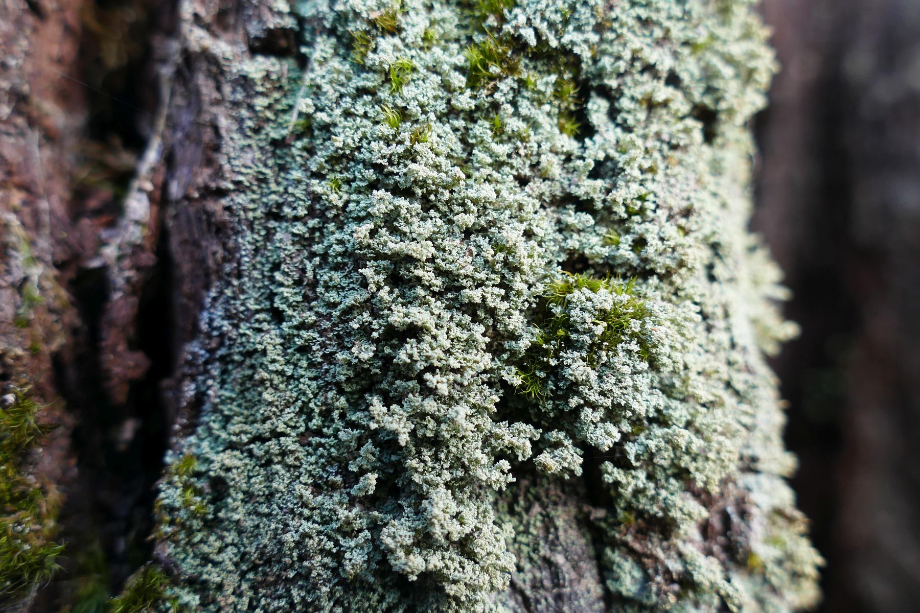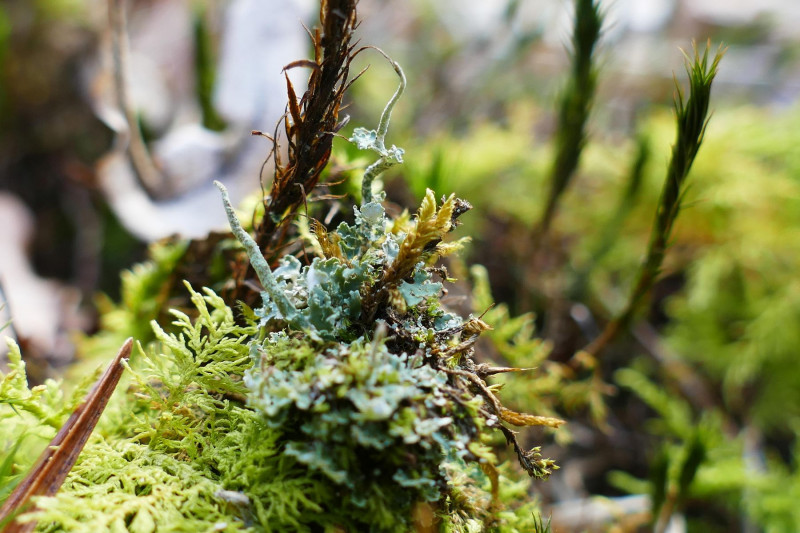 Eine sehr zarte Flechte auf einem vermoosten Baumstumpf.