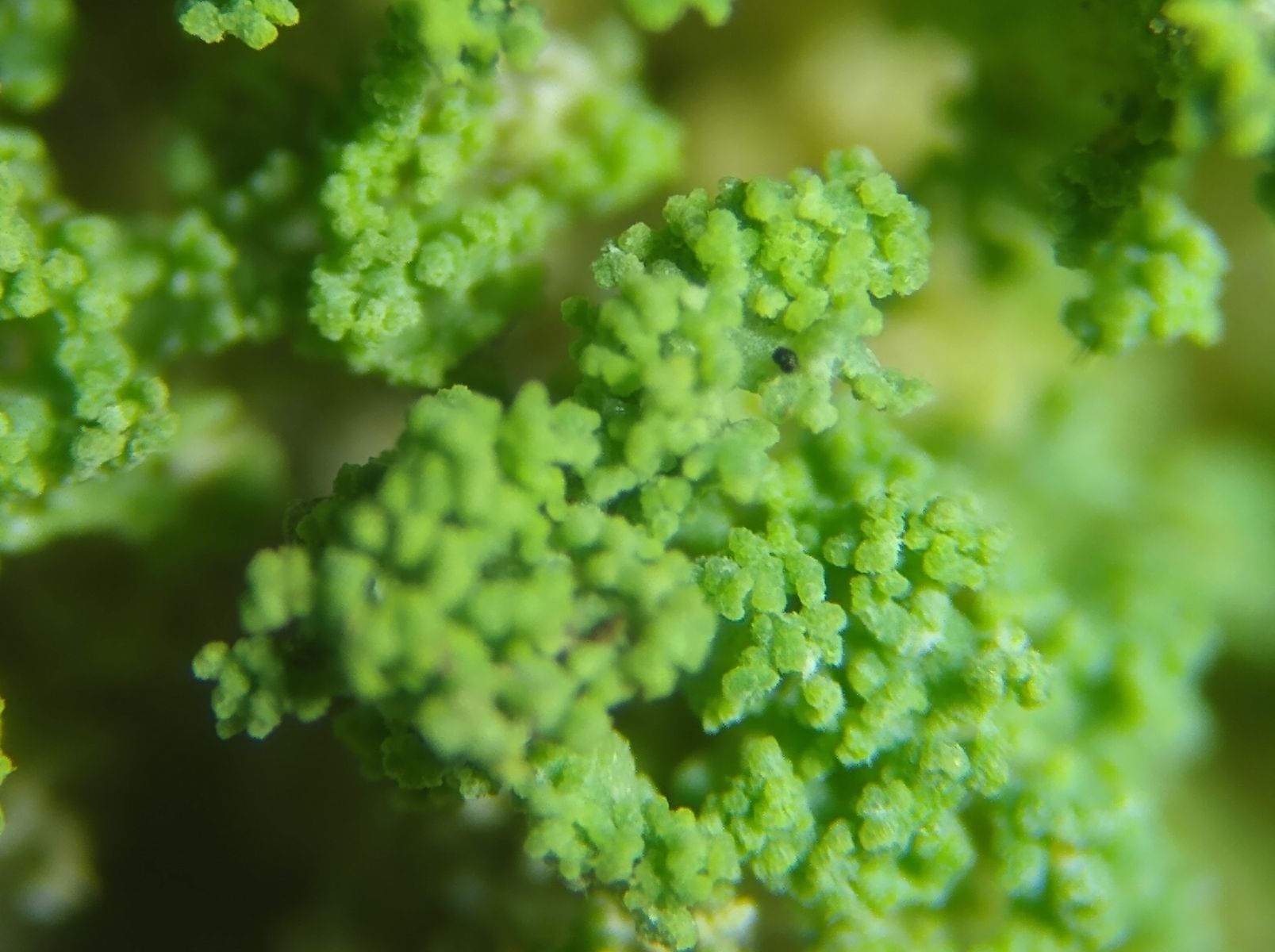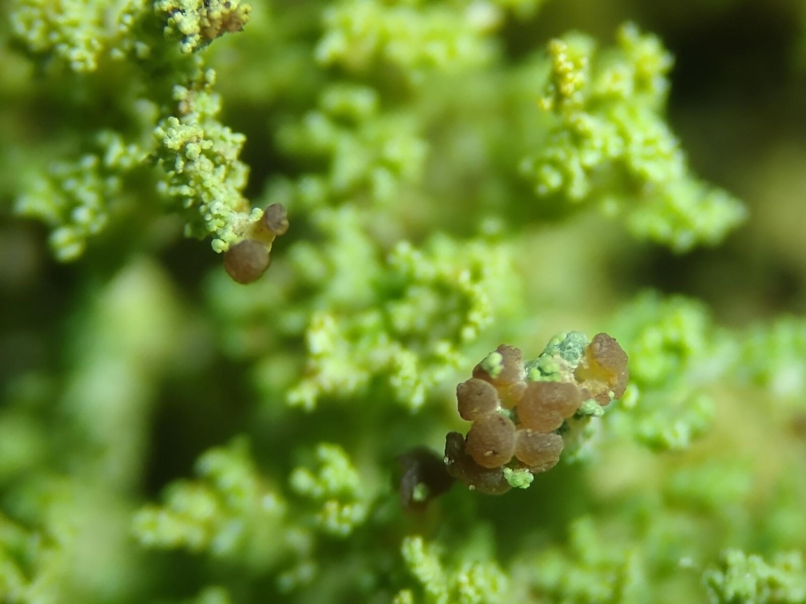 Die einzelnen Podetien sind nur wenige Millimeter hoch (5-8mm) und von vergleichsweise dicken, braunen Fruchtkörpern gekrönt: