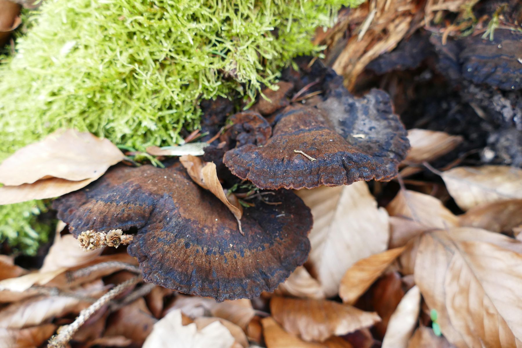 Eine Gruppe auffälliger alter, dunkelbraun-schwarz getreifter Porlinge im Wurzelbereich (verm. unbestimmbarr, zu alt)