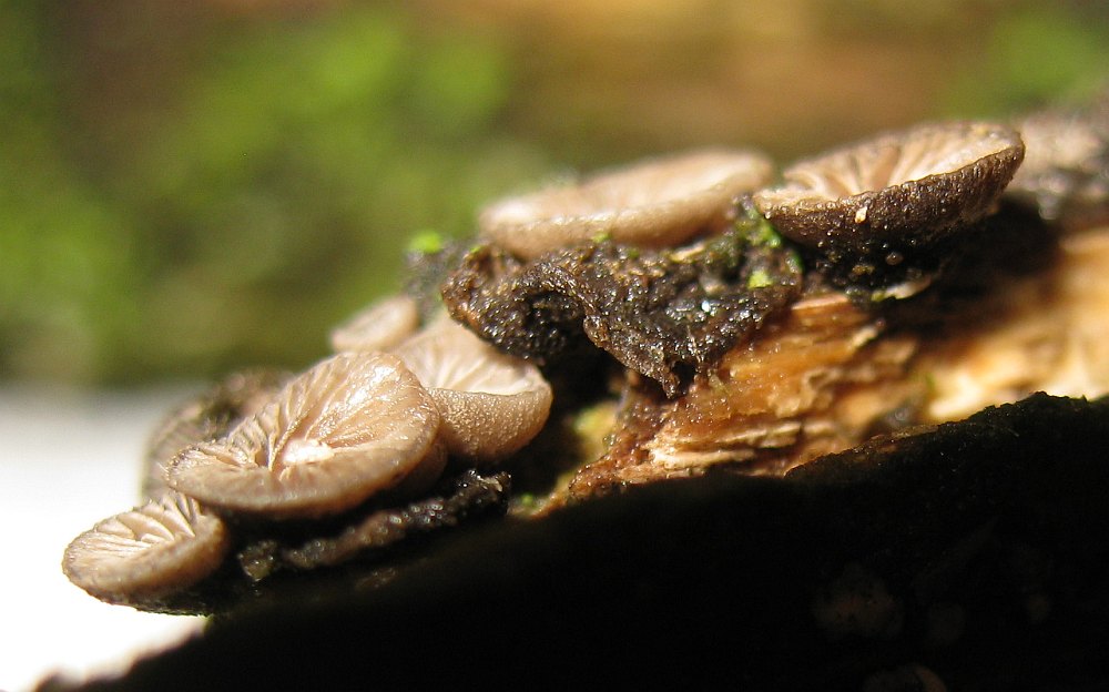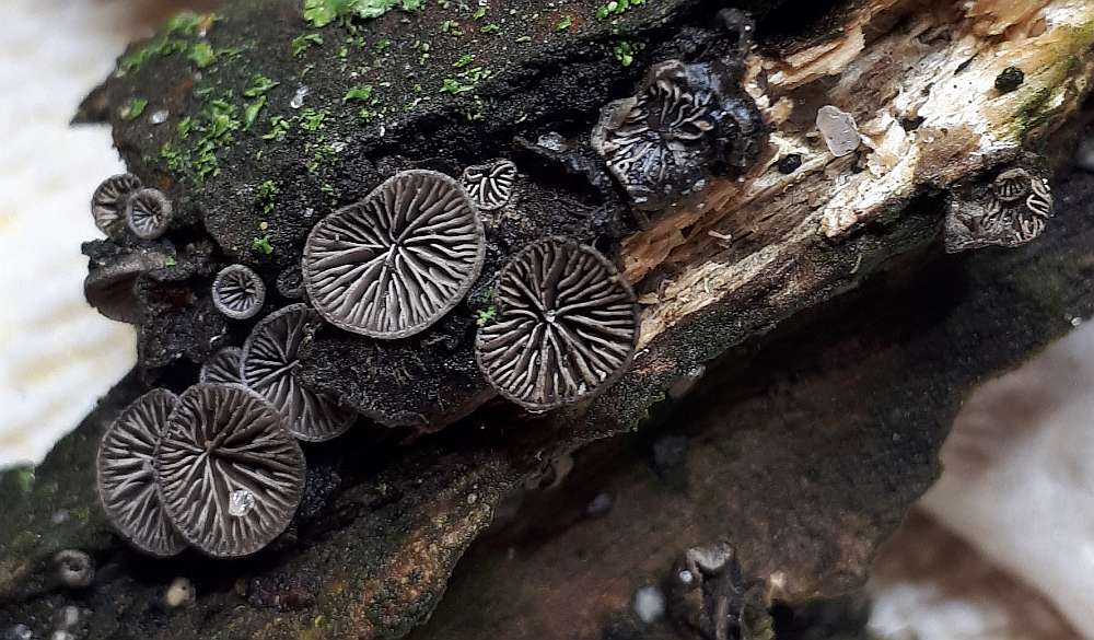 Resupinatus hat ja sehr viele Arten. Wie viele davon sind wohl dunkelgrau und kommen in Norddeutschland vor? 4 mm Hutdurchmesser passen leider nicht zu Resupinatus applicatus.Die Unterseite kommt mir eher körnig denn behaart vor. Ich versuche morgen noch einmal bessere Fotos zu machen. Aber ein Resupinatus sp. ist für mich auch ok.