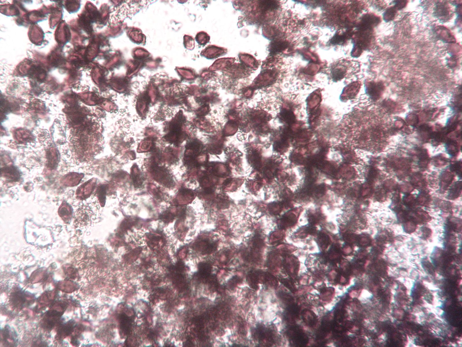 Die Sporen messen 15,95 x 8,45 / 13,59 x 8.99 / 15,22 x 6,91 / 15,96 x 8,84 / 15,91 x 9,31 (µm)