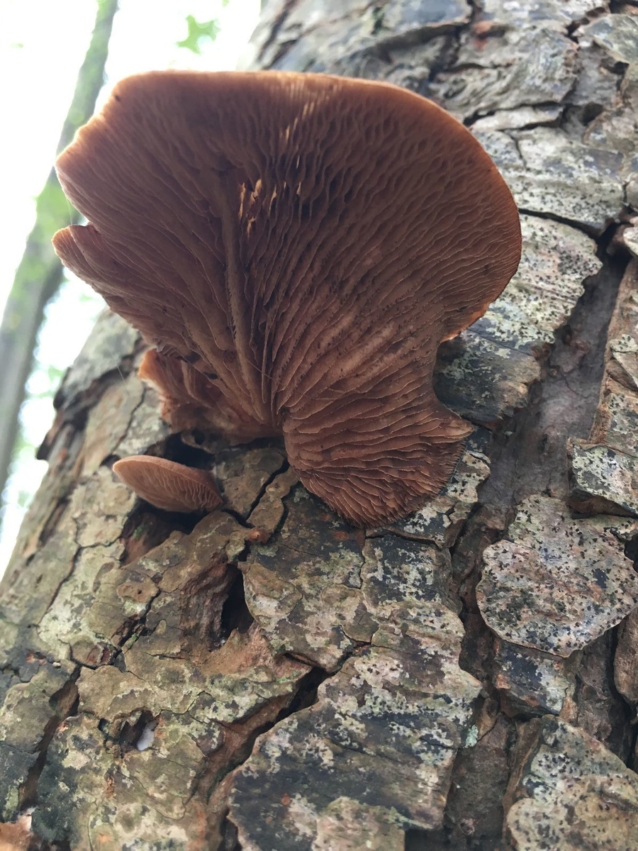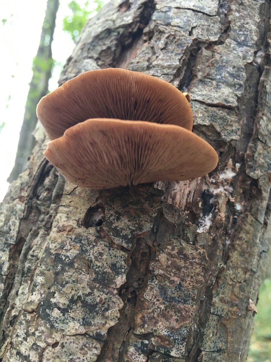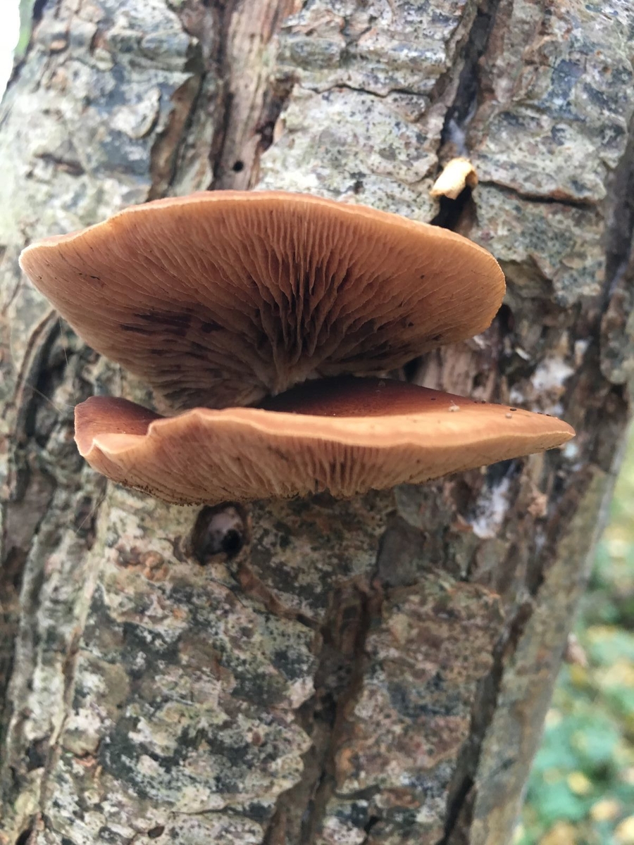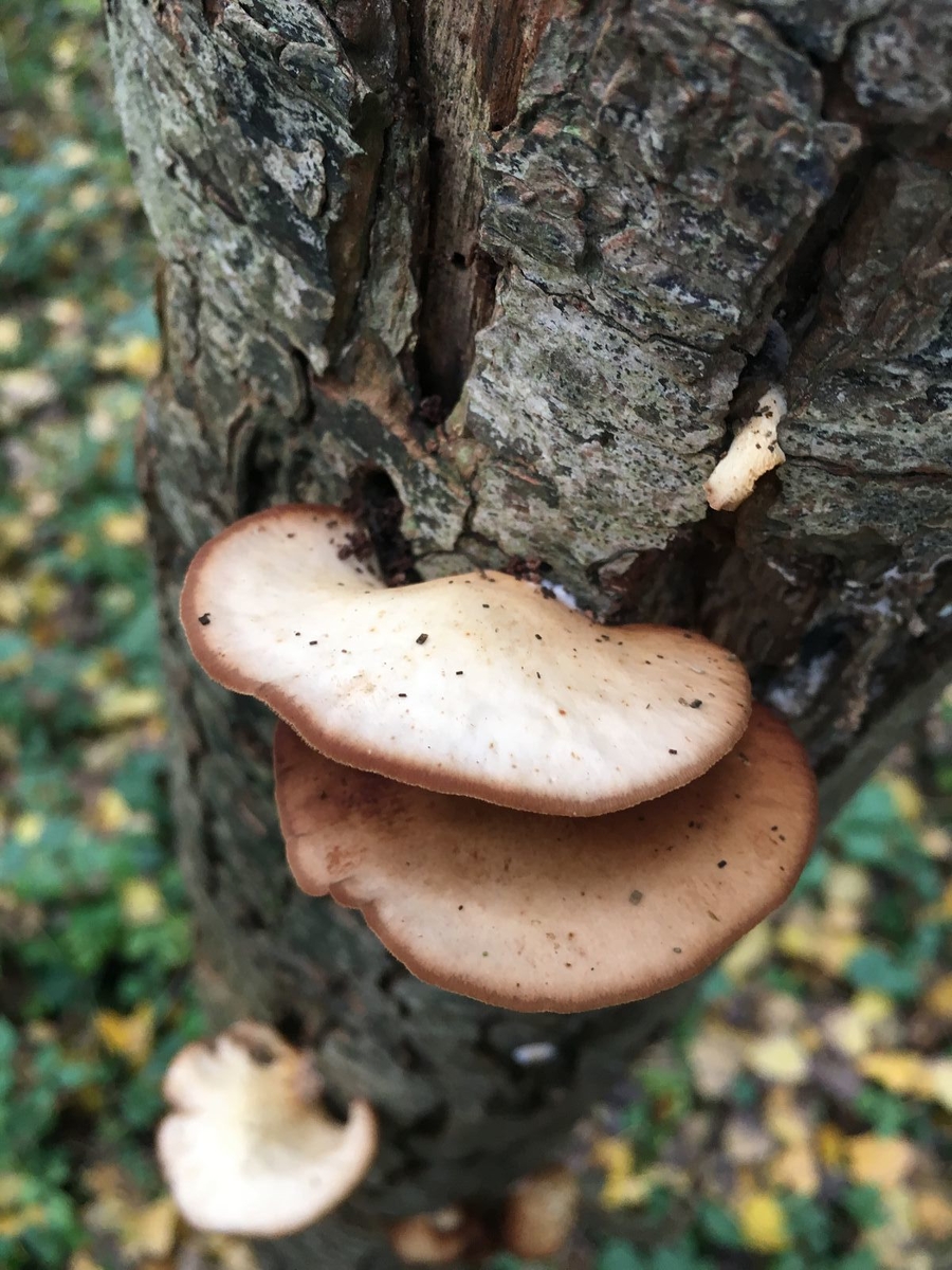Da könnte ich mir gut eines der Stummelfüßchen (Crepidotus) vorstellen. Bei dem Verdacht müsste man die Huthaut prüfen, ob die sich abziehen lässt und ebenso dehnbar und gummiartig wie die vom Dehnbaren Helmling ist. Wenn ja, dann wär's Crepidotus mollis (Gallertfleischiges Stummelfüßchen), ansonsten eine der anderen Arten mit Tendenz große Fruchtkörper zu bilden. Da käme dann das Mikroskop mal wieder zum Einsatz.