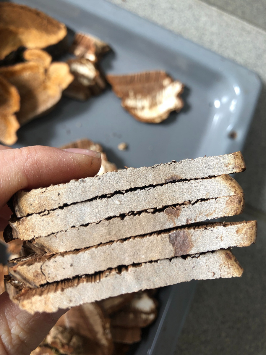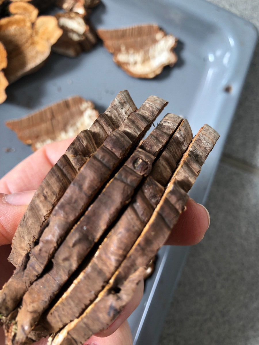 Ich habe den Pilz zuerst äußerlich für einen Zunderschwamm gehalten, er ist braun, in „Stufen“ von oben nach unten hin breiter werdend im Durchmesser. Nur im Schnittbild sieht er ganz anders aus.