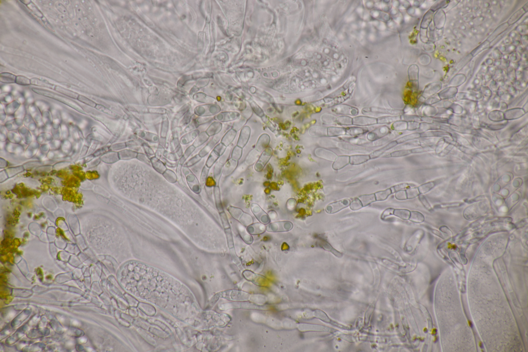 4. Candelaria concolor, hier ausnahmsweise mit Apothecien, was die Unterscheidung von der achtsporigen Schwesterart Candelaria pacifica einfach macht.