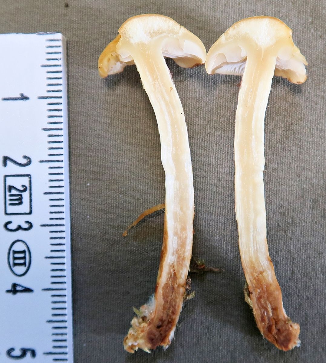 Stiel: oben helles gelb, nach unten deutlich brauner werdend, längs etwas dunkler braun gestreift