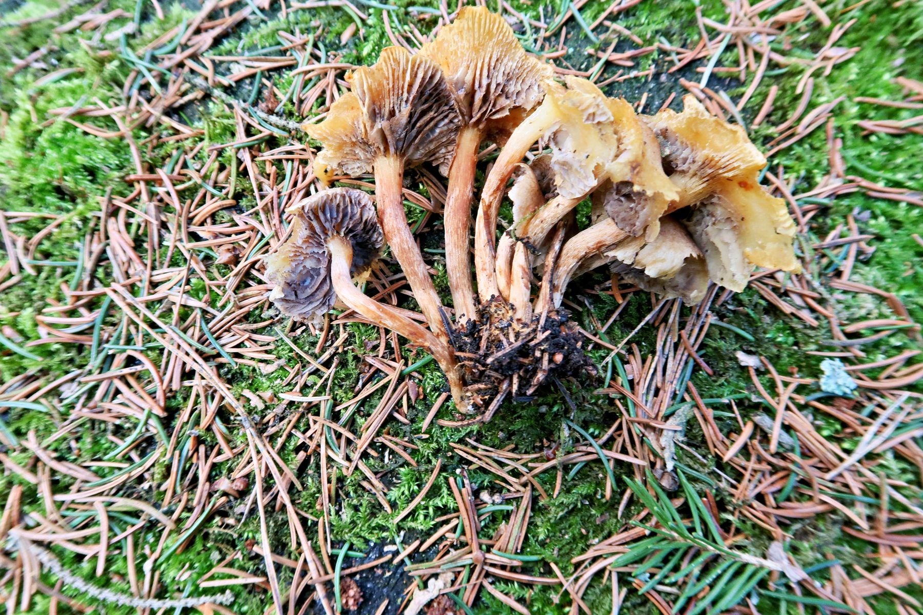 kleiner, gelblicher, büschelig wachsender Pilz im Fichtenwald