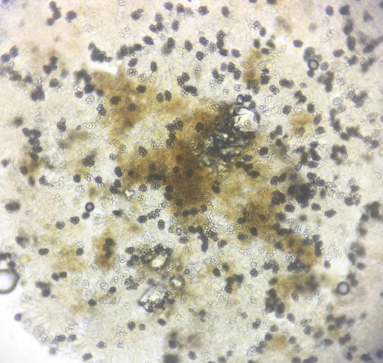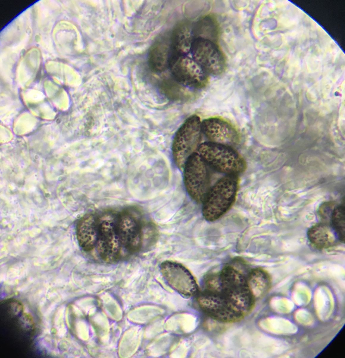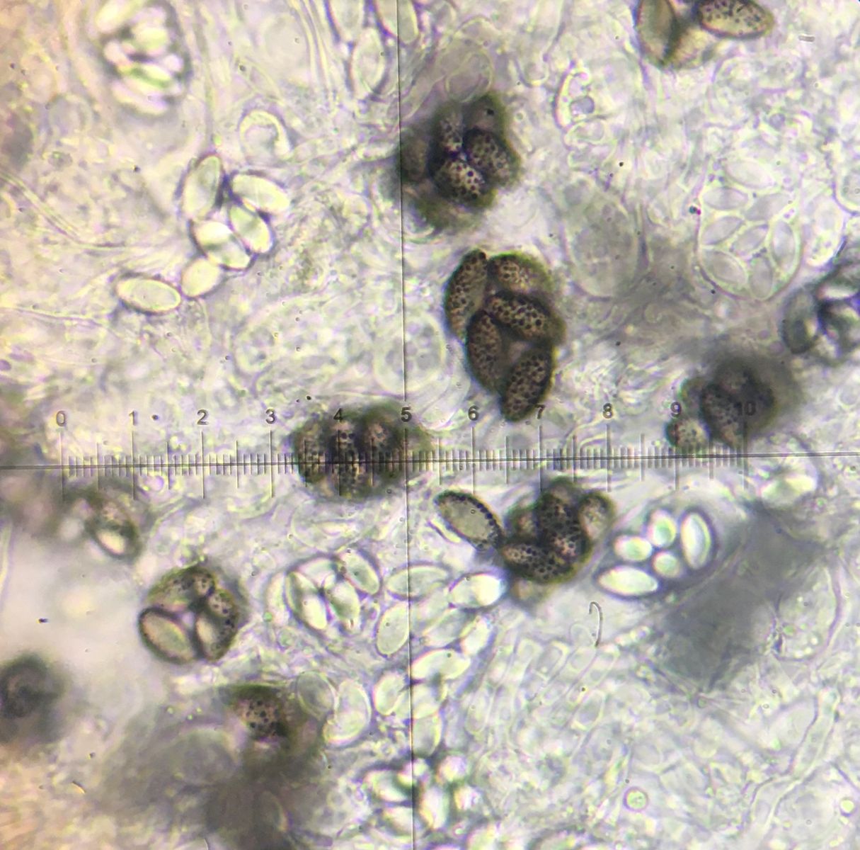 Fruchtkörper sind vielleicht 0.1mm, die Sporencluster sind bis zu 20µm groß und eher kloßförmig als länglich. Sporen sind 10-11µm x 6µm.