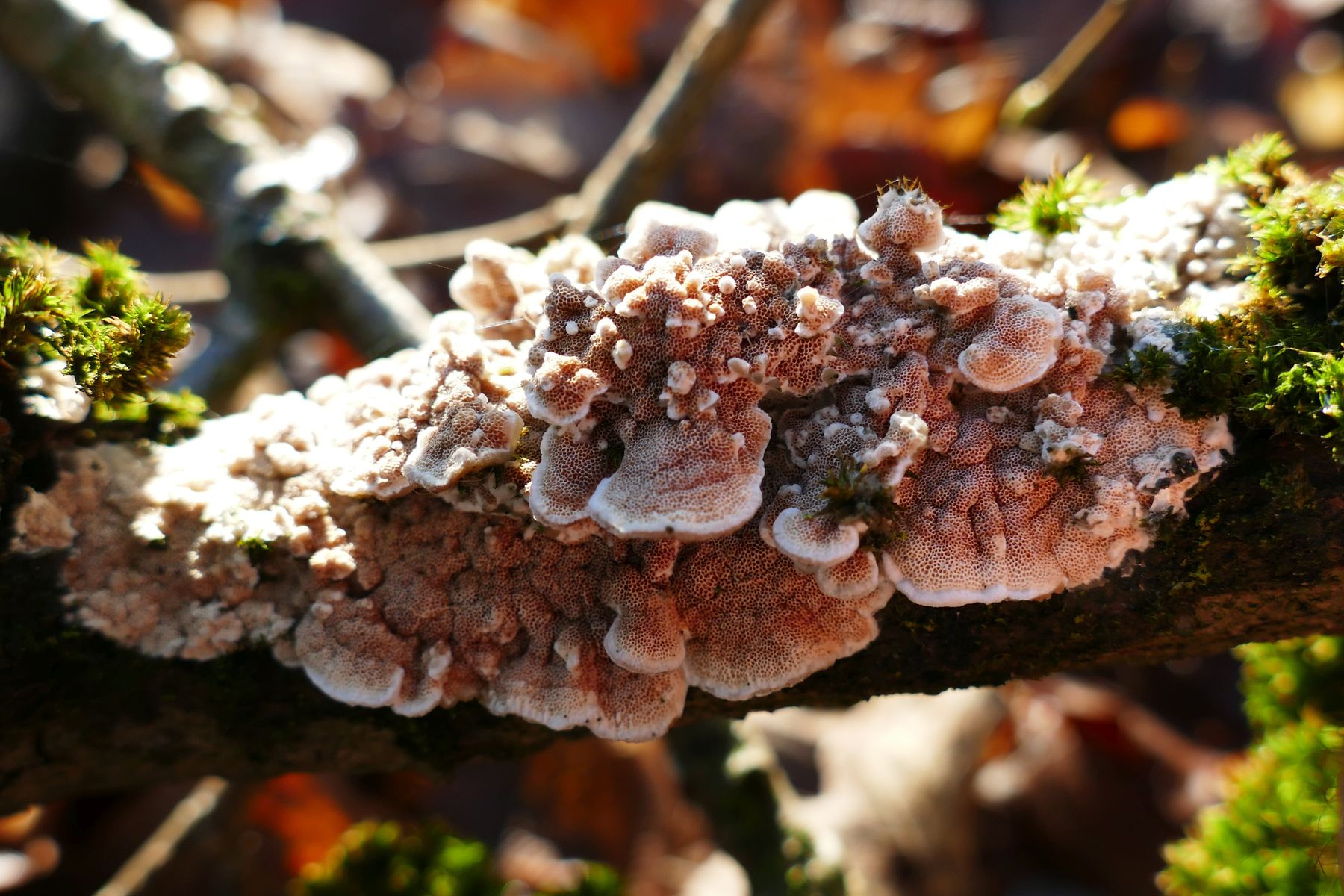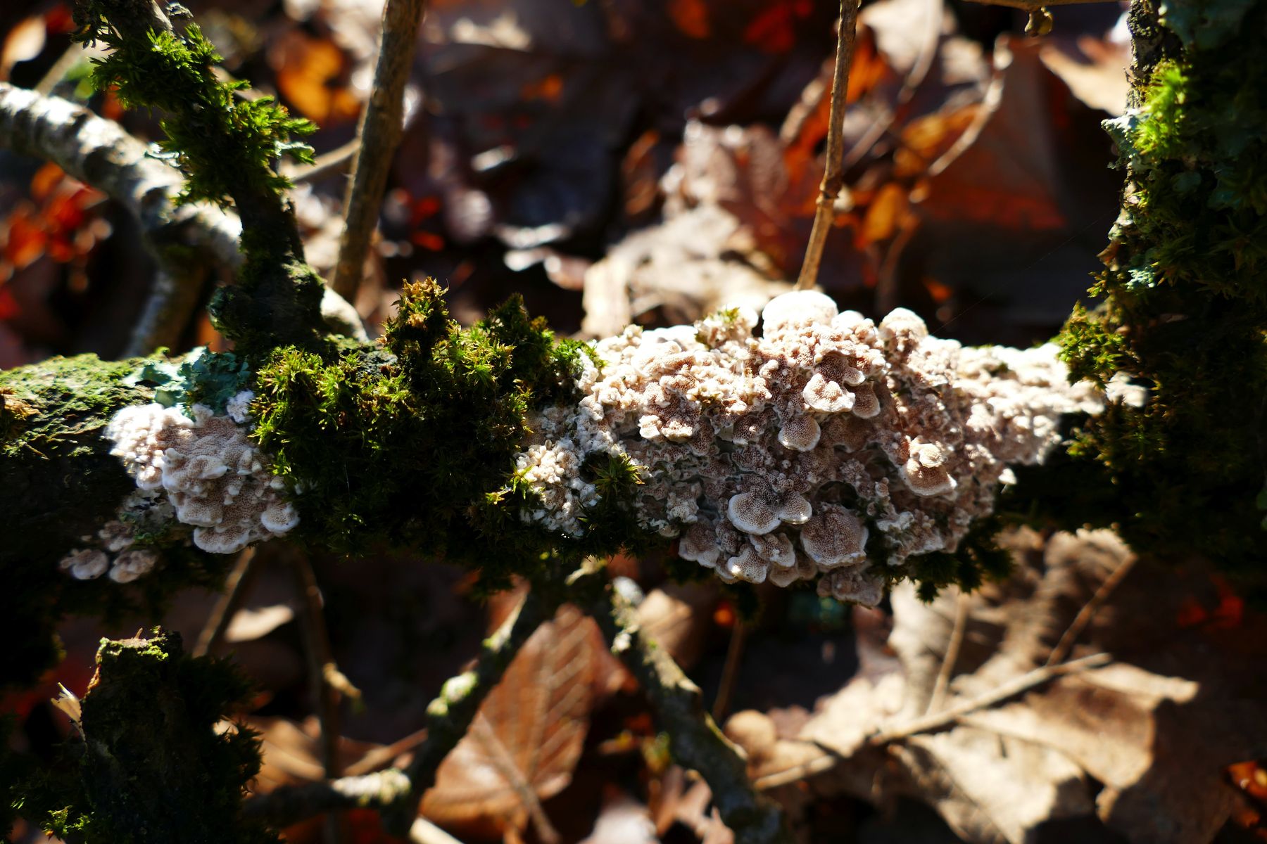 Im Laubwald (Eiche, Hasel, Buche, ...) weckte ein stark bemooster, auf dem Boden liegender Ast mein Interesse: