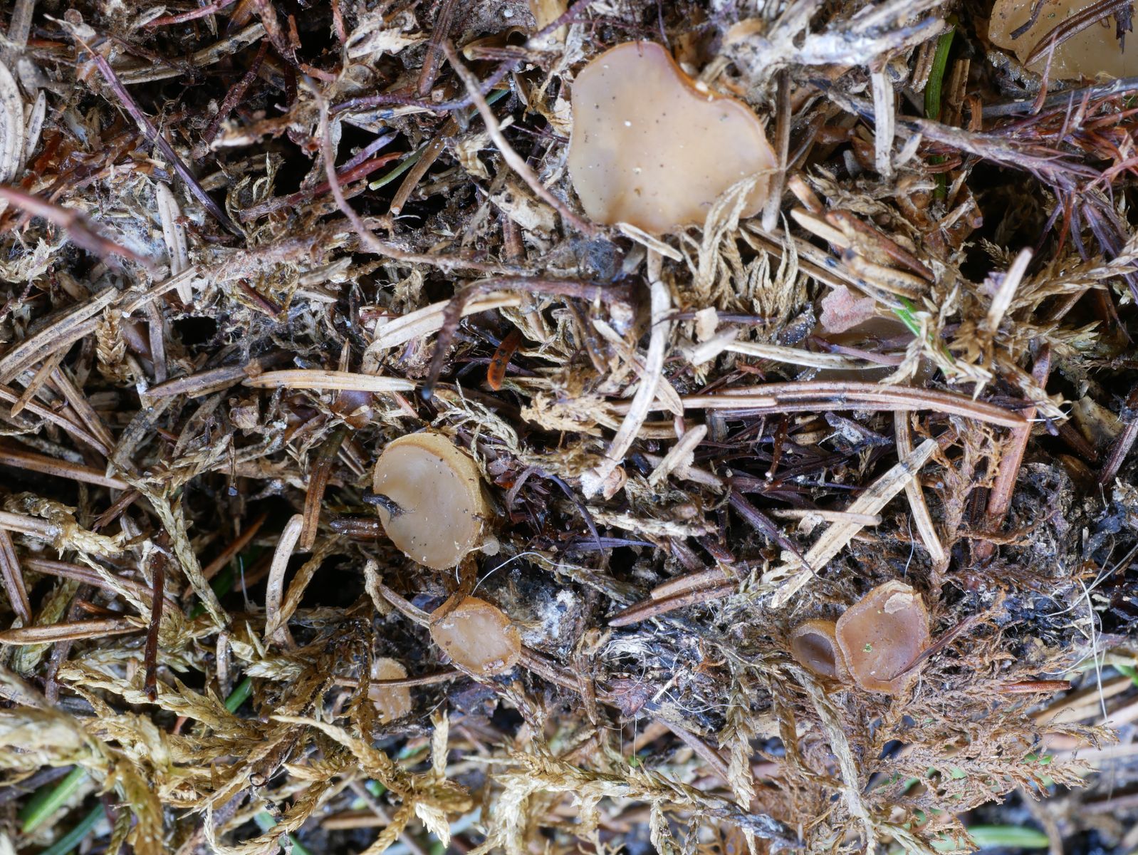am Montag habe ich in einem Fichtenwald im Moos (darunter Wurzel?) eine Peziza spec. gefunden, die ich im Buchenwald wahrscheinlich als Peziza arvernensis angesprochen hätte. So bin ich einigermaßen ratlos und bitte um Euere Hilfe.