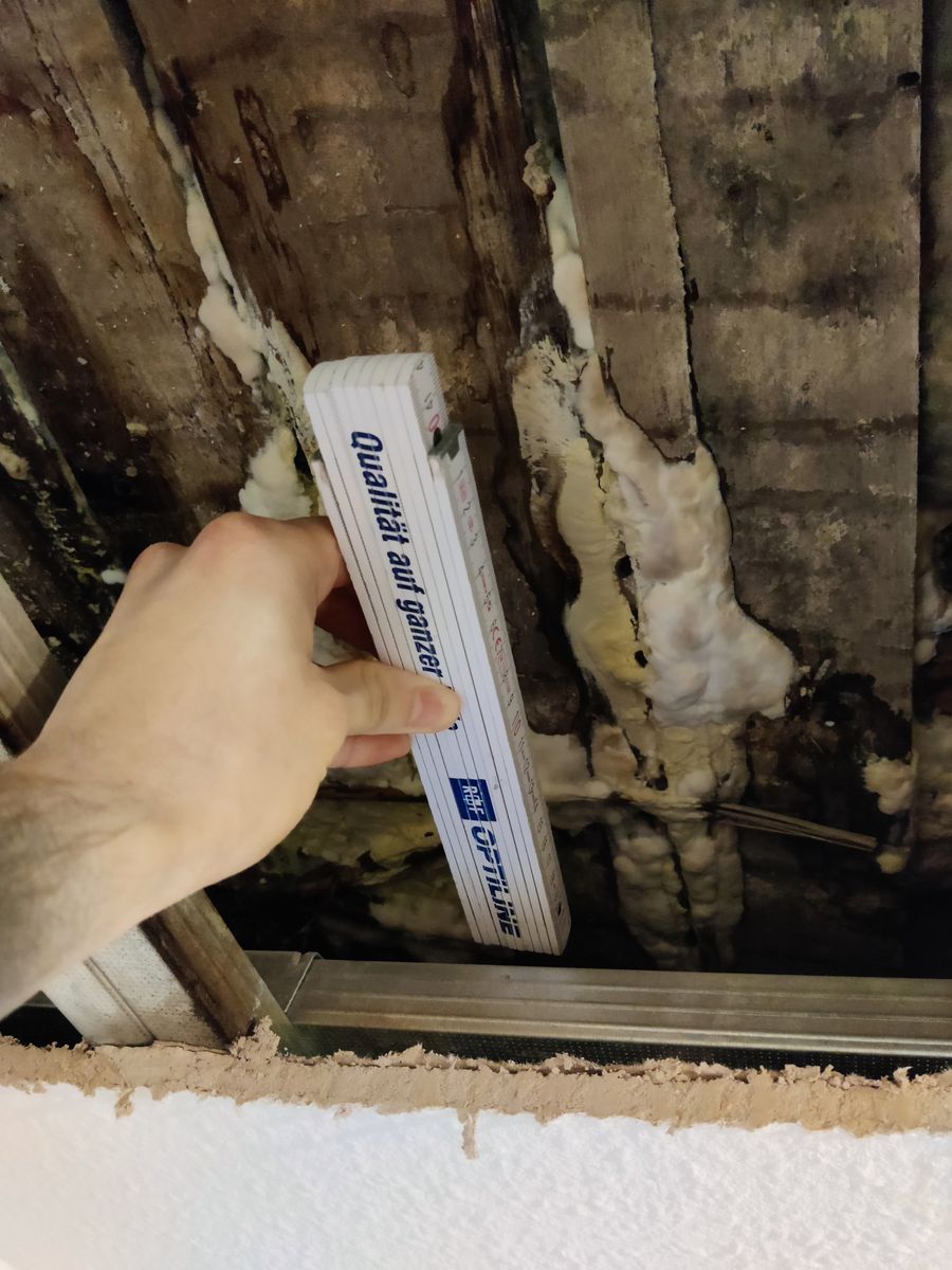 Die Decke besteht aus Holz und ist aufgrund eines Rohrbruchs auch durchgehend feucht/nass.