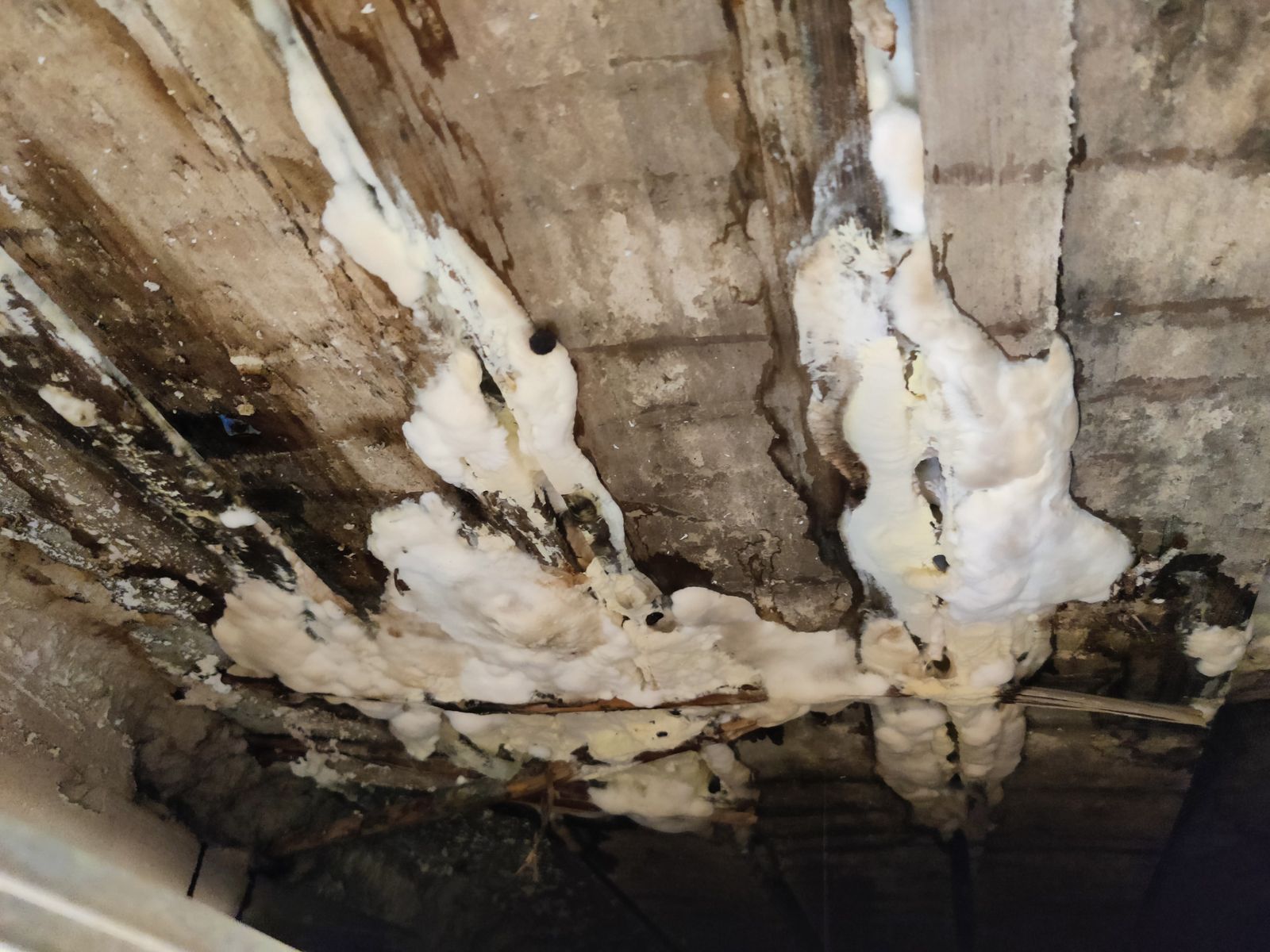 Die Decke besteht aus Holz und ist aufgrund eines Rohrbruchs auch durchgehend feucht/nass.