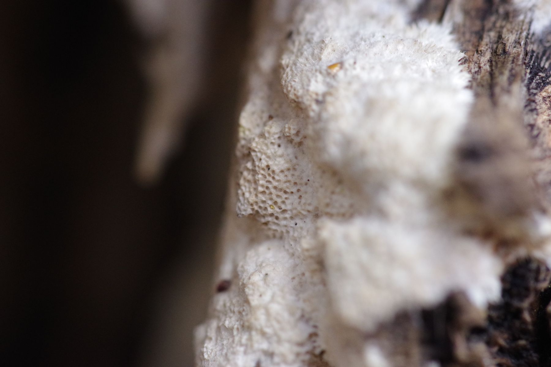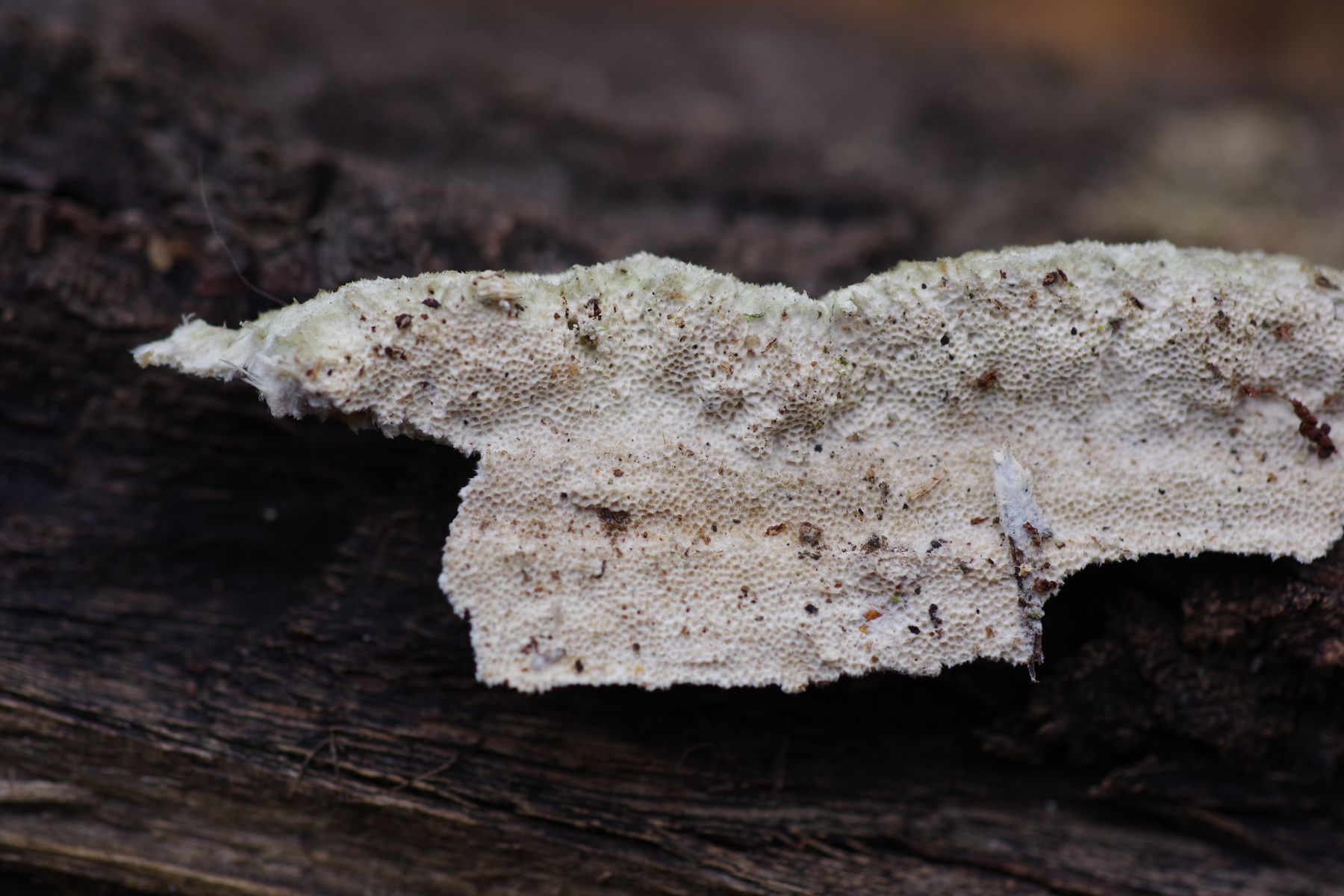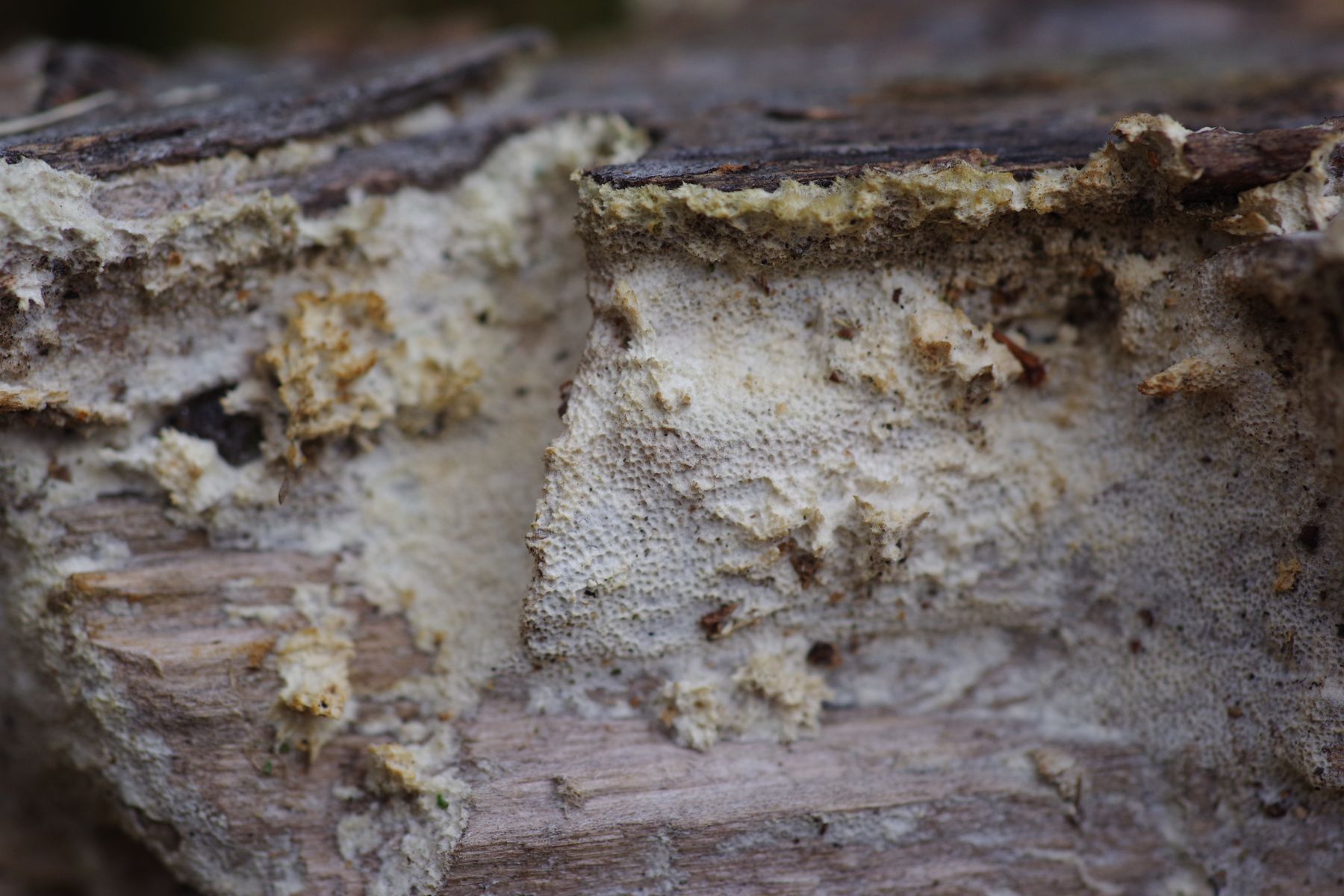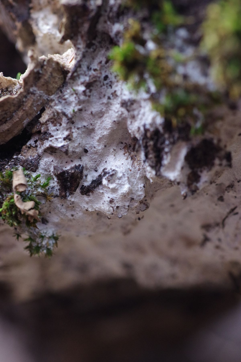 Die Zitterpappel ist vielleicht 3 Jahre tot, der Oberteil im vergangenen Frühling abgebrochen. An der Bruchstelle dieses Oberteils herauflaufend stellenweise ein weißer Pilz, der überwiegend resupinat ist, aber teilweise im oberen Bereich kleine Konsolen bildet. Dann oberseits filzig. Lässt ich im Stück wie Gummi abziehen. KOH keine Farbveränderung. Poren etwa 2-3 je mm, Poren nur kurz ~0,5 mm.