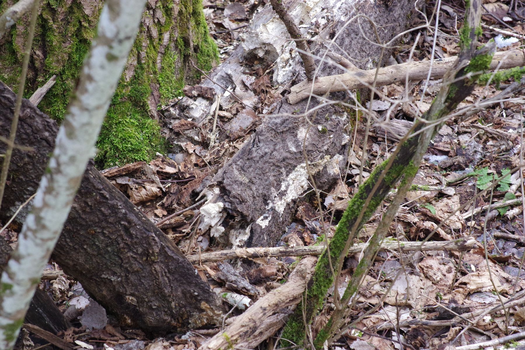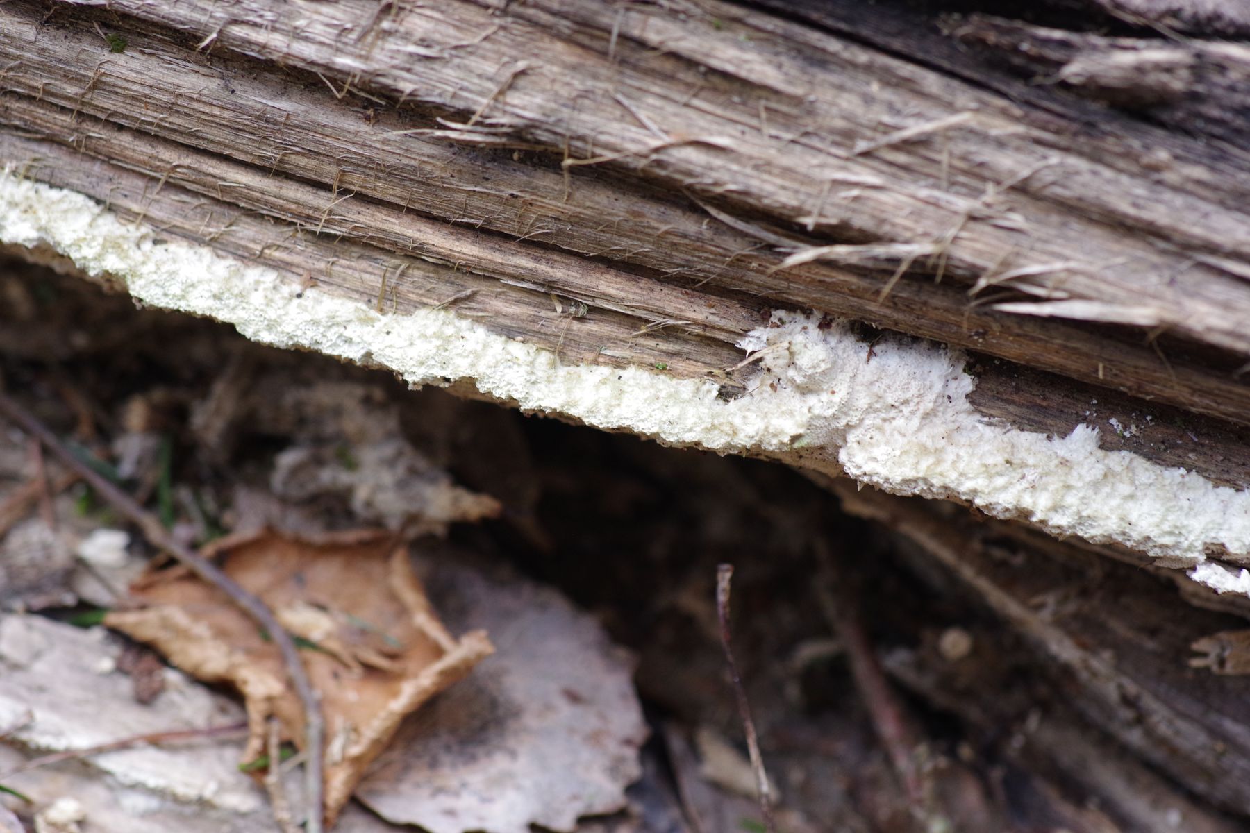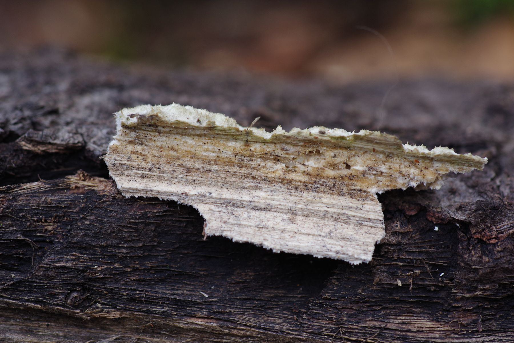 Die Zitterpappel ist vielleicht 3 Jahre tot, der Oberteil im vergangenen Frühling abgebrochen. An der Bruchstelle dieses Oberteils herauflaufend stellenweise ein weißer Pilz, der überwiegend resupinat ist, aber teilweise im oberen Bereich kleine Konsolen bildet. Dann oberseits filzig. Lässt ich im Stück wie Gummi abziehen. KOH keine Farbveränderung. Poren etwa 2-3 je mm, Poren nur kurz ~0,5 mm.