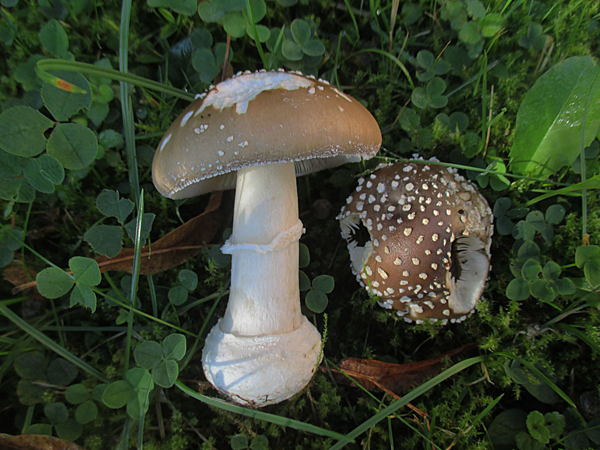 Also, ich tippe auf Pantherpilz, ansonsten Grauer Wulstling oder was mit dem rosa Ton einhergehen würde, Perlpilz.