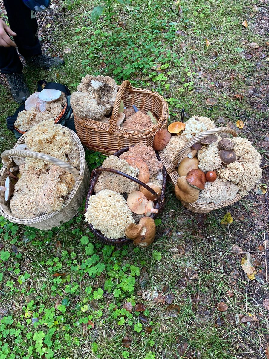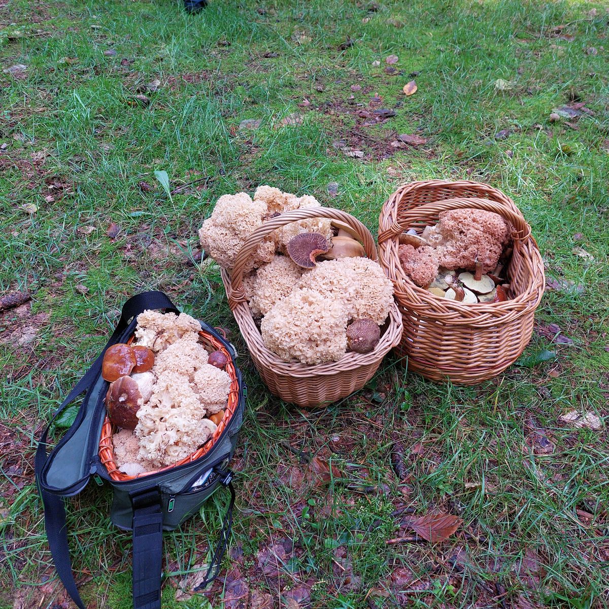 Um es kurz zu machen. Bei 40! krause Glucken haben wir aufgehört zu zählen bzw. den Faden verloren. Es gab Steinpilze, Maronen, Goldröhrlinge, einige Reizker, Kupferrote Gelbfüße, Rotfußröhrlinge, Schopftintlinge, Stockschwämmchen... hab ich noch was vergessen ...paar Birkenpilze. Viel Sachen haben wir gesehen, Täublinge, Hundsrute, Tintlinge, Lungenseitlinge.