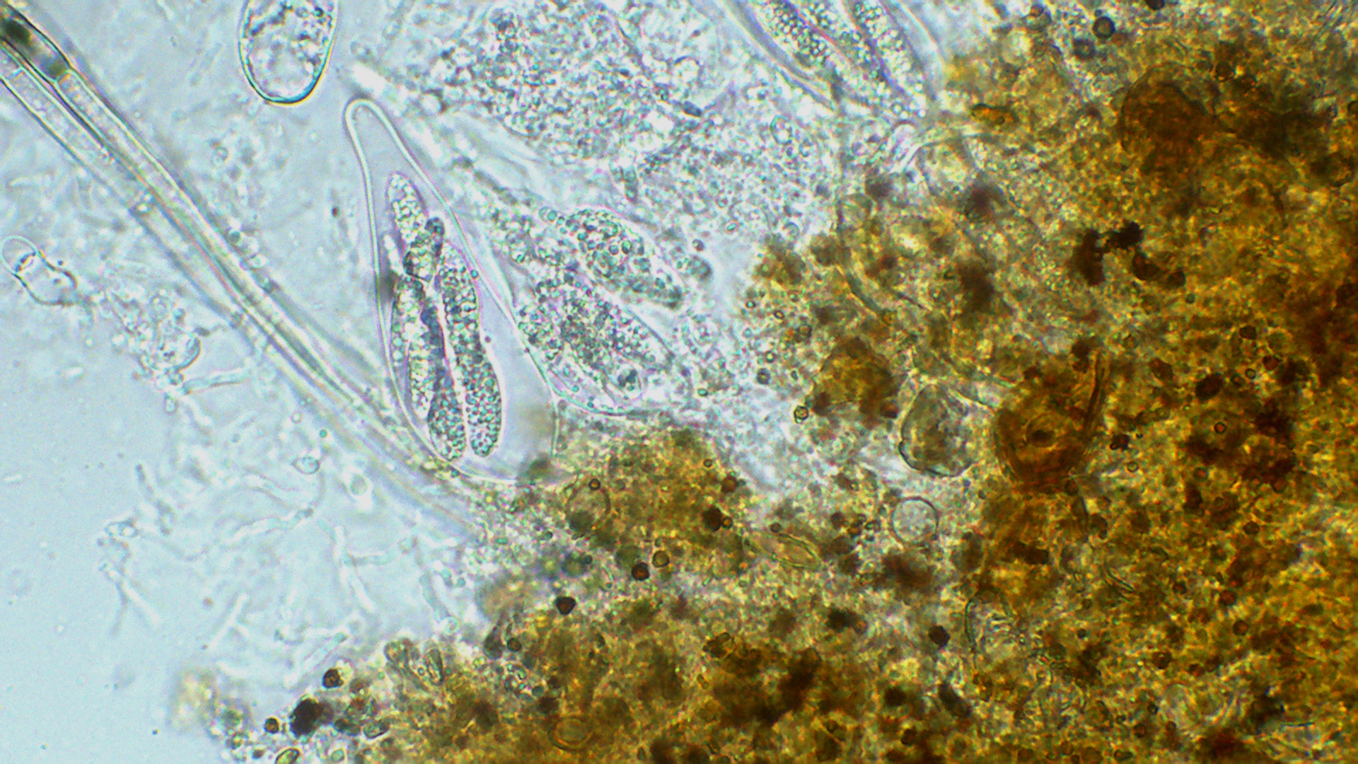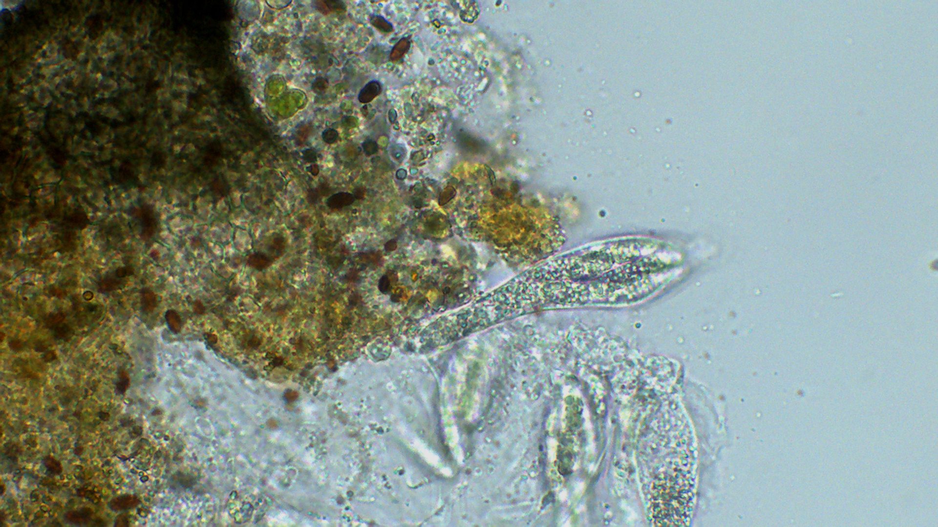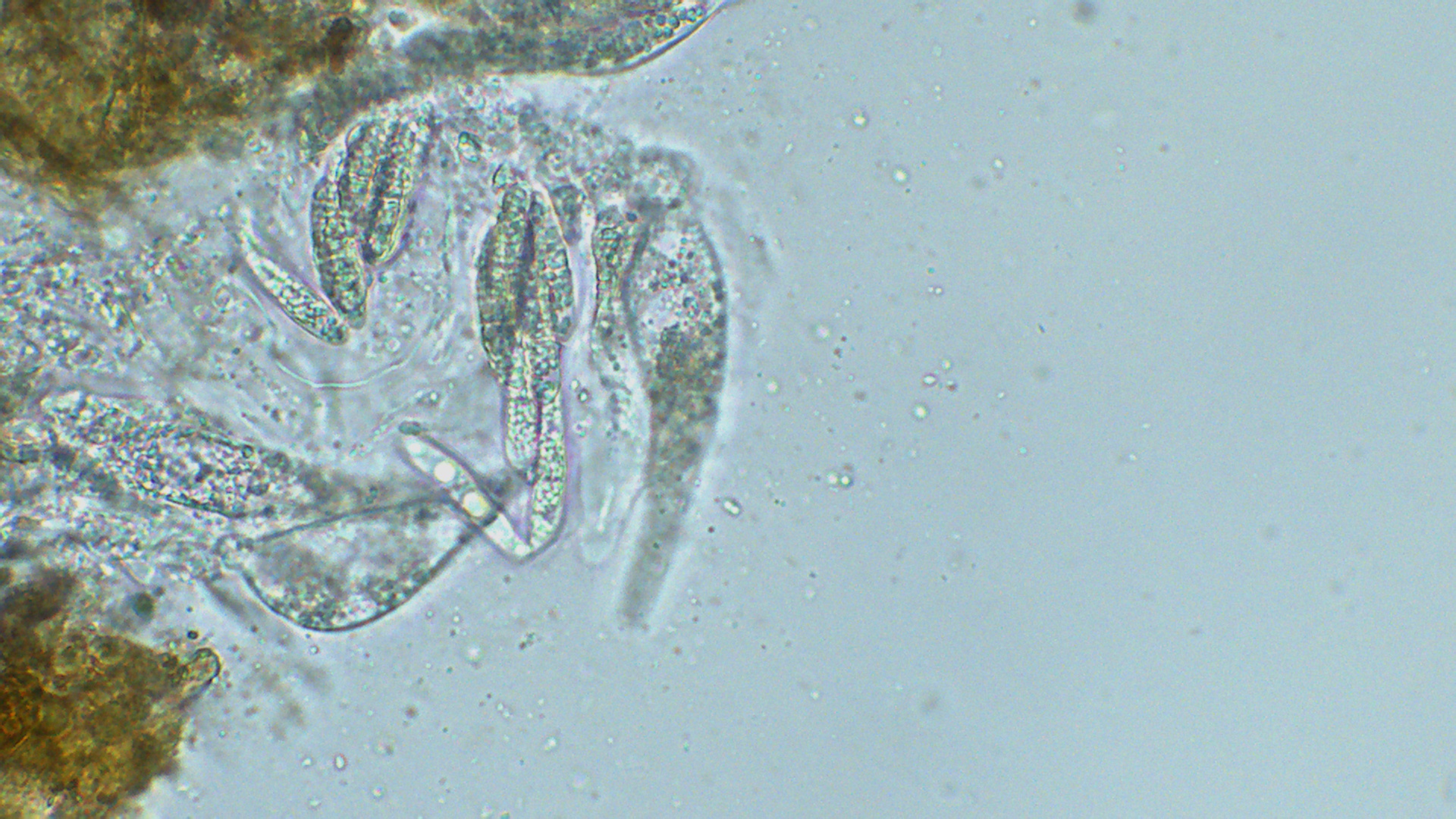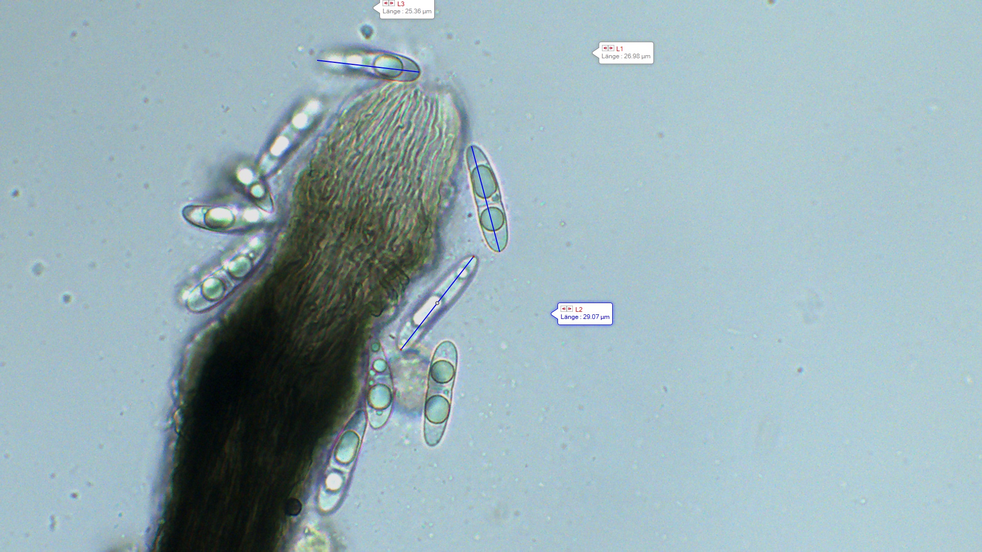 Irgendwie erinnert er an Pyxidiaphora, aber meine Sporen scheinen insgesamt zu klein für diese Gattung zu sein. Allerdings bin ich mir auch nicht sicher, ob meine Sporen wirklich ausgewachsen sind, obwohl einige bereits den Ascus verlassen hatten und am Halsende zu finden waren. (Nun, dann müssten sie ja eigentlich ausgewachsen sein....)