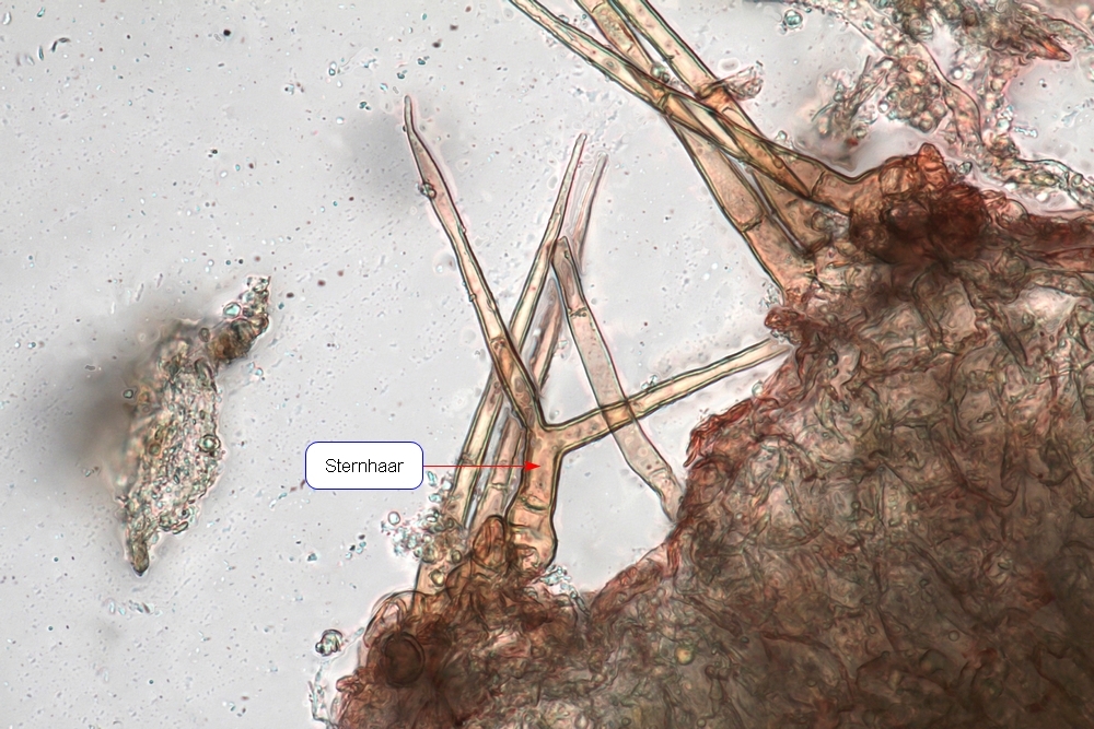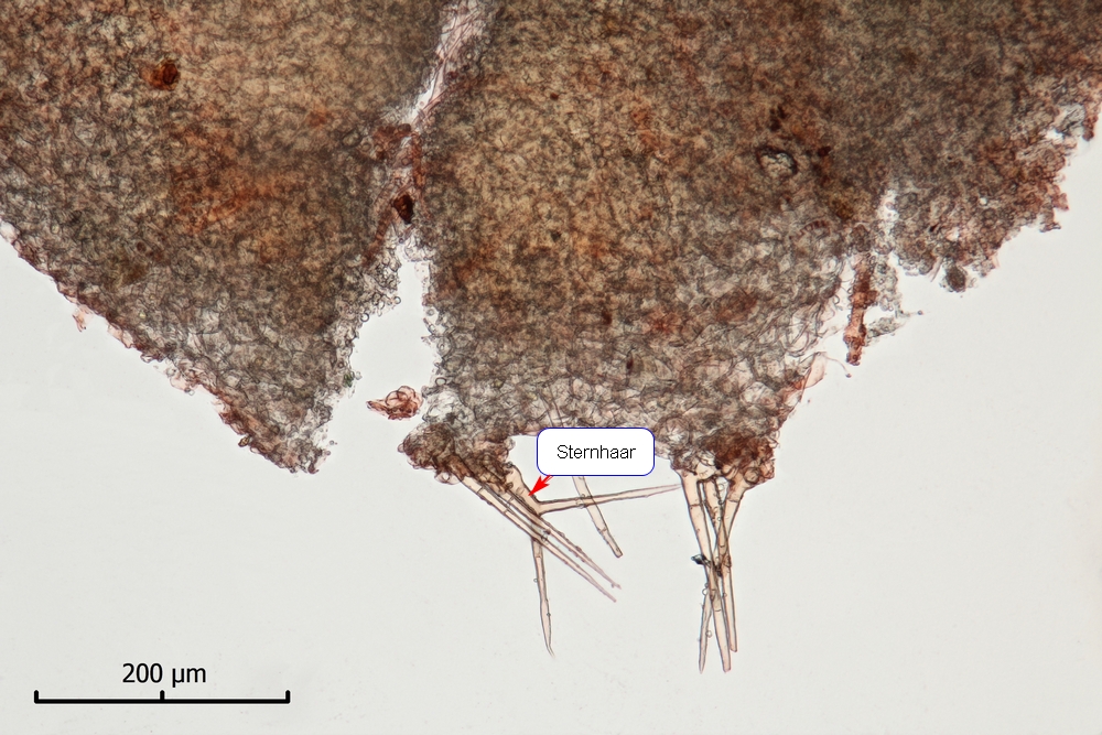 Die beiden folgenden Bilder zeigen die Haare. Bild 6 die dickwandigen, spitz zulaufenden echten Haare mit einer länge von bis zu 400 µm, einer Breite von 8-10 µm, einer Wandstärke von 2 µm und einer knolligen Basis von z.B. 25 µm Durchmesser. In Bild 7 sind mehrere dickwandige echte Haare sowie einige etwa 2 µm breite, dünnwandige, hyaline, multiseptierte Haare zu sehen: