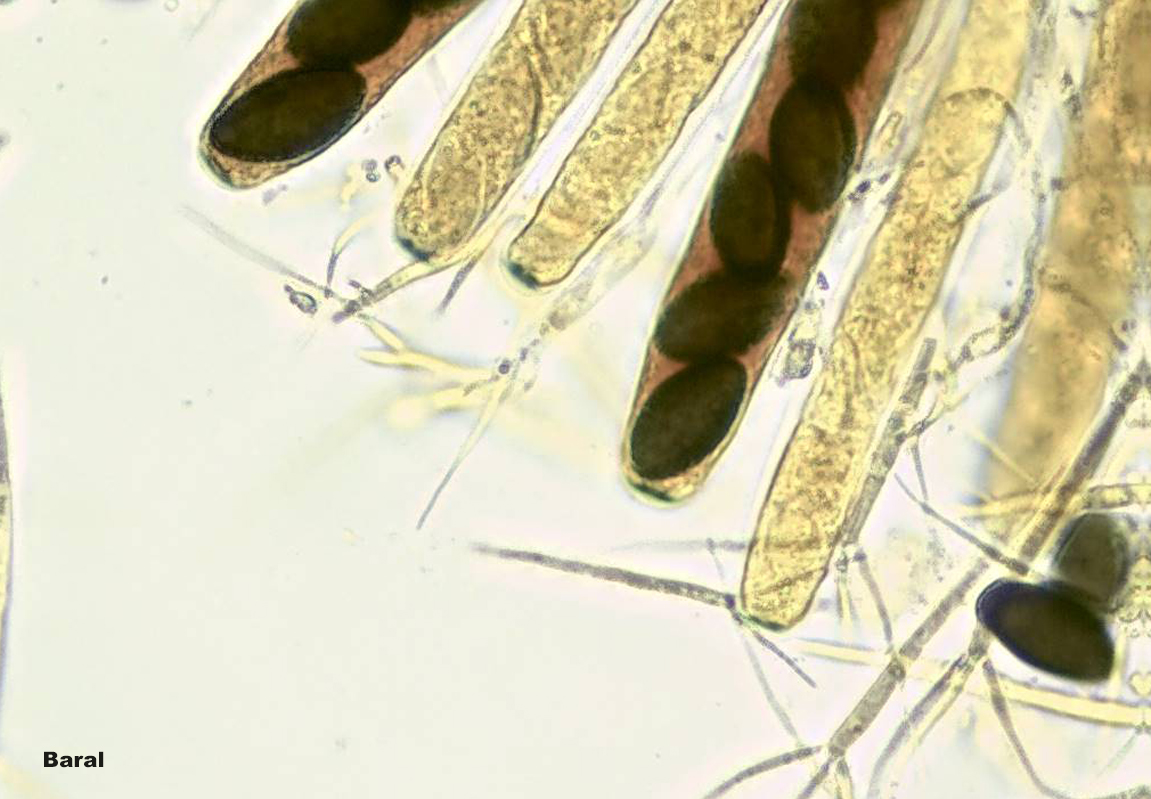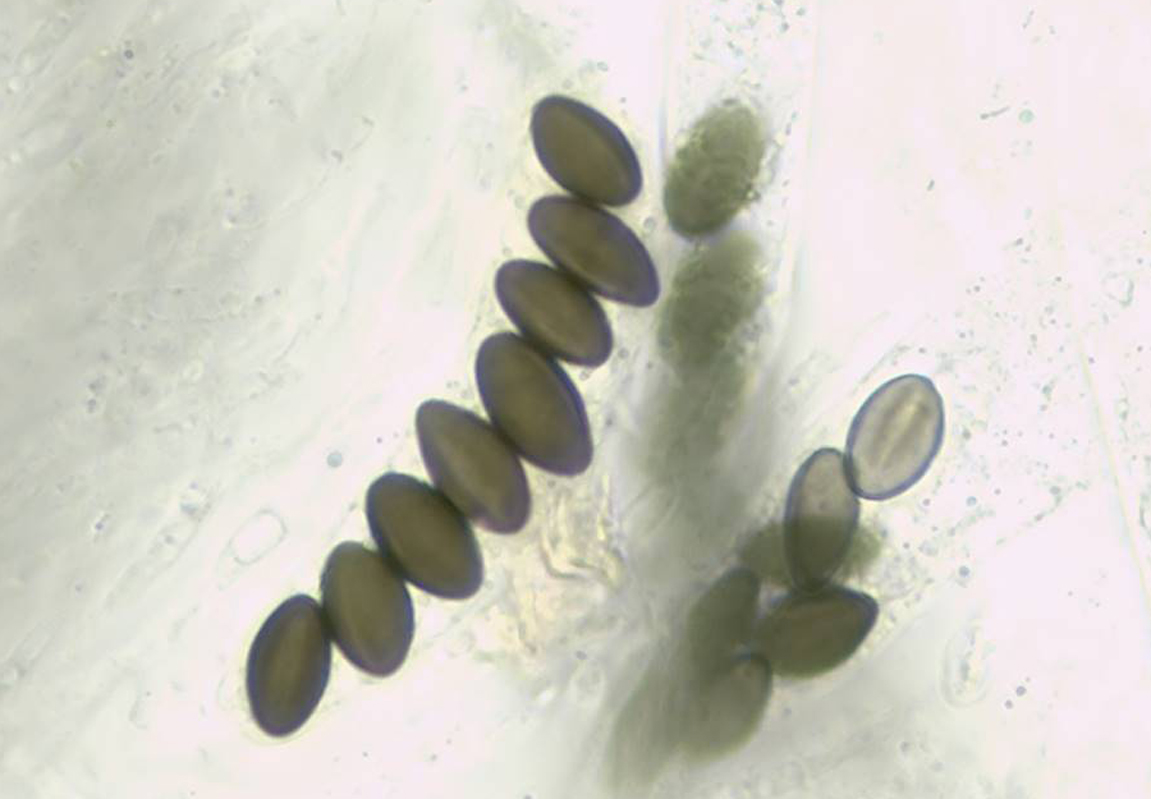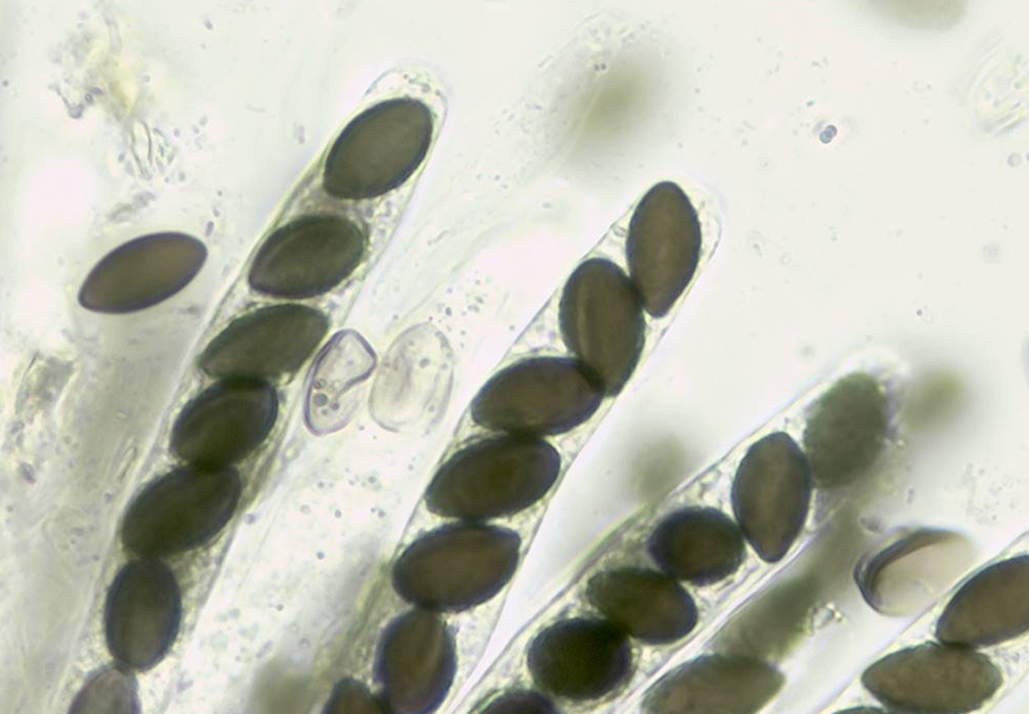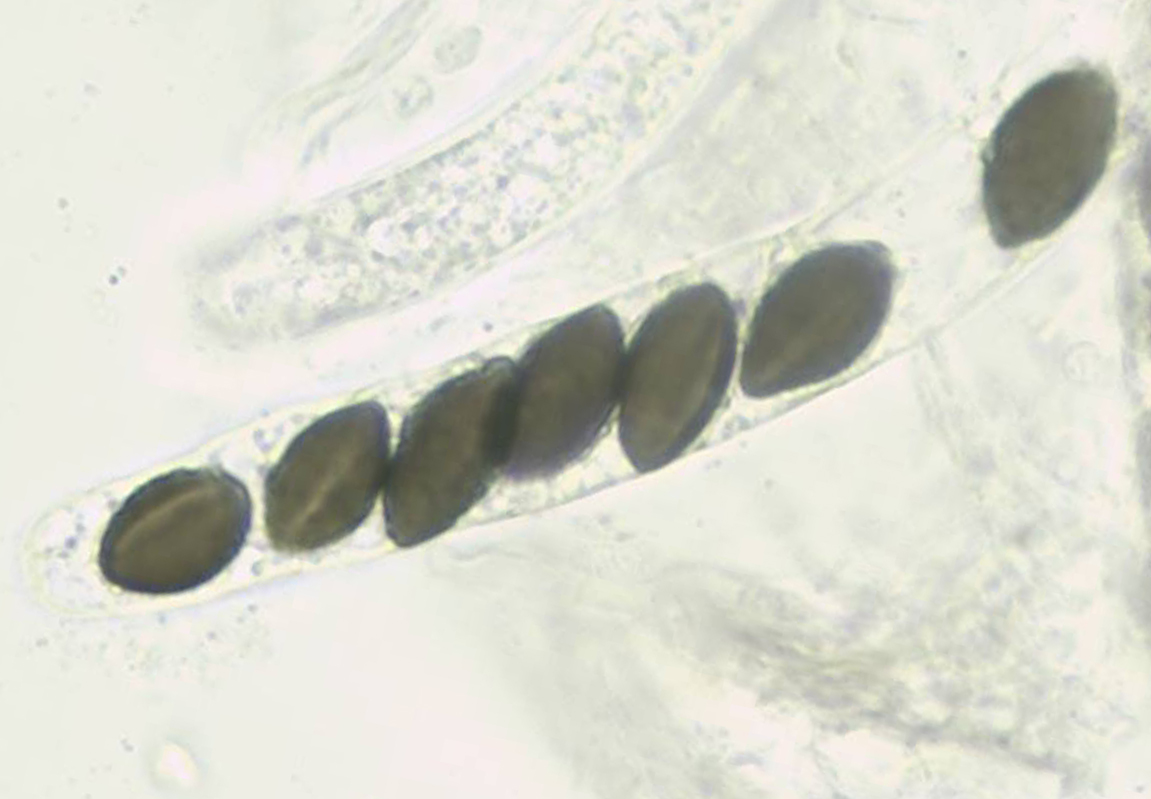 Da die Sporen eine deutliche Keimspalte von Pol zu Pol besitzen, dachte ich zunächst an eine Coniochaeta. Die Perithecien (320-350 x190-200) haben allerdings keine Randhaare.