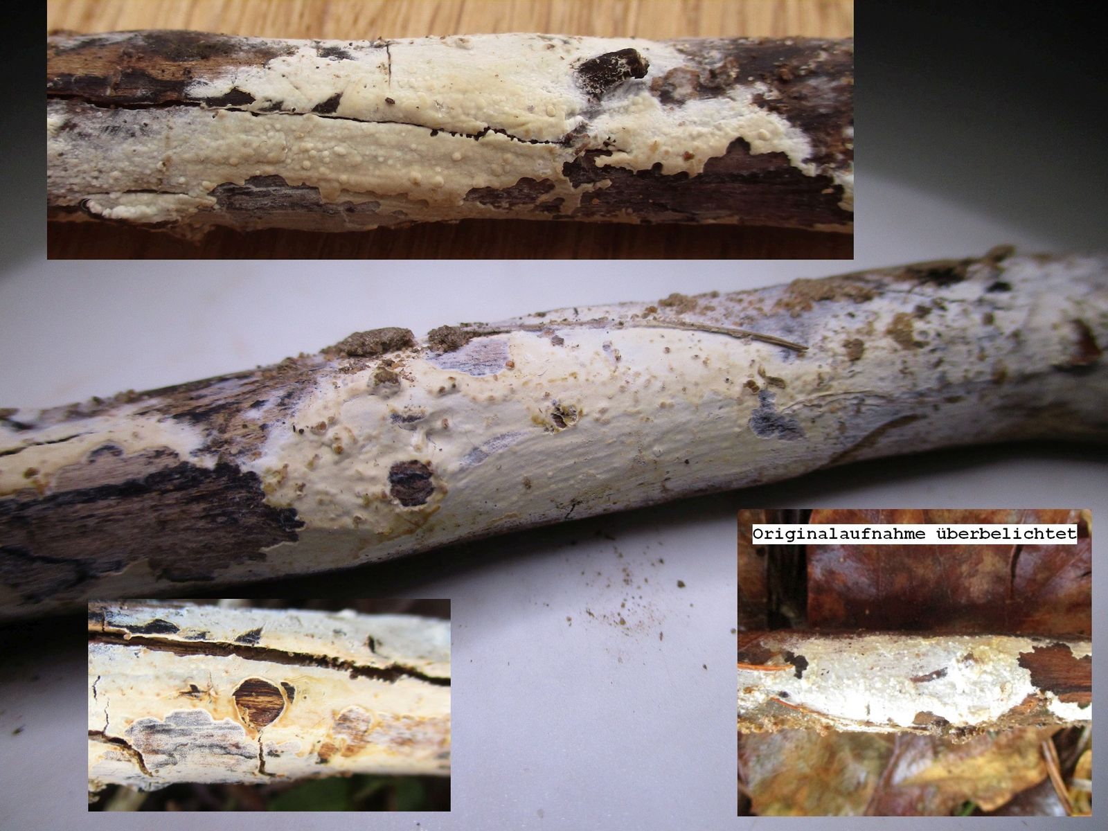Ein Rindenpilz, den ich nach E+Ryv. Cort. North Vol3 im Umfeld der Hyphoderma roseocremeum Gruppe vermute.
