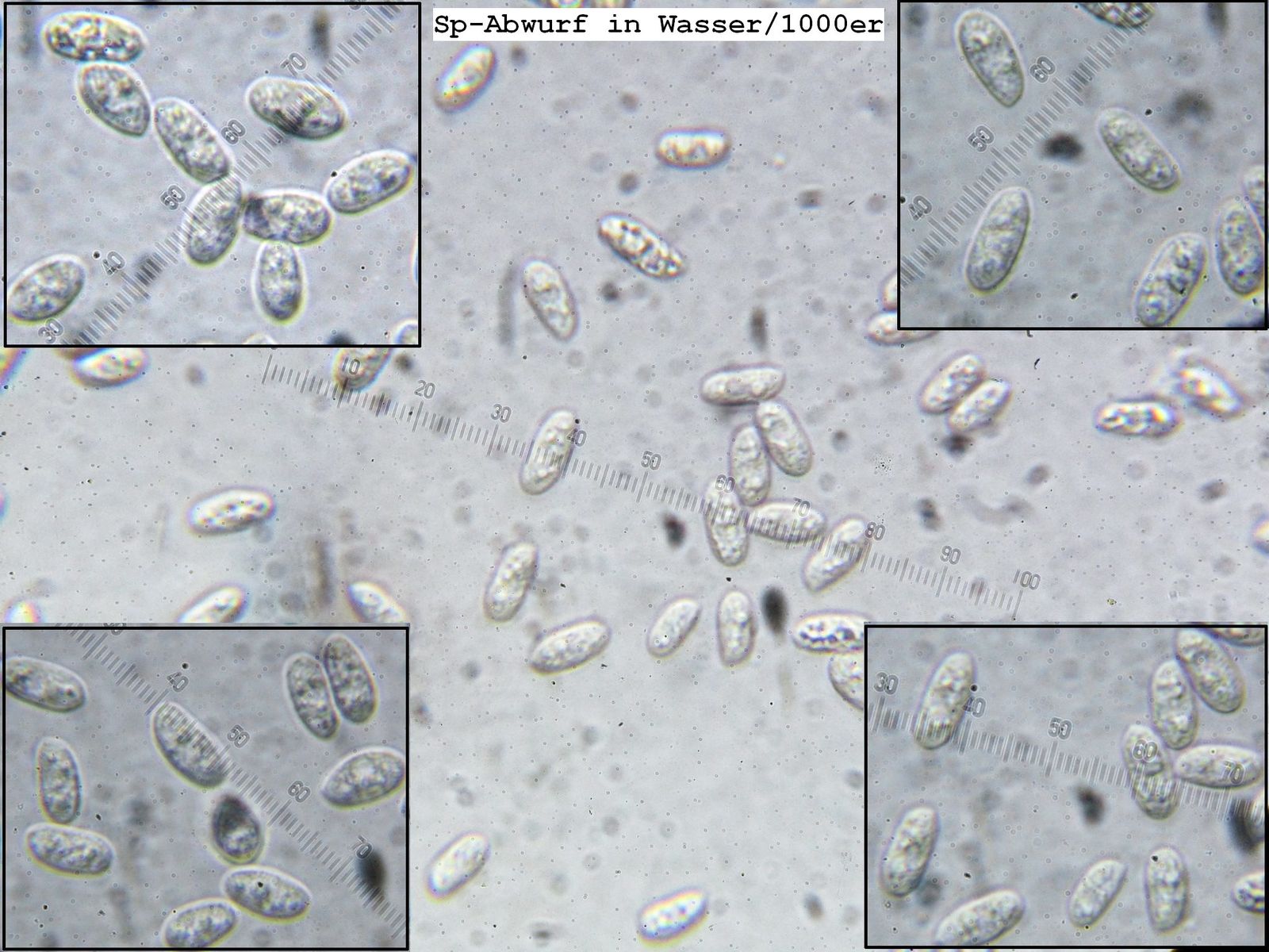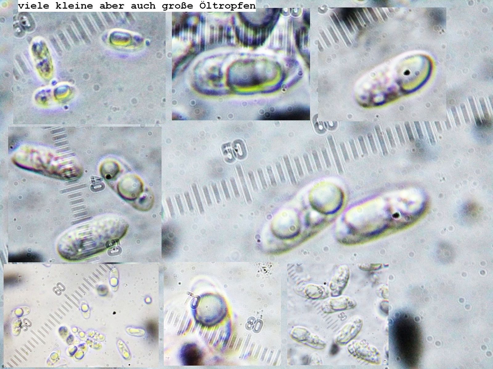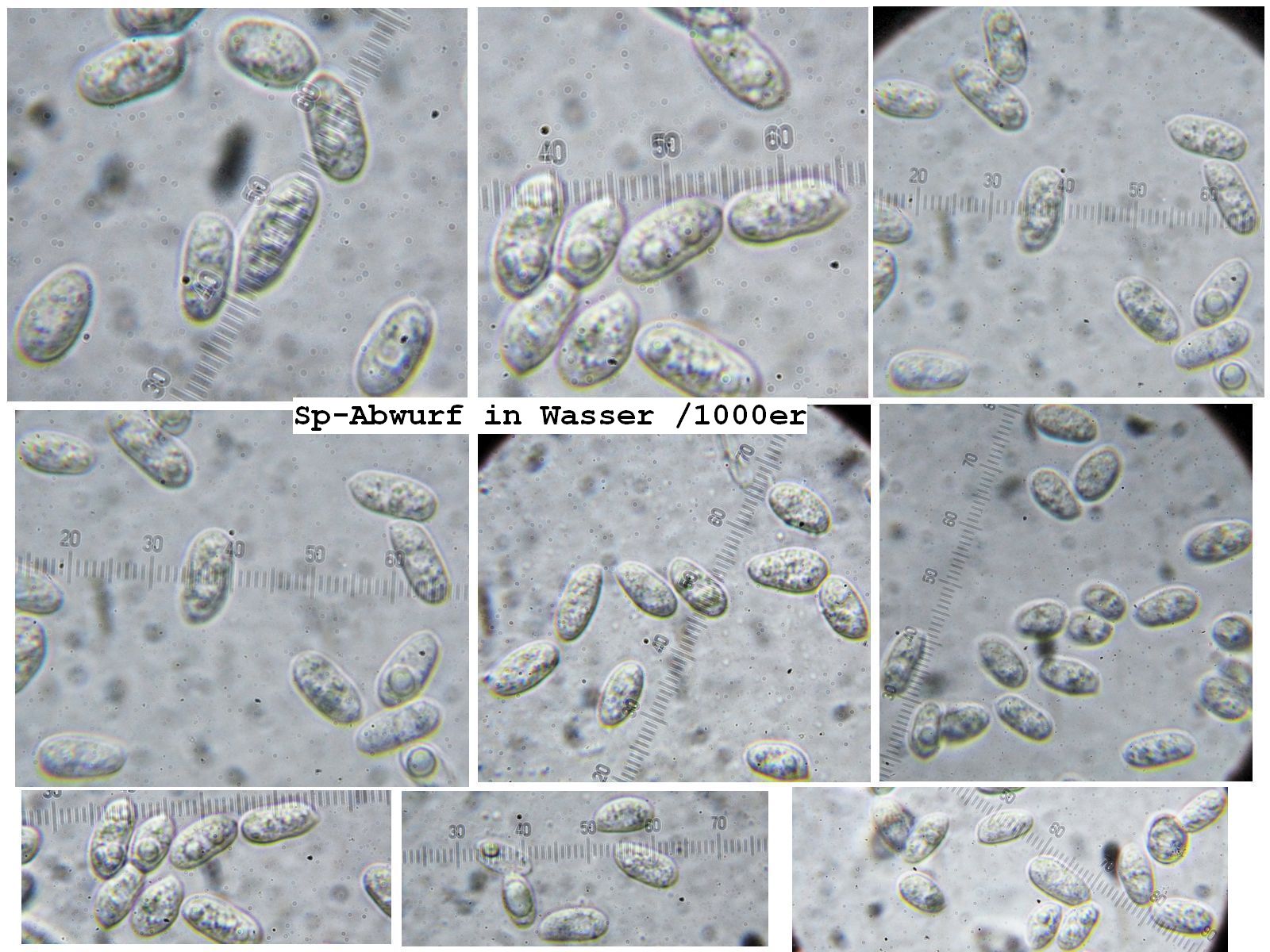 Form variabel, überwiegend elliptisch bis zylindrisch, aber nicht suballantoid gebogen, manche +-konkav mit vielen kleinen und größeren Öltropfen. Ermittlung der Sporengröße durch 3 Messreihen anhand Sp.-Abwurf in Wasser.