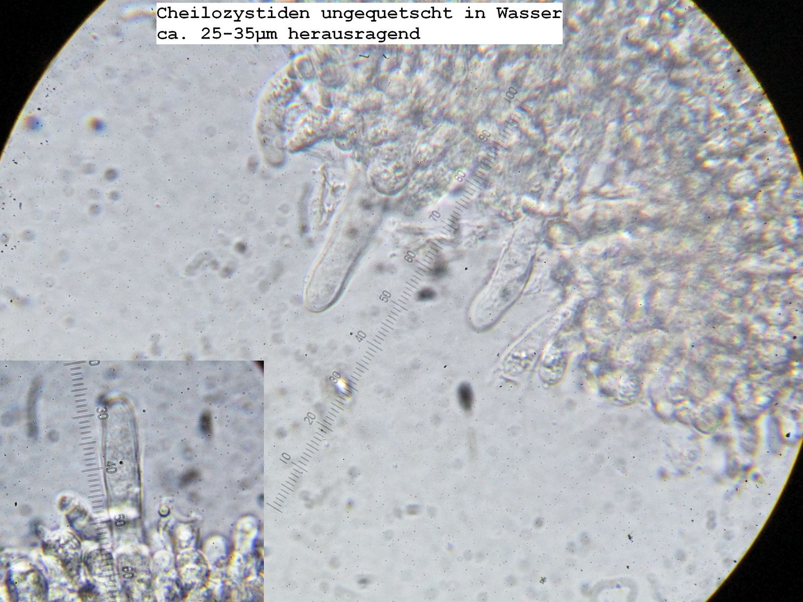 Leptozystiden: (30)50-70(90) x 7-10(11) µm, ca. 20-45 µm herausragend, glatt ohne Inkrustationen, apikal abgerundet, zylindrisch, mittig etwas eingeschnürt, unterhalb mittig manchmal verbreitert, einige verbogen. Apikal manchmal schwach matt lichtbrechend.