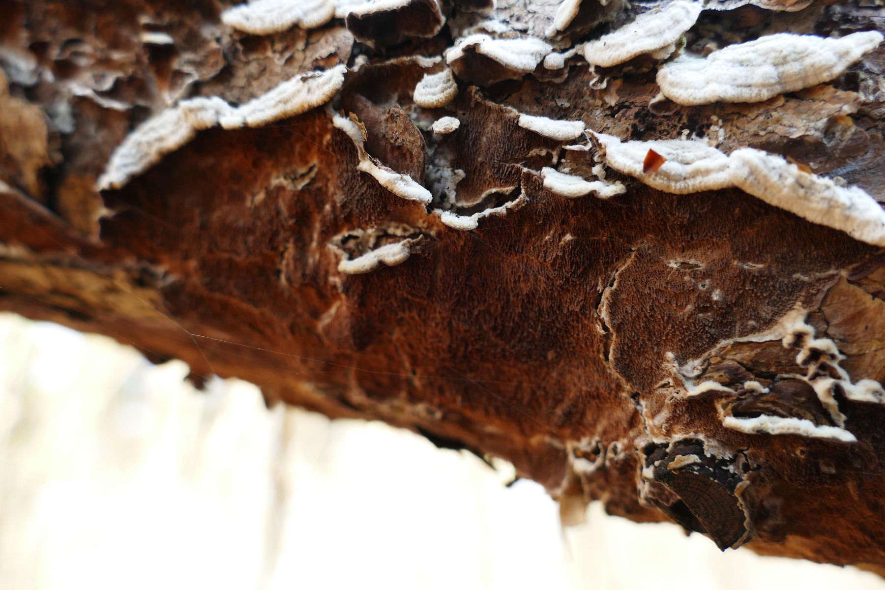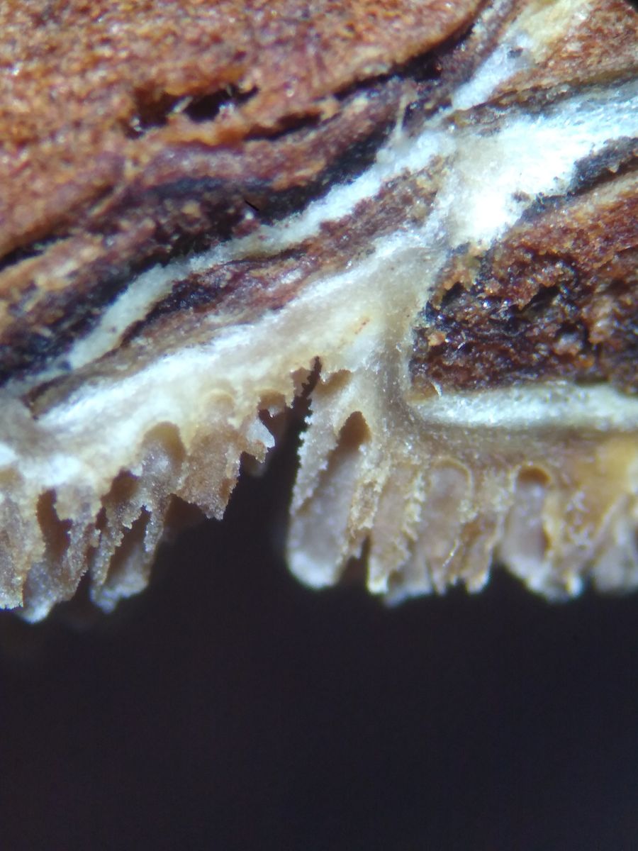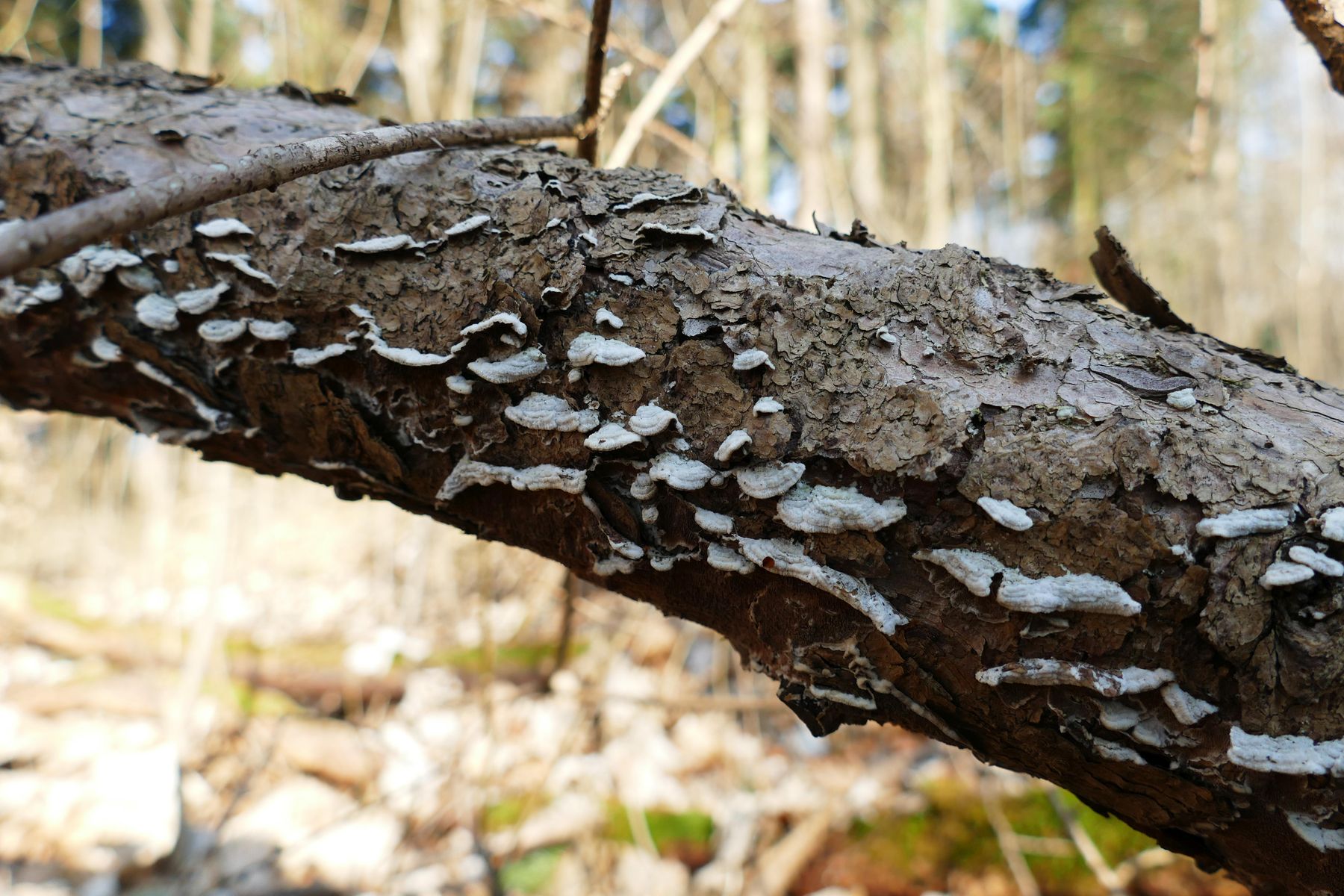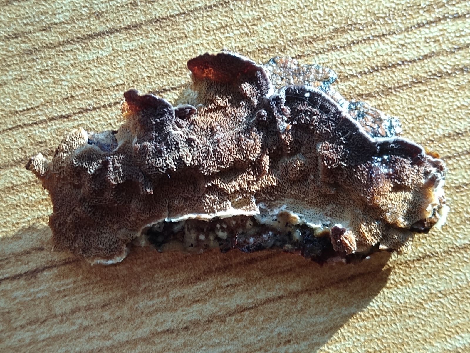 An einem Fichtenast (?), der 0,5-1m über dem Boden lag, waren braune Porlinge mit schmal ausgebildeten, weiß-filzigen Hutoberseiten zu finden.