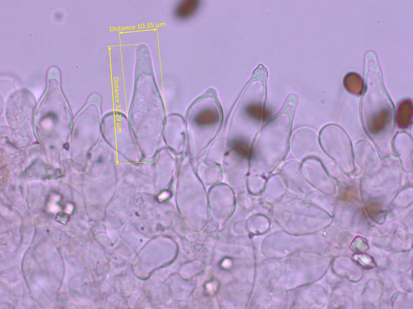 Cheilozystiden (hier in Ammoniak) dominant lageniform, dazwischen auch keulige. Im oberen Teil oft dickwandig. Ohne auffallende Auflagerungen oder Kristalle.