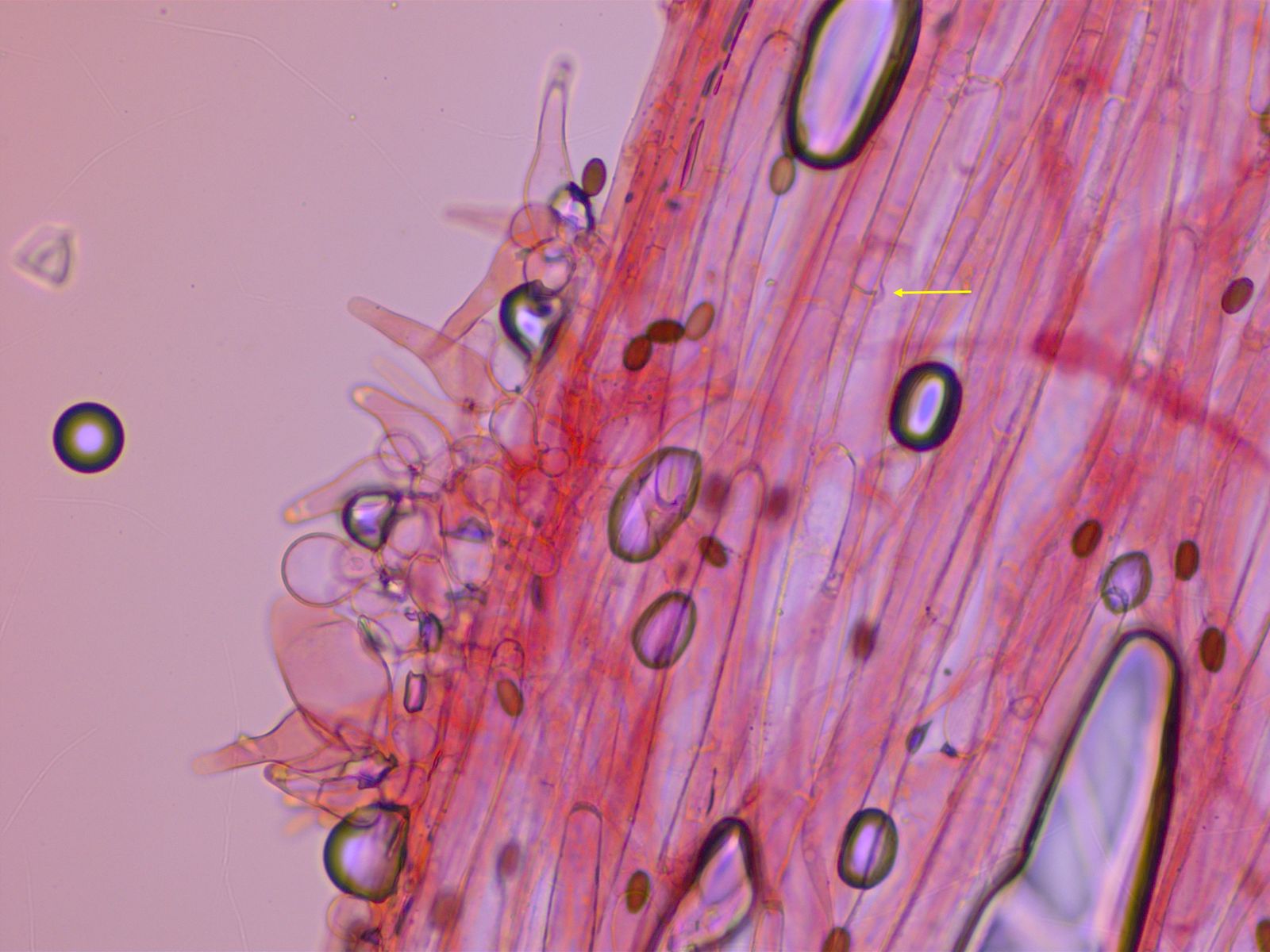 Etwa die Hälfte der Pleurozystiden haben doch deutlich verdickte, in Ammoniak blassgelbe Wände.