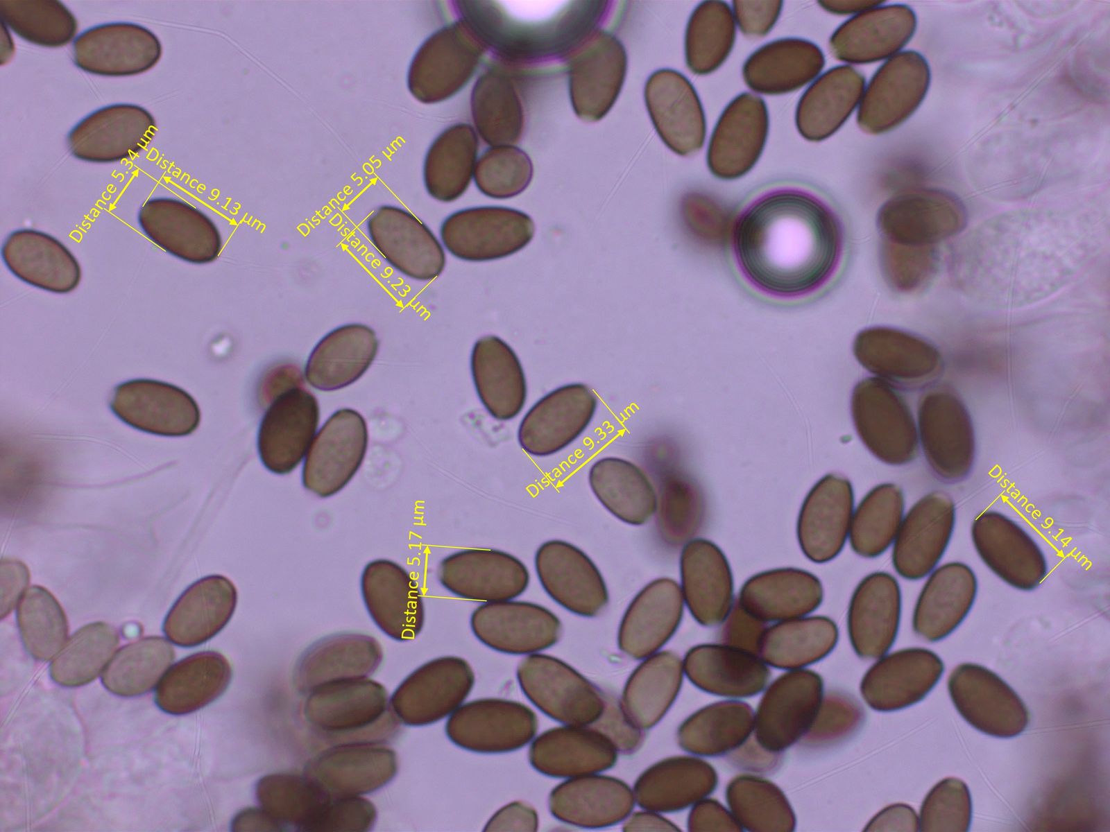 Sporen um 9-9.5 x 5-5.5 µm, mit deutlichem, zentralen Keimporus, sehr regelmässig geformt, glatt.