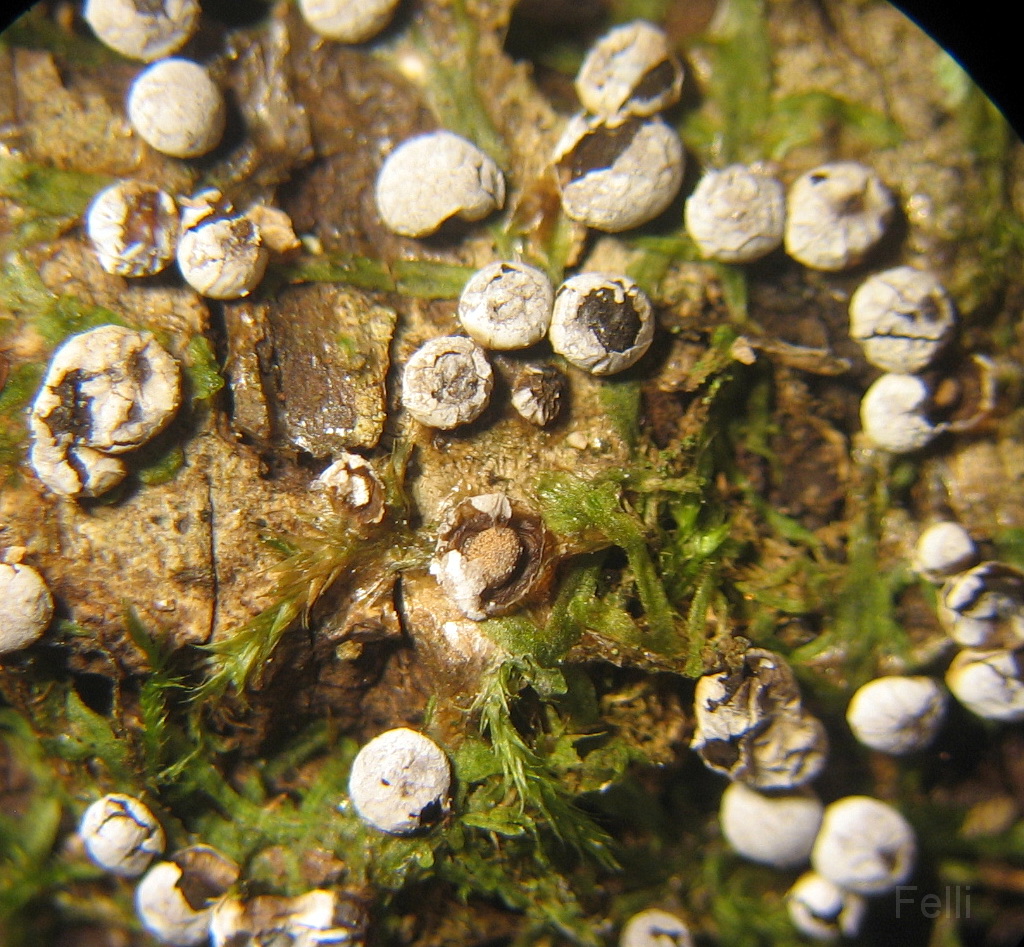 Mit der starken Kalkperidie, den stiellosen Fruchtkörpern,
