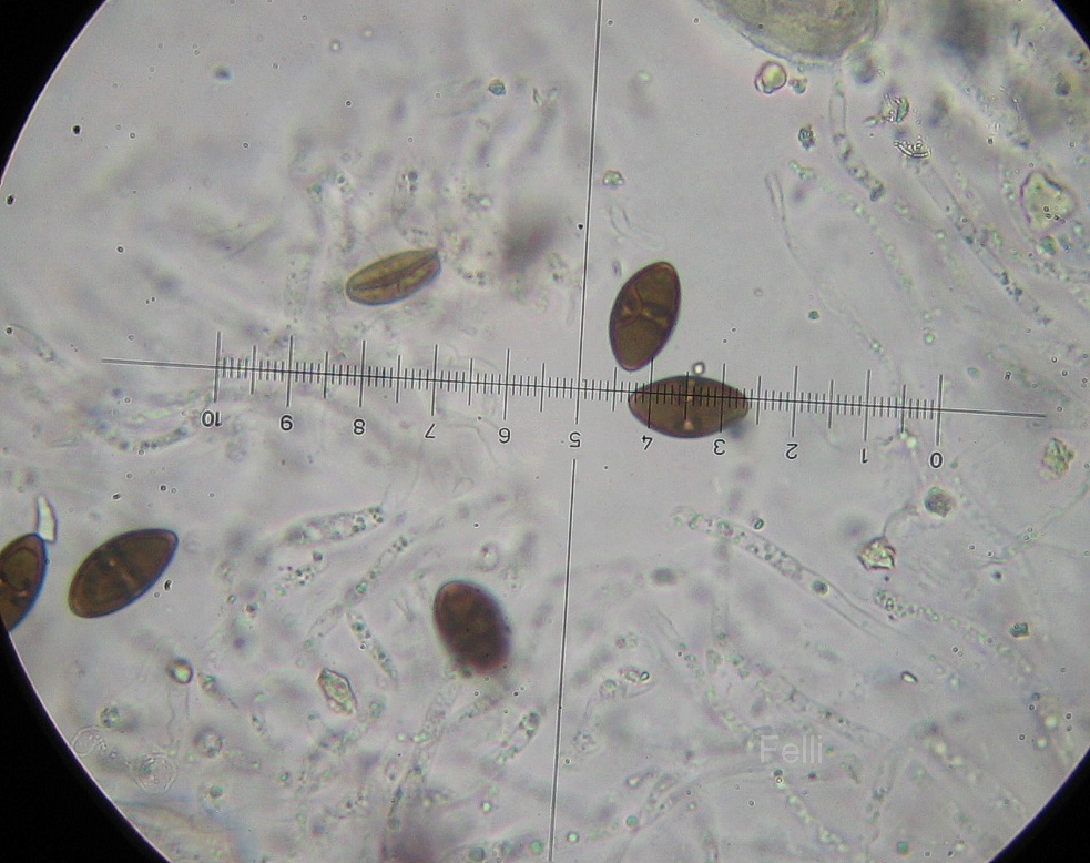 Die Sporen sind bis zu 20µ x 6,5µ, leicht weißwurstförmig